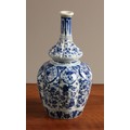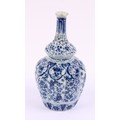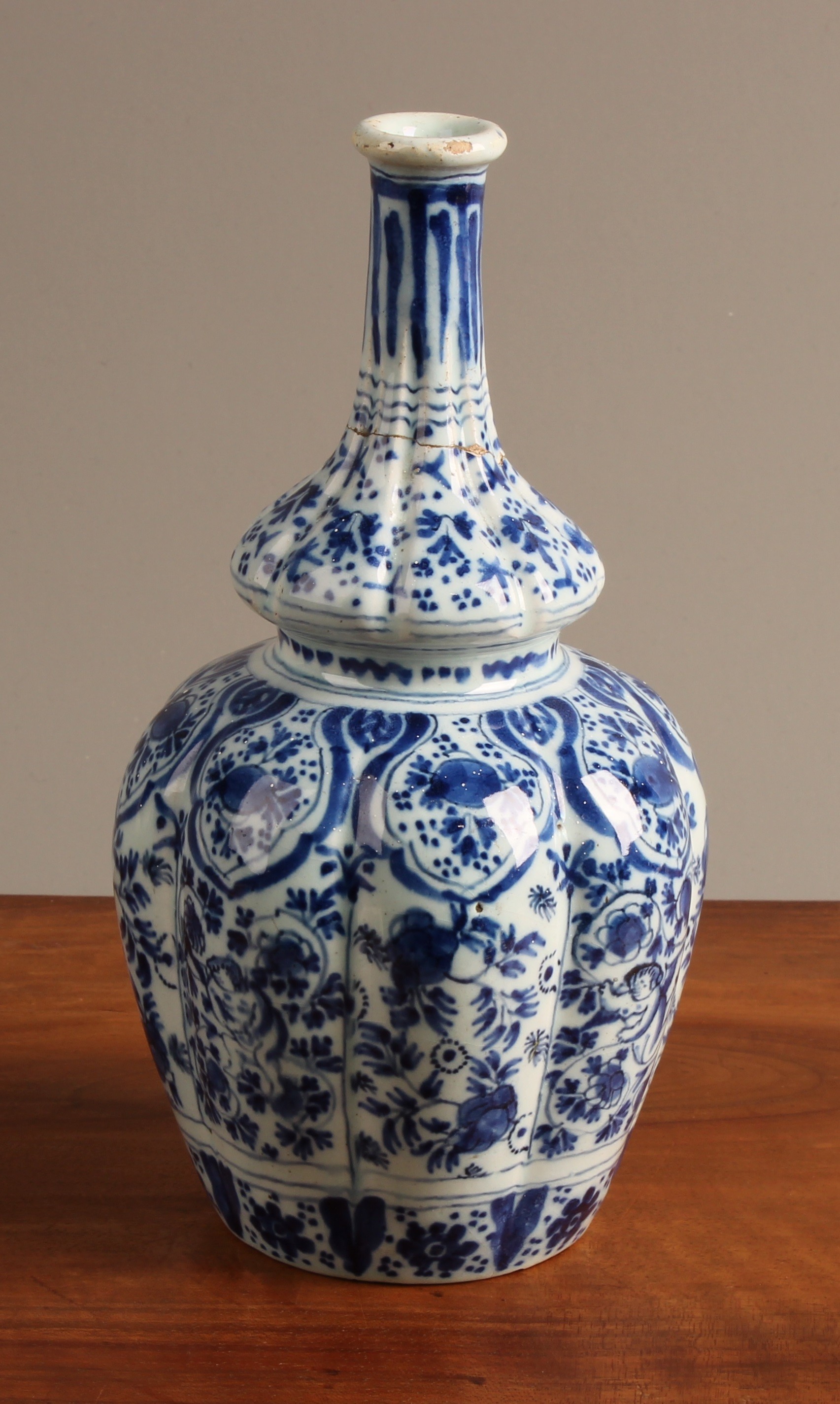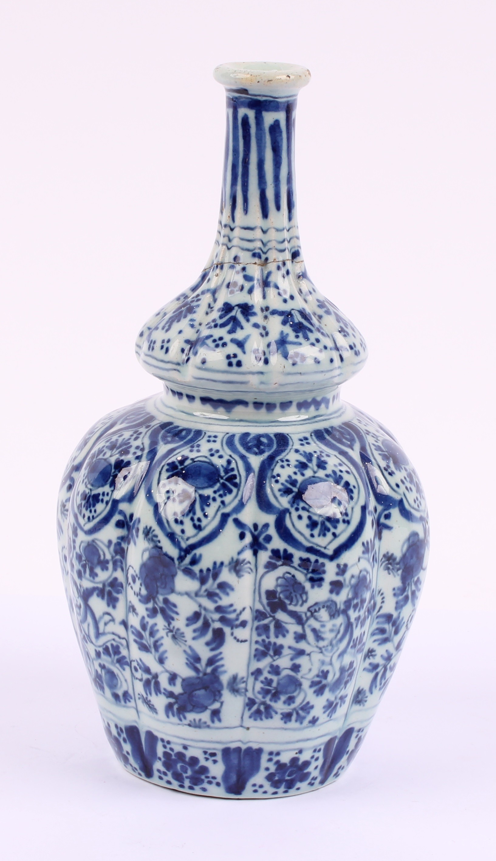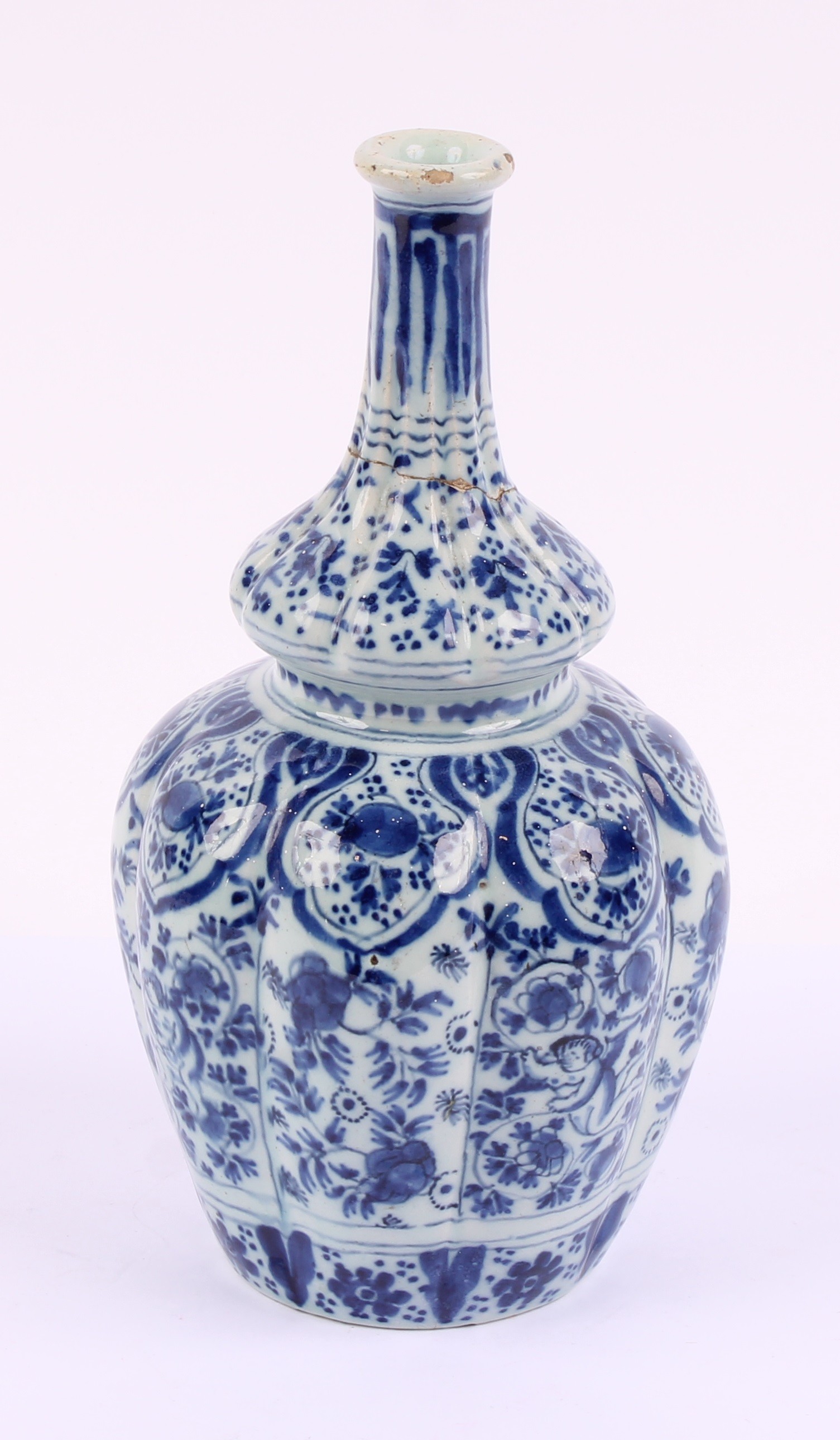 An 18th century Delft lobed bottle vase, of double gourd form, decorated in underglaze blue in the Chinese taste, with putti amongst flowers and scrolling foliage, 19.5cm high, c.1760