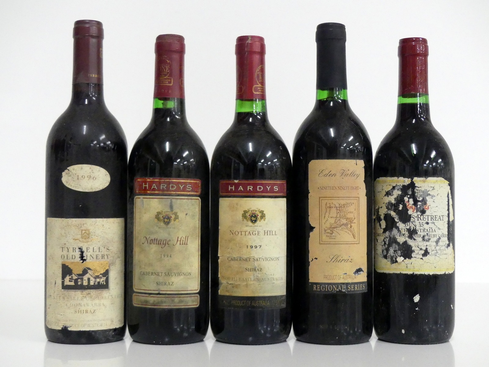 1 bt Tyrells Old Winery Shiraz 1996 Hunter Valley/McLaren Vale i.n, bs, vsl cdl 1 bt Hardys Nottage Hill Cabernet Sauvignon Shiraz 1994 S E Australia i.n, bs 1 bt Hardys Nottage Hill Cabernet Sauvignon Shiraz 1997 S E Australia i.n, bs 1 bt Regional Series Shiraz 1998 Eden Valley i.n, bs, vsl cdl 1 bt Penfolds Bin 35 Rawson's Retreat Cabernet Sauvignon Ruby Cabernet 1995 hf/i.n, sl bs, cdl dis Above 5 bottles