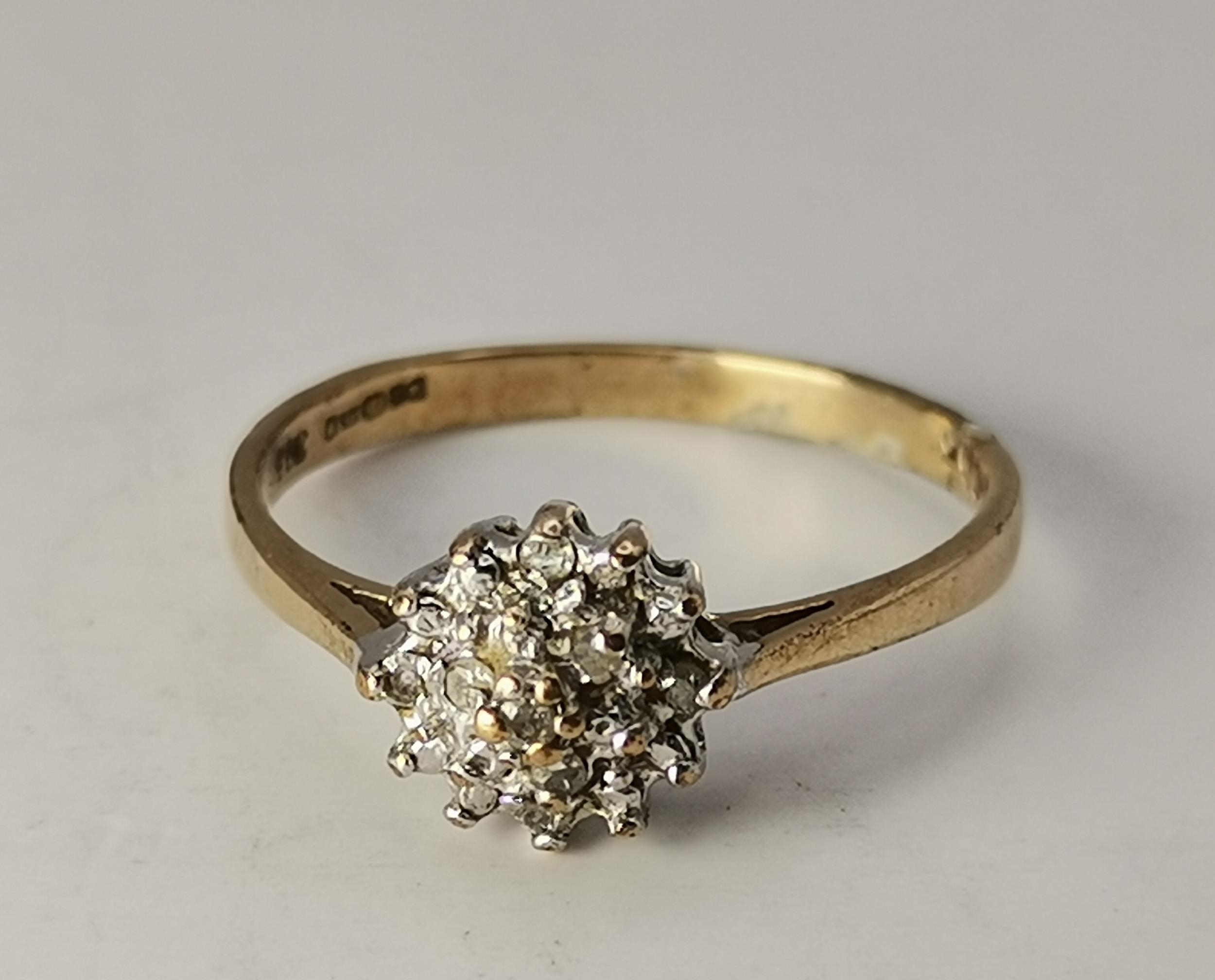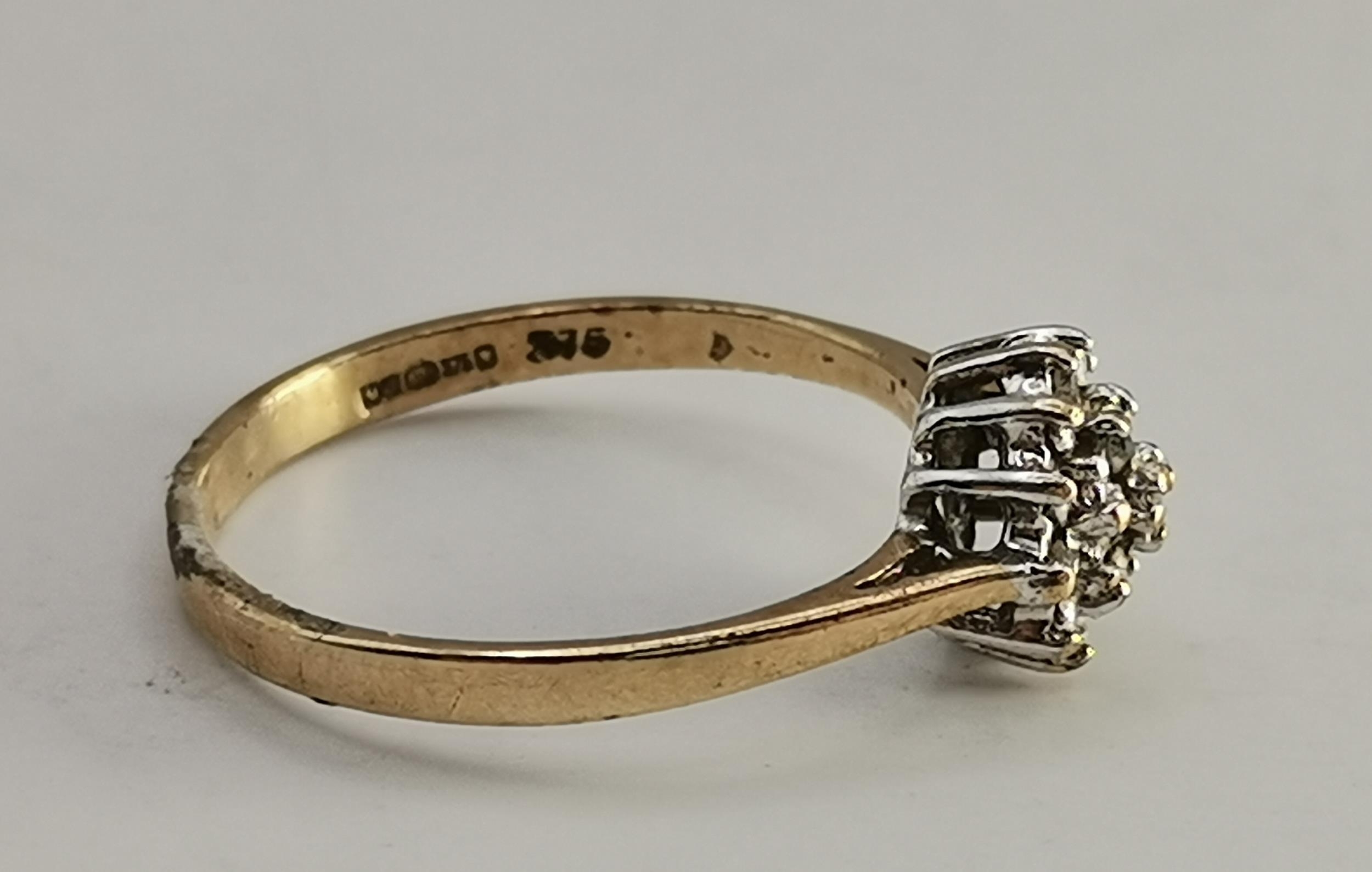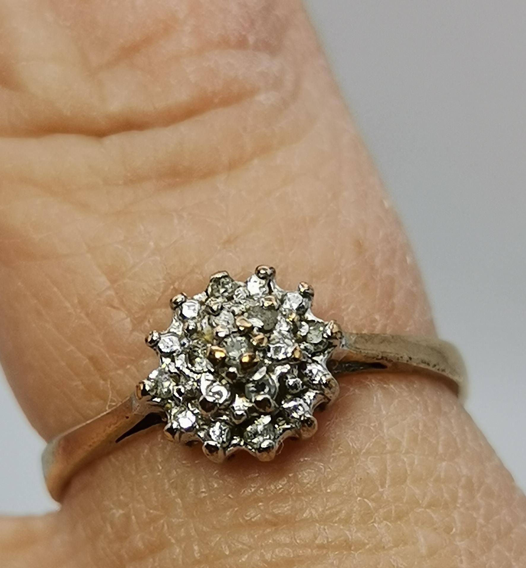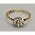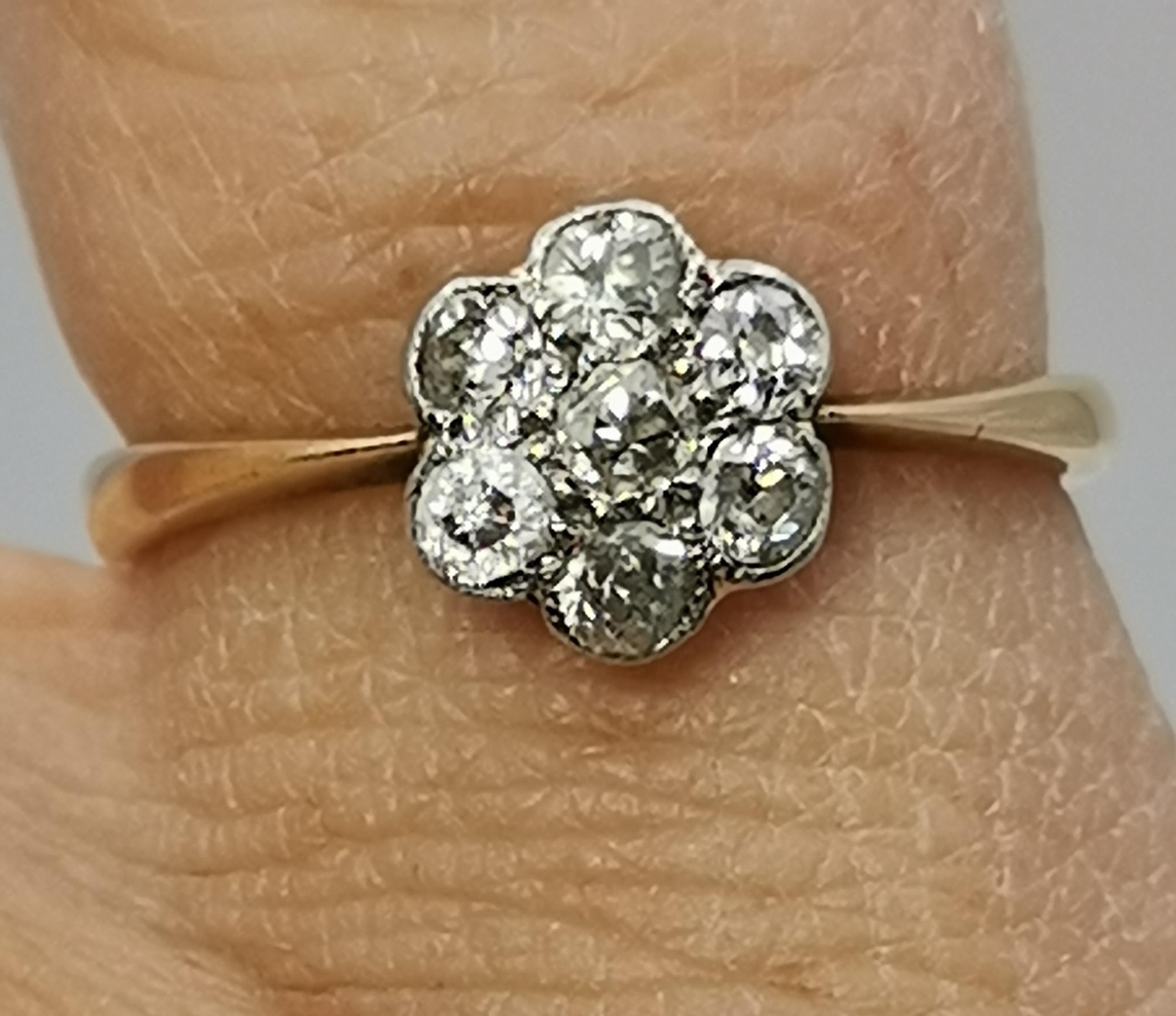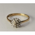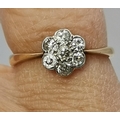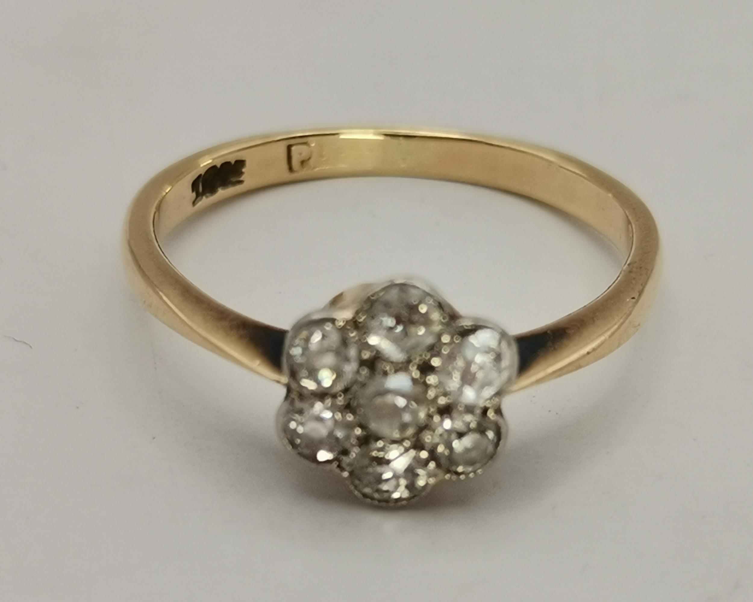 An 18 carat gold and platinum white stone cluster ring, the seven round stones set as a flowerhead, stamped 18CT PLAT to shank, ring size L1/2; together with a 9 carat gold diamond cluster ring, hallmarked 375, stamped DIA 005, ring size L; and a 9 carat gold solitaire ring, set with a white stone chip to a hexagonal mount, hallmarked 375, ring size O1/2. (3) 4.7g gross
