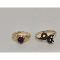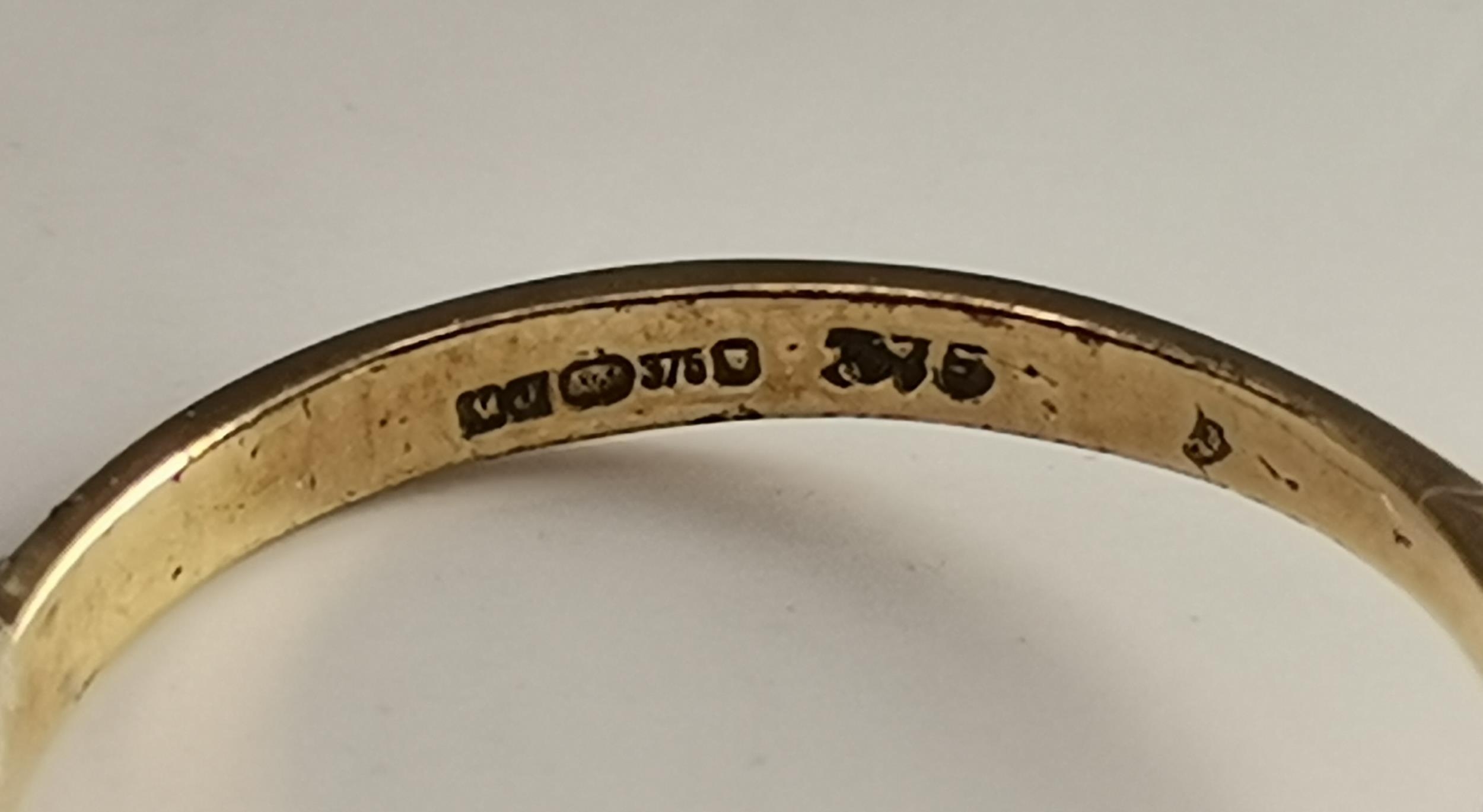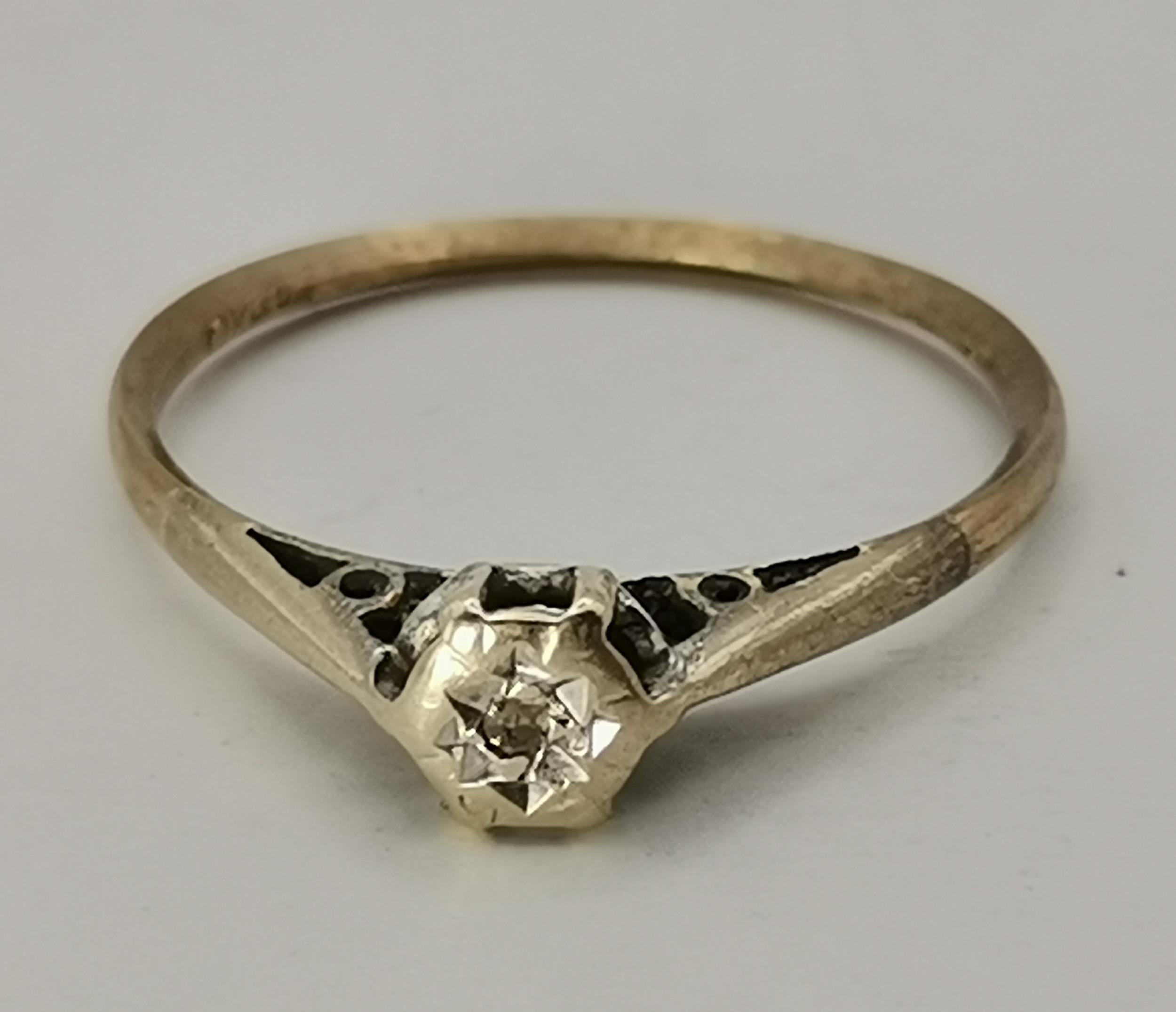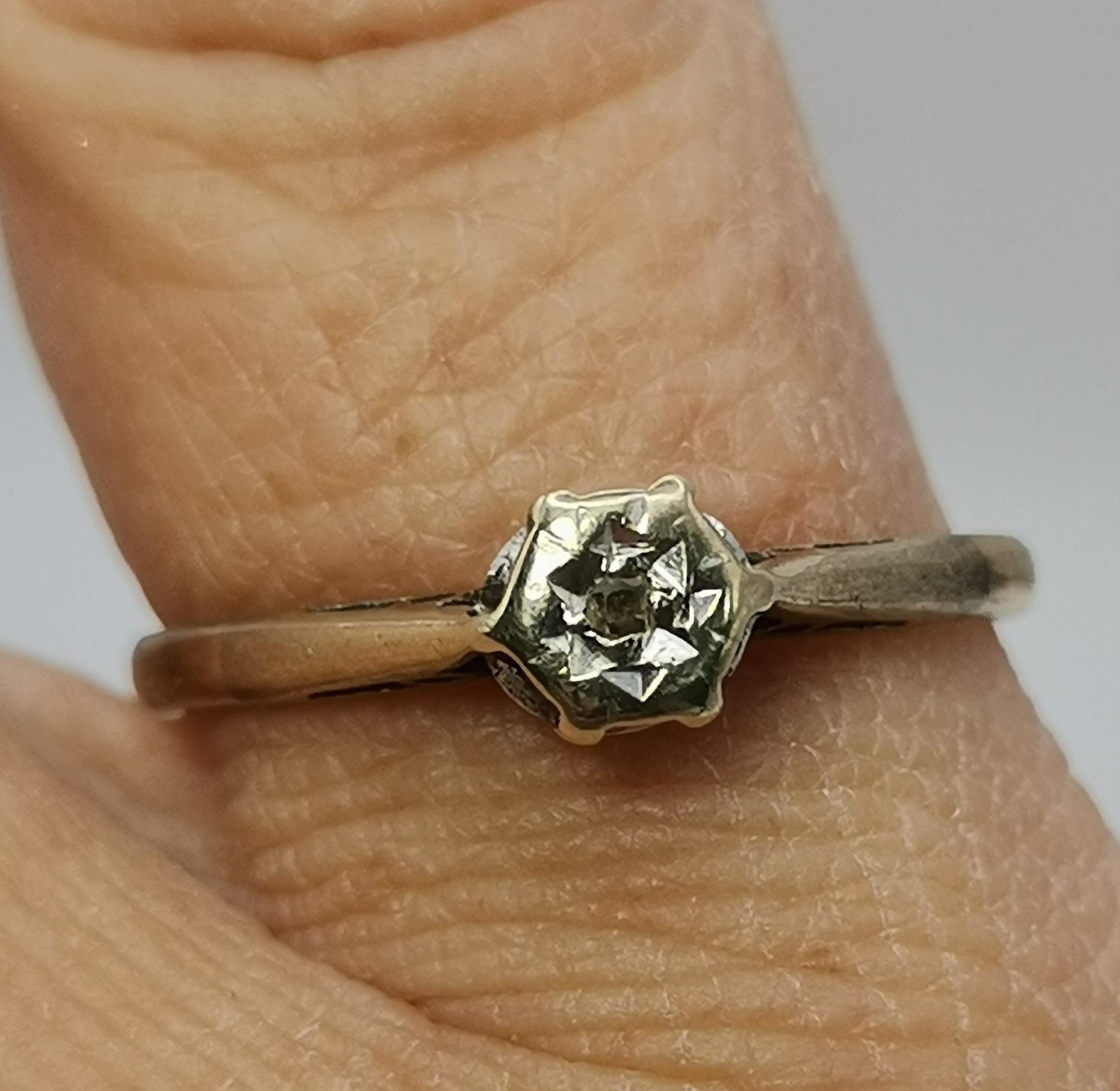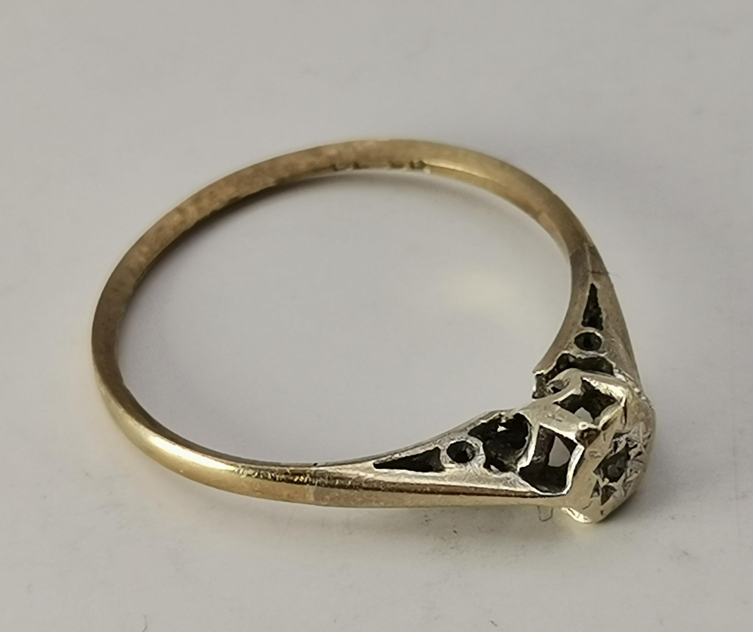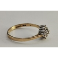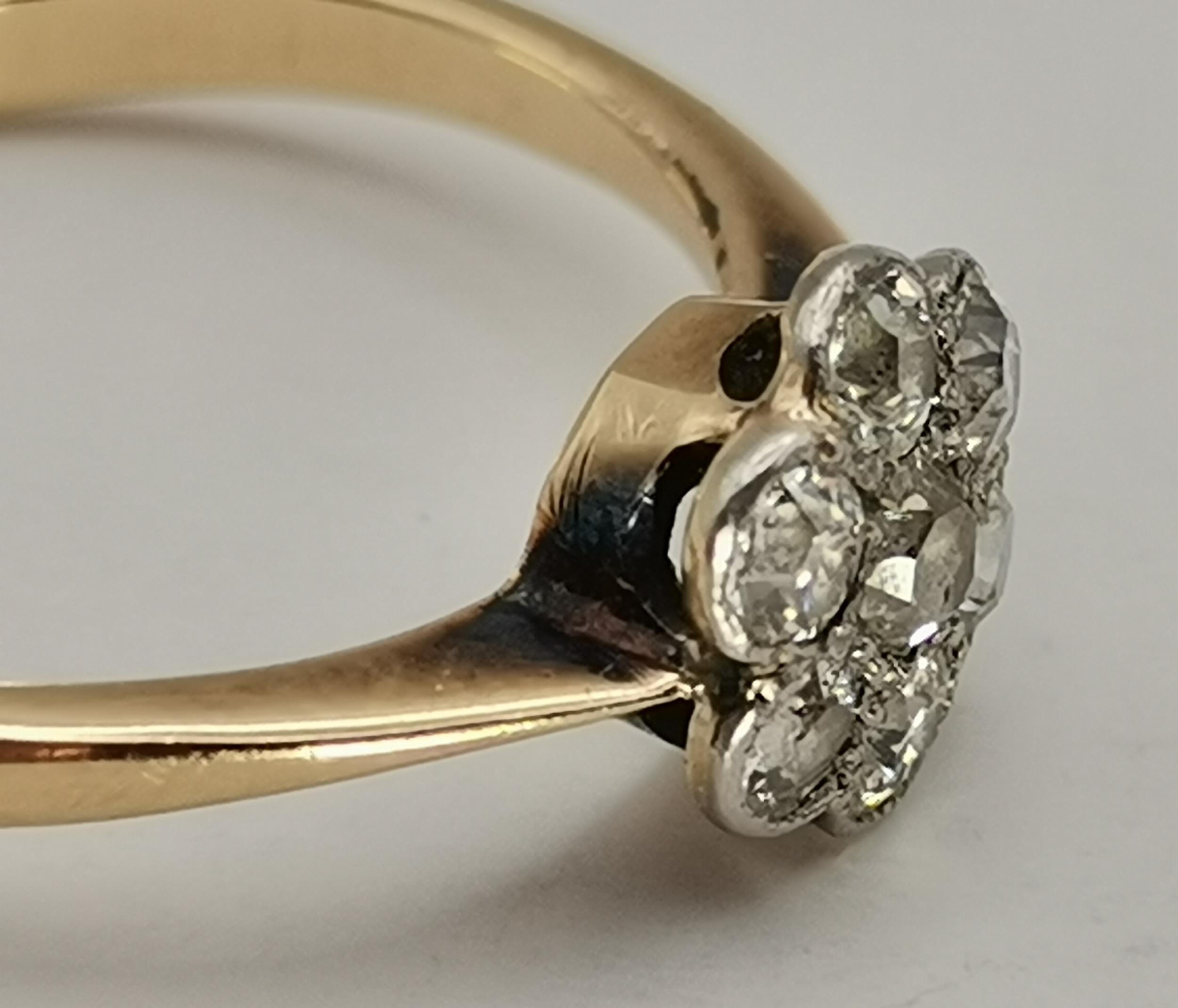 An 18 carat gold and platinum white stone cluster ring, the seven round stones set as a flowerhead, stamped 18CT PLAT to shank, ring size L1/2; together with a 9 carat gold diamond cluster ring, hallmarked 375, stamped DIA 005, ring size L; and a 9 carat gold solitaire ring, set with a white stone chip to a hexagonal mount, hallmarked 375, ring size O1/2. (3) 4.7g gross