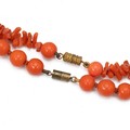 Two vintage coral necklaces, a knotted beaded necklace, L48cm, and a L38cm necklace.