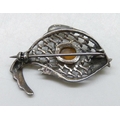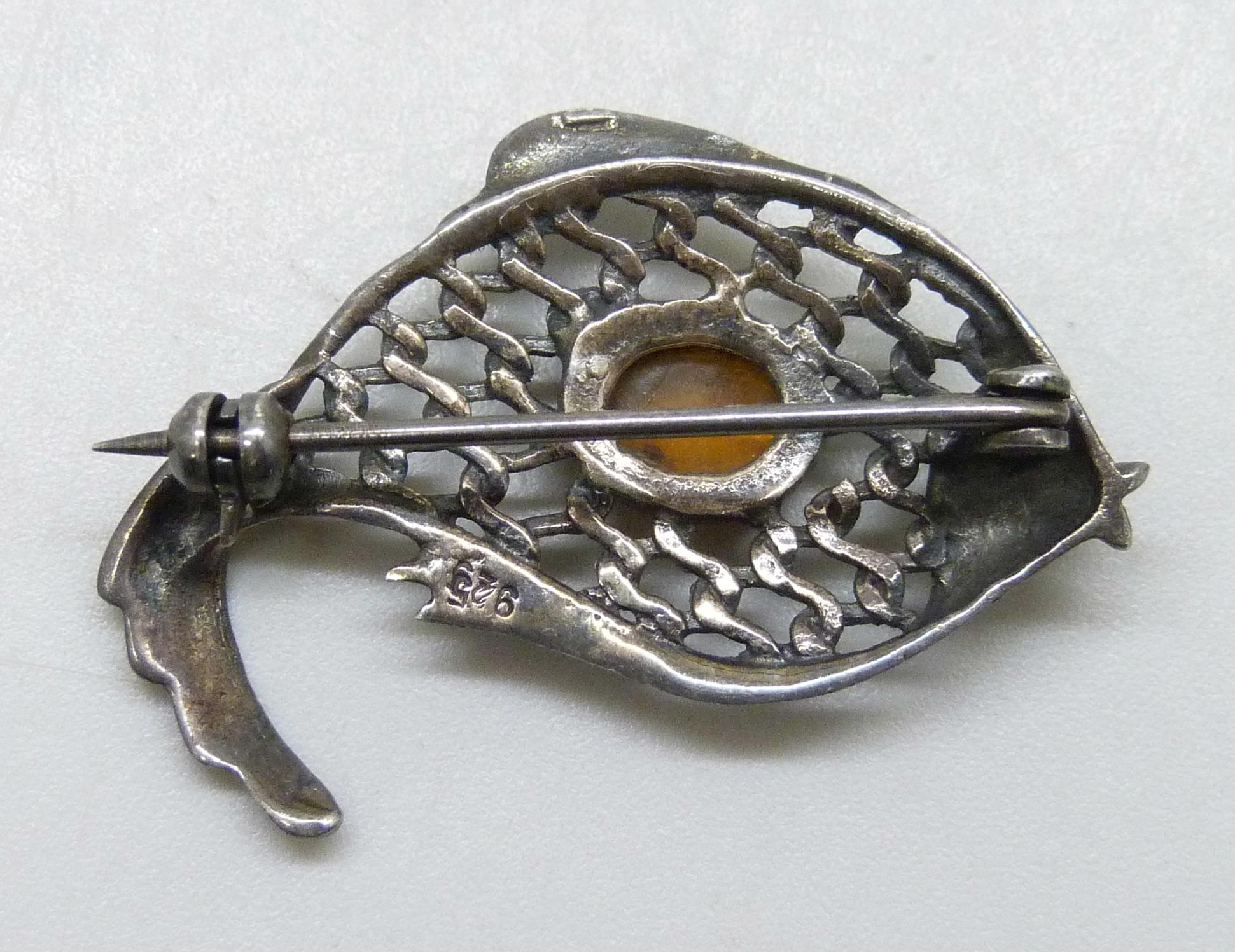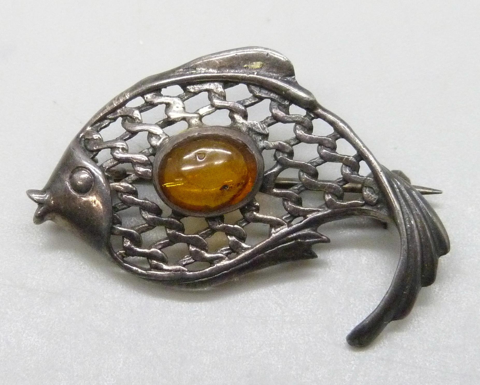 A silver brooch in the form of a fish, set with Baltic amber, 3.6cm