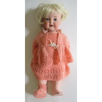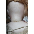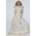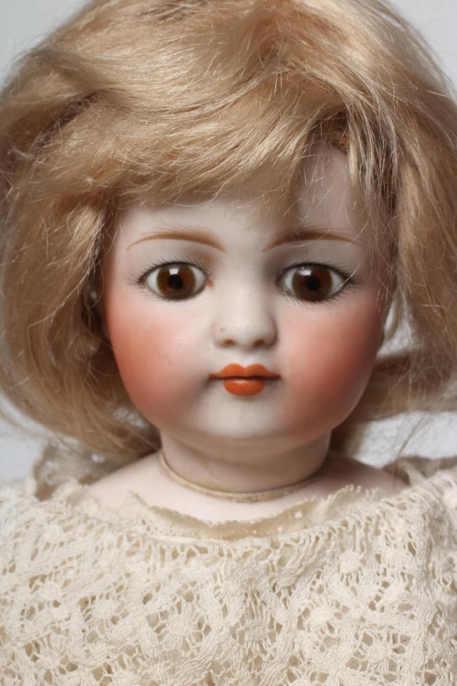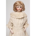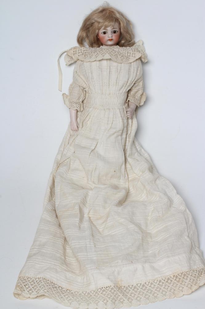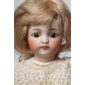 A Simon & Halbig bisque socket head doll, with brown glass fixed eyes, closed mouth, pierced ears, blond wig, bisque shoulders and lower arms, kid body, lace dress, pantaloons and leather shoes numbered 8, head marked 905, 16" long (Est. plus 21% premium inc. VAT)