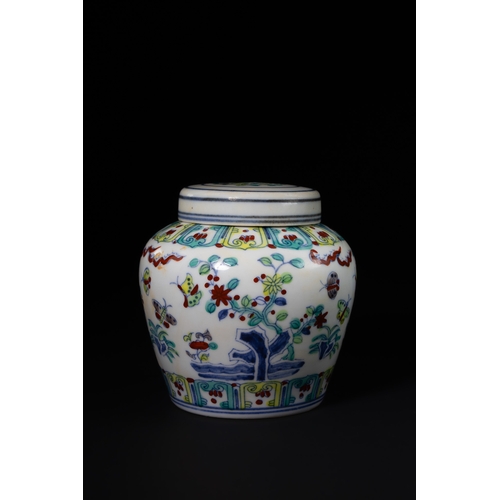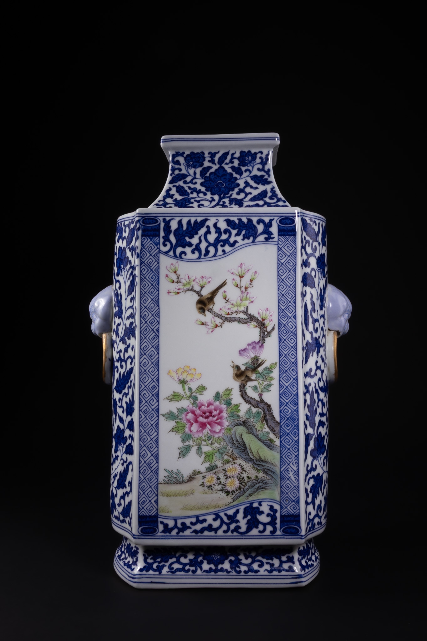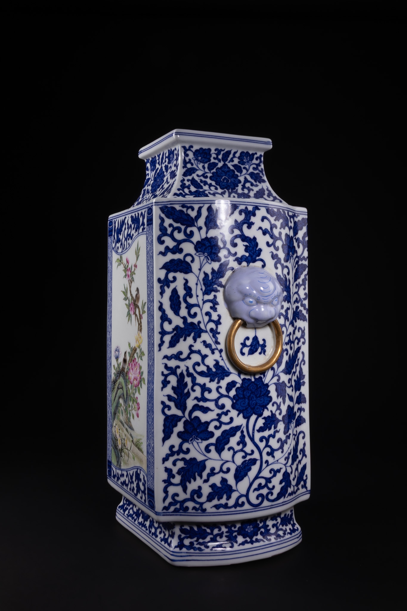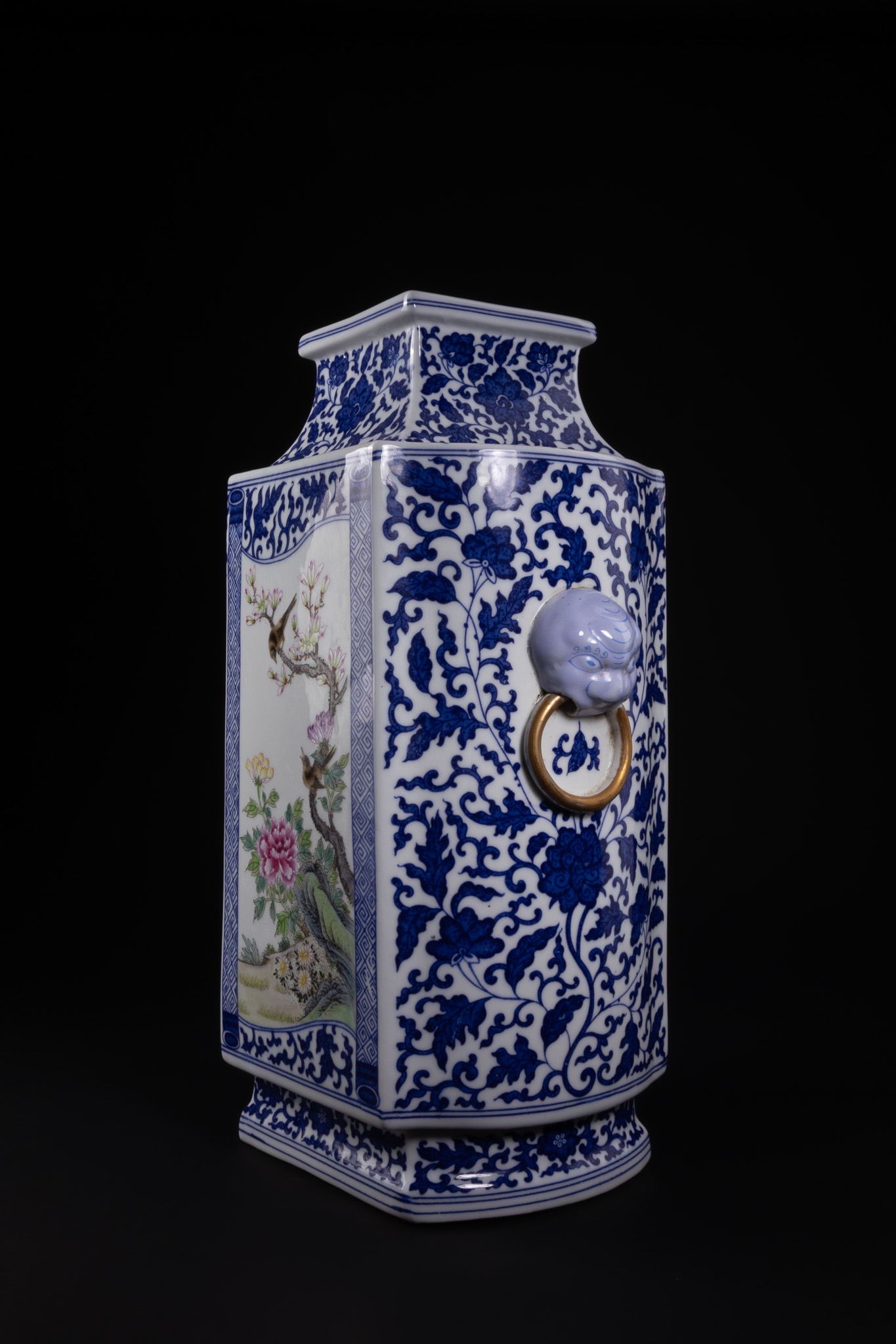 The vase is of hexagonal form, rising from a stepped foot to a gently flared neck, each facet decorated in underglaze blue scrolling floral designs. Two opposing panels are finely painted in polychrome enamels with birds perched among flowering branches and foliage, framed by geometric borders. The remaining facets are filled with dense scrolling floral motifs in cobalt blue. Each side is fitted with moulded lion-mask handles holding gilt metal rings.