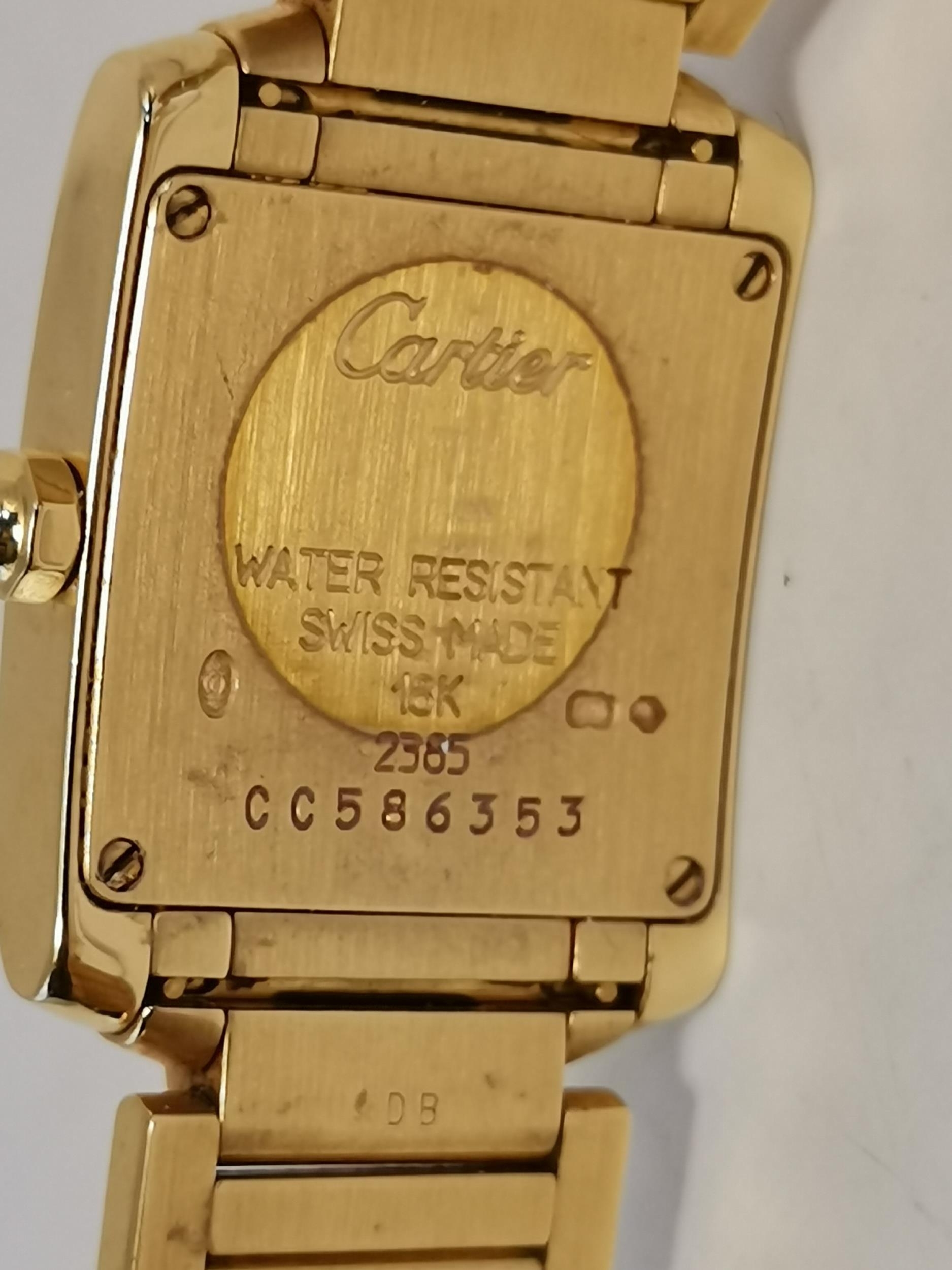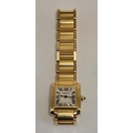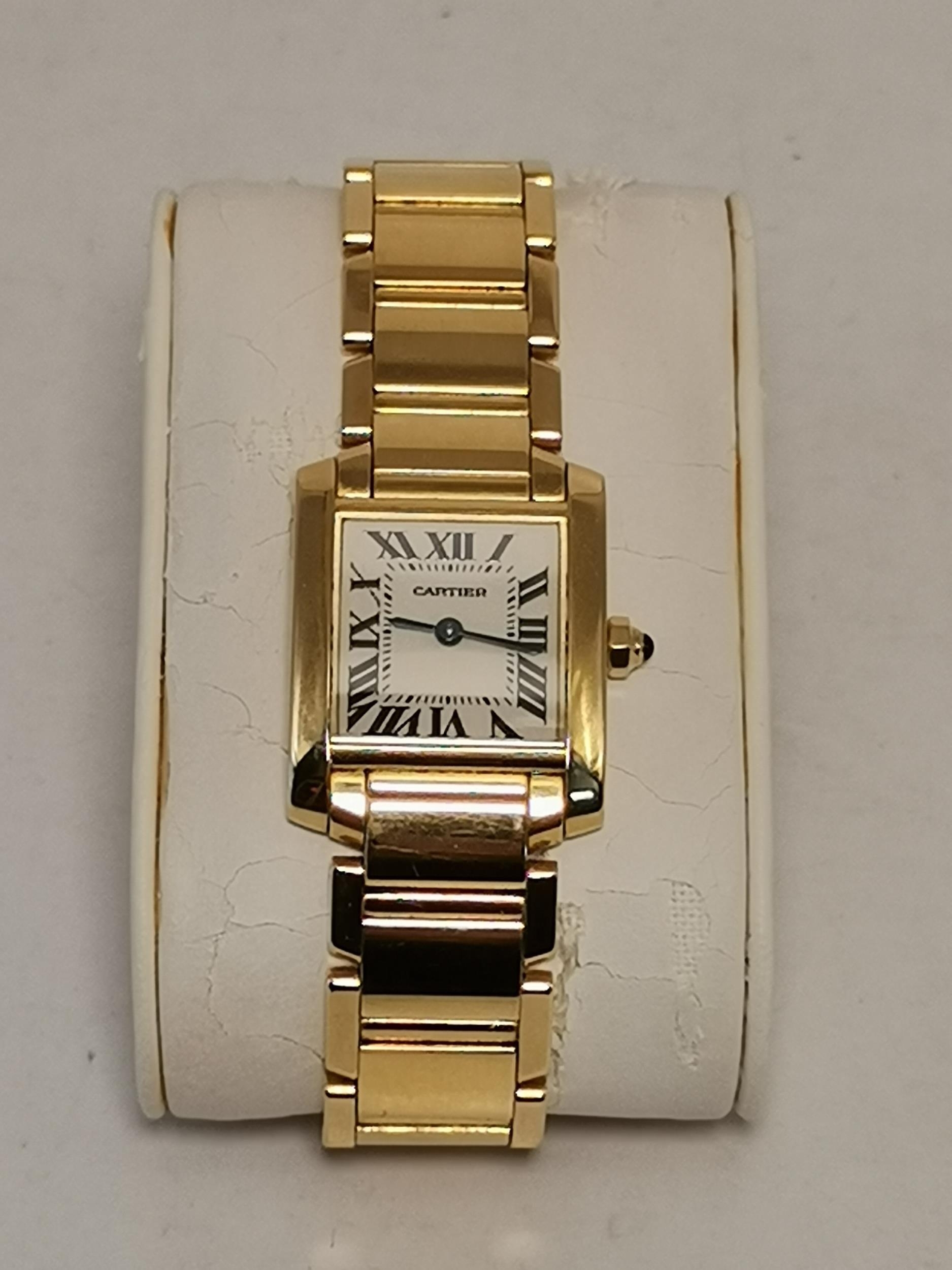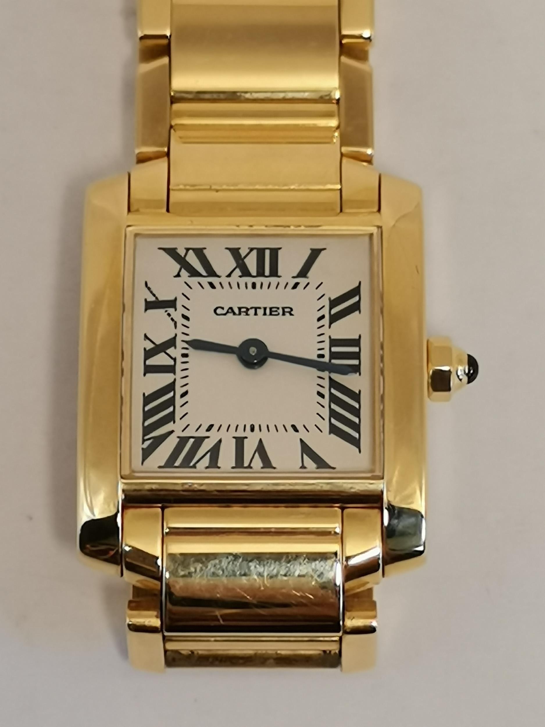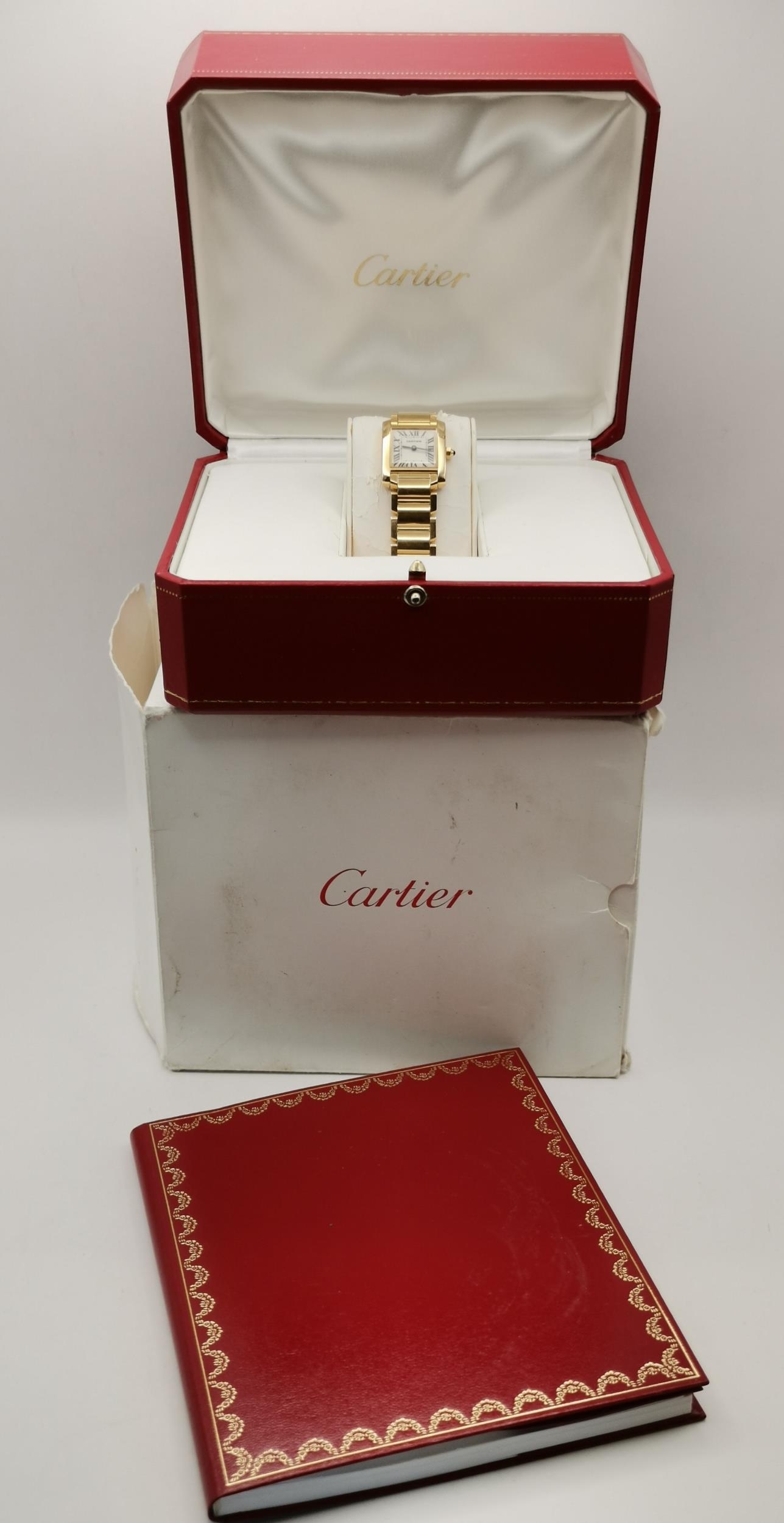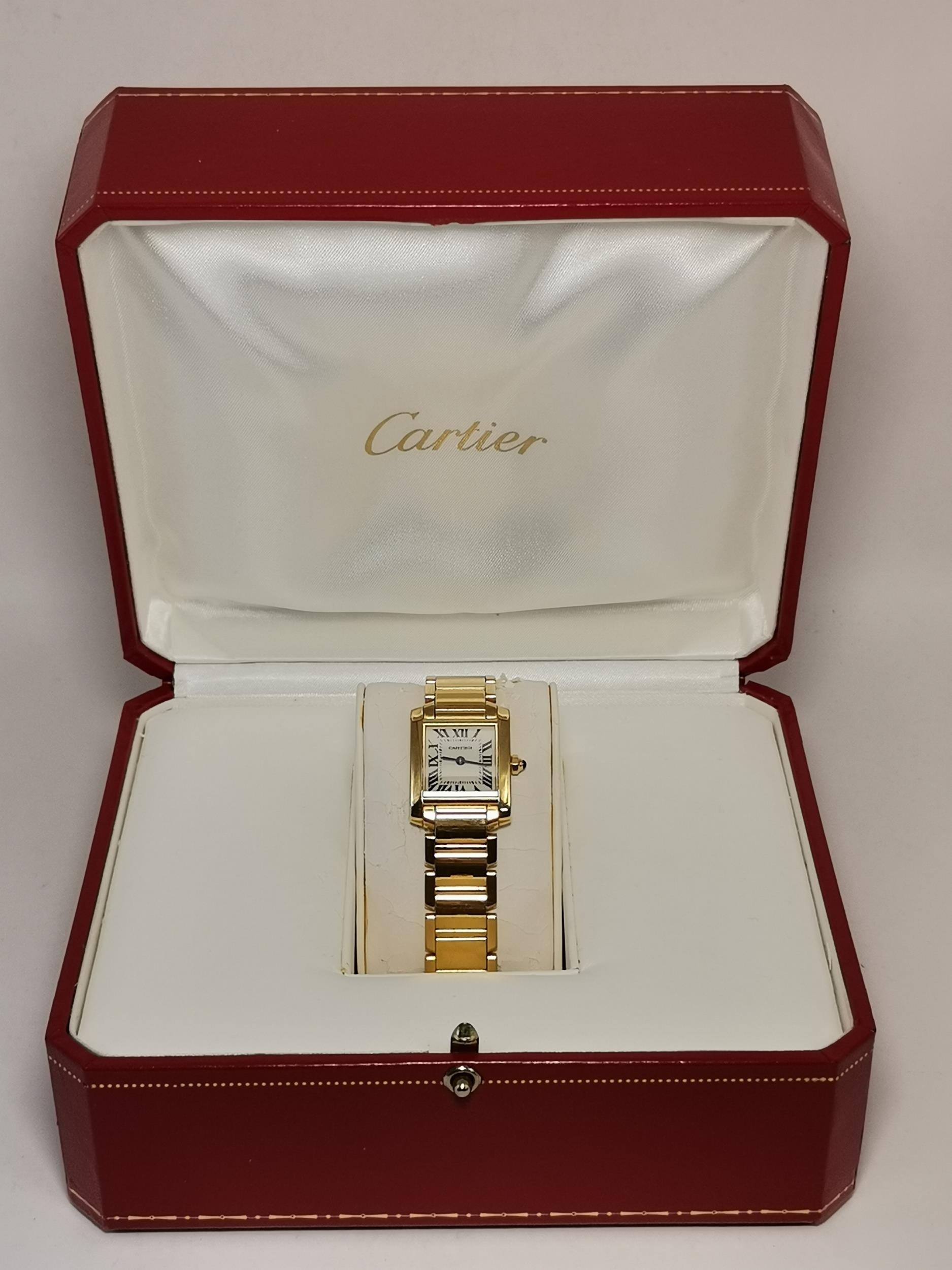 Cartier: A lady's 18 carat gold Tank Française bracelet wristwatch, ref. 2385, the ivory dial signed Cartier, with black Roman numerals and blued steel hands, blue cabochon-set crown, the square case-back with a screw to each corner, signed Cartier and numbered CC586353, with full hallmarks, the original 18 carat gold strap with dual-deployant clasp signed and variously marked with full hallmarks, 750 and 18K, dial 15mm by 14mm, case 20mm wide, 83.6g gross, in original red leather box and outer card box, with information booklet in red leather sleeve, International Certificate of Guarantee, and Replacement Value Certificate from Goldsmiths dated 22/12/2002.