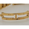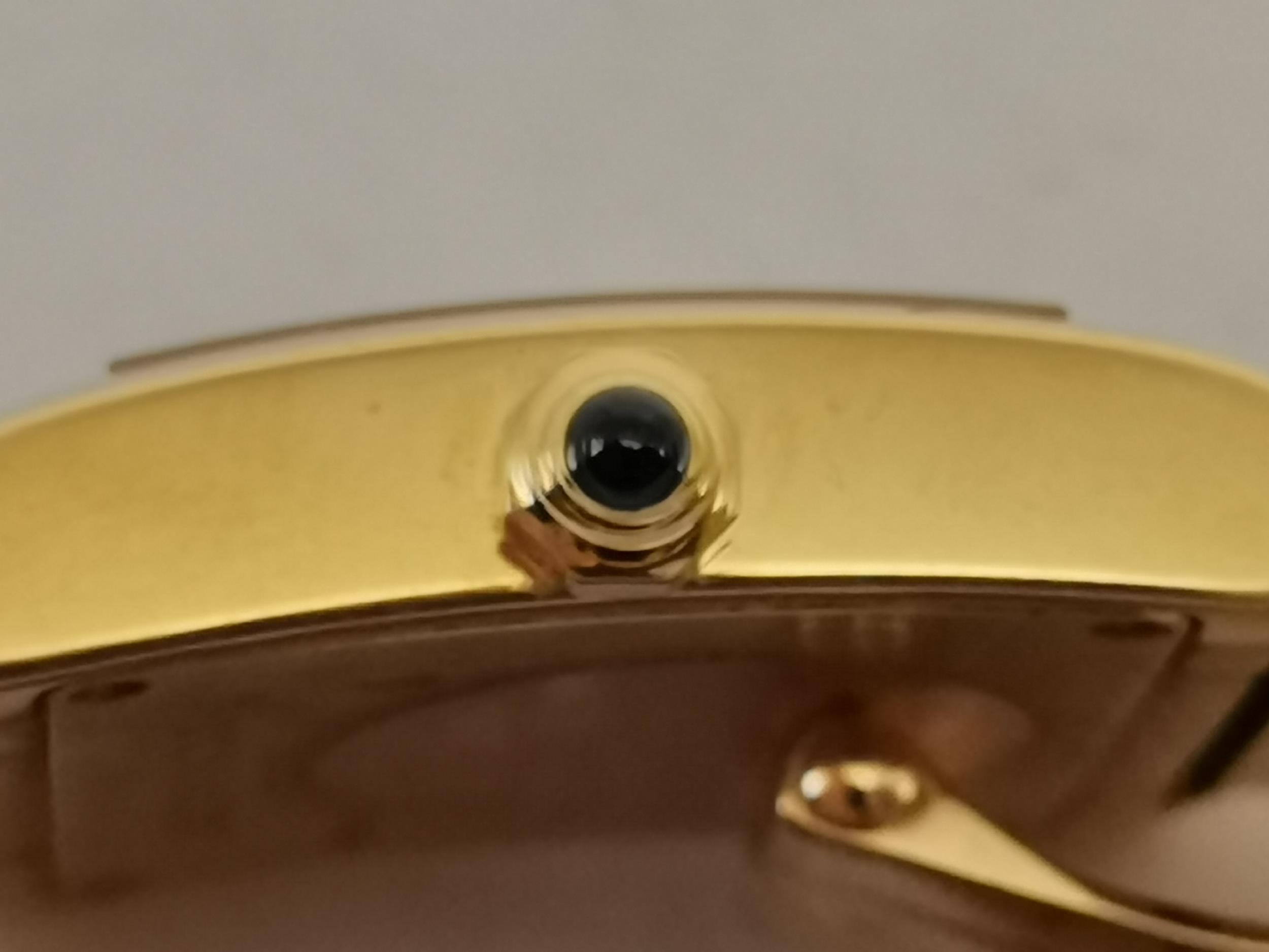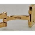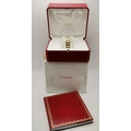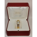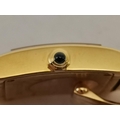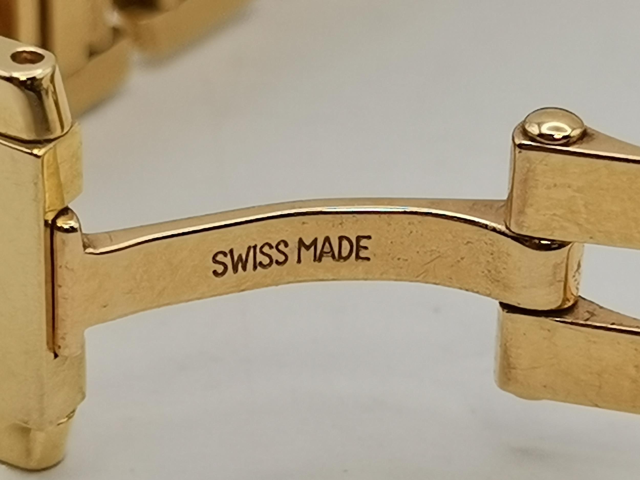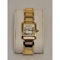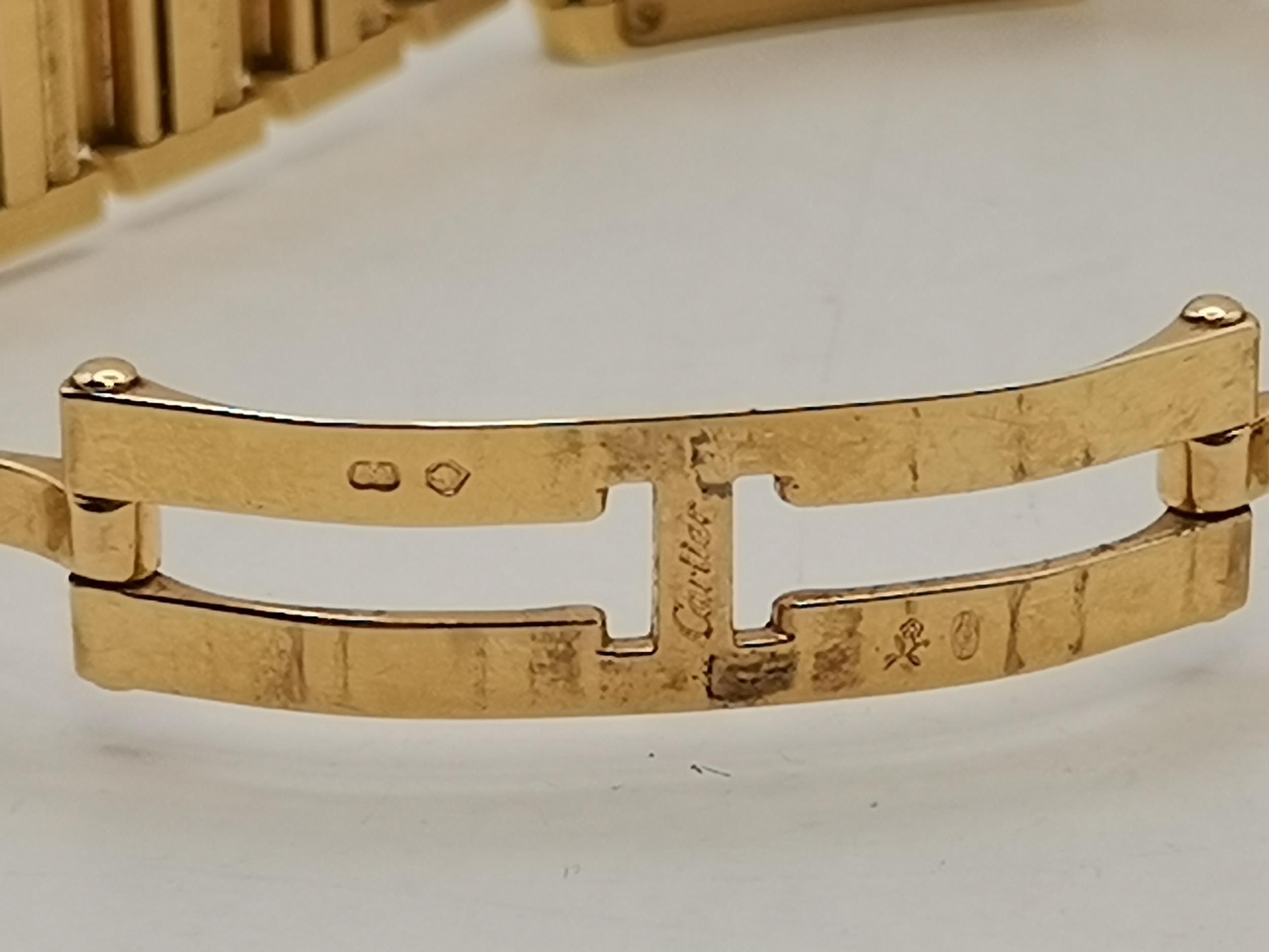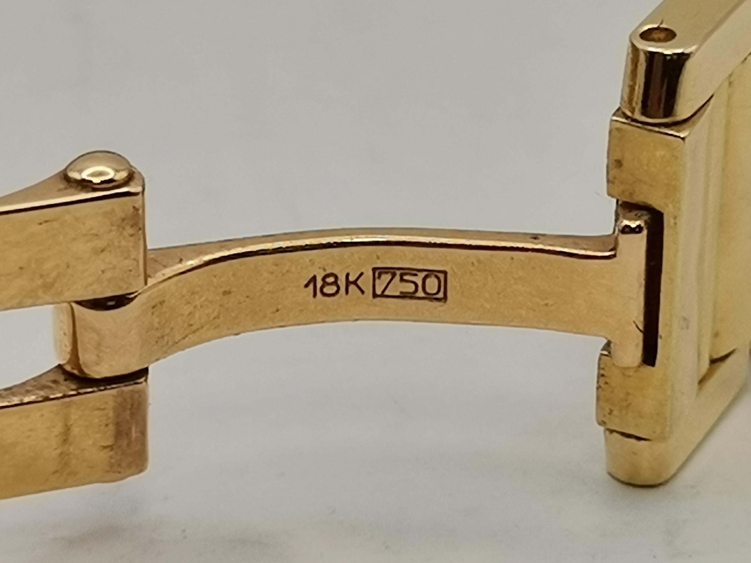 Cartier: A lady's 18 carat gold Tank Française bracelet wristwatch, ref. 2385, the ivory dial signed Cartier, with black Roman numerals and blued steel hands, blue cabochon-set crown, the square case-back with a screw to each corner, signed Cartier and numbered CC586353, with full hallmarks, the original 18 carat gold strap with dual-deployant clasp signed and variously marked with full hallmarks, 750 and 18K, dial 15mm by 14mm, case 20mm wide, 83.6g gross, in original red leather box and outer card box, with information booklet in red leather sleeve, International Certificate of Guarantee, and Replacement Value Certificate from Goldsmiths dated 22/12/2002.