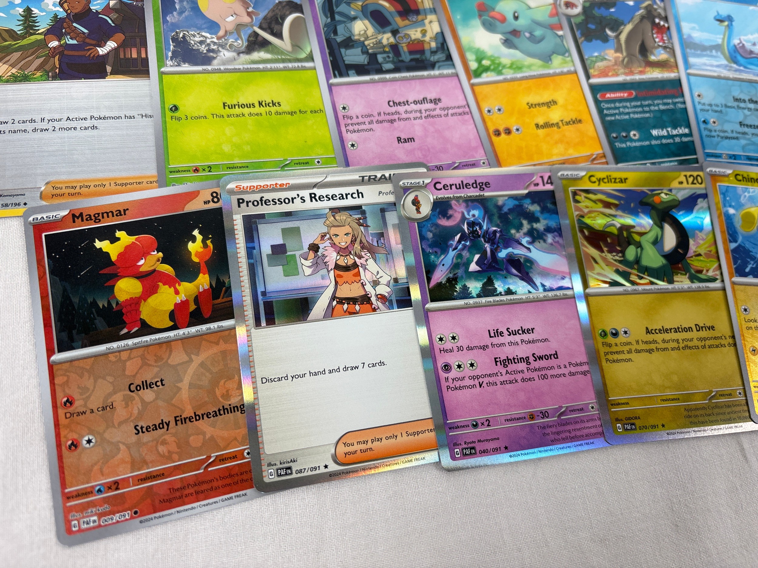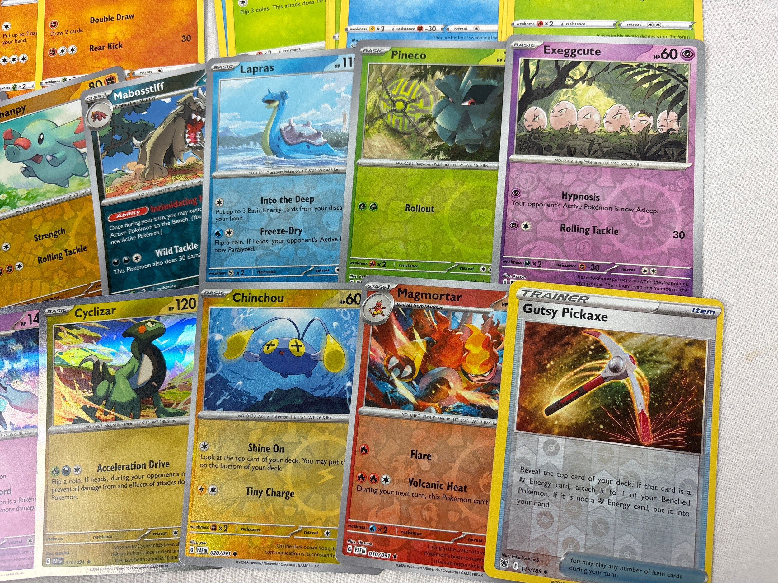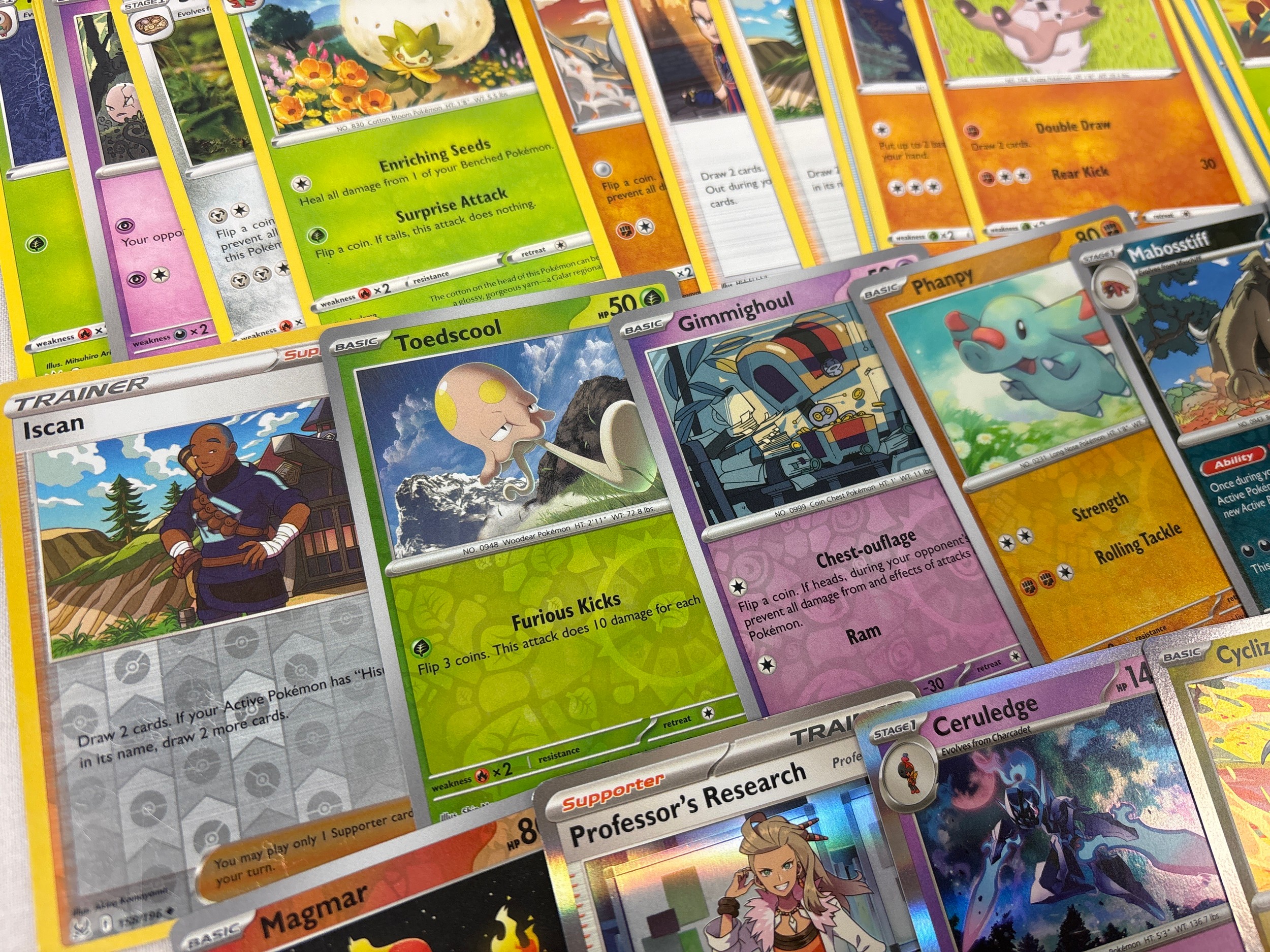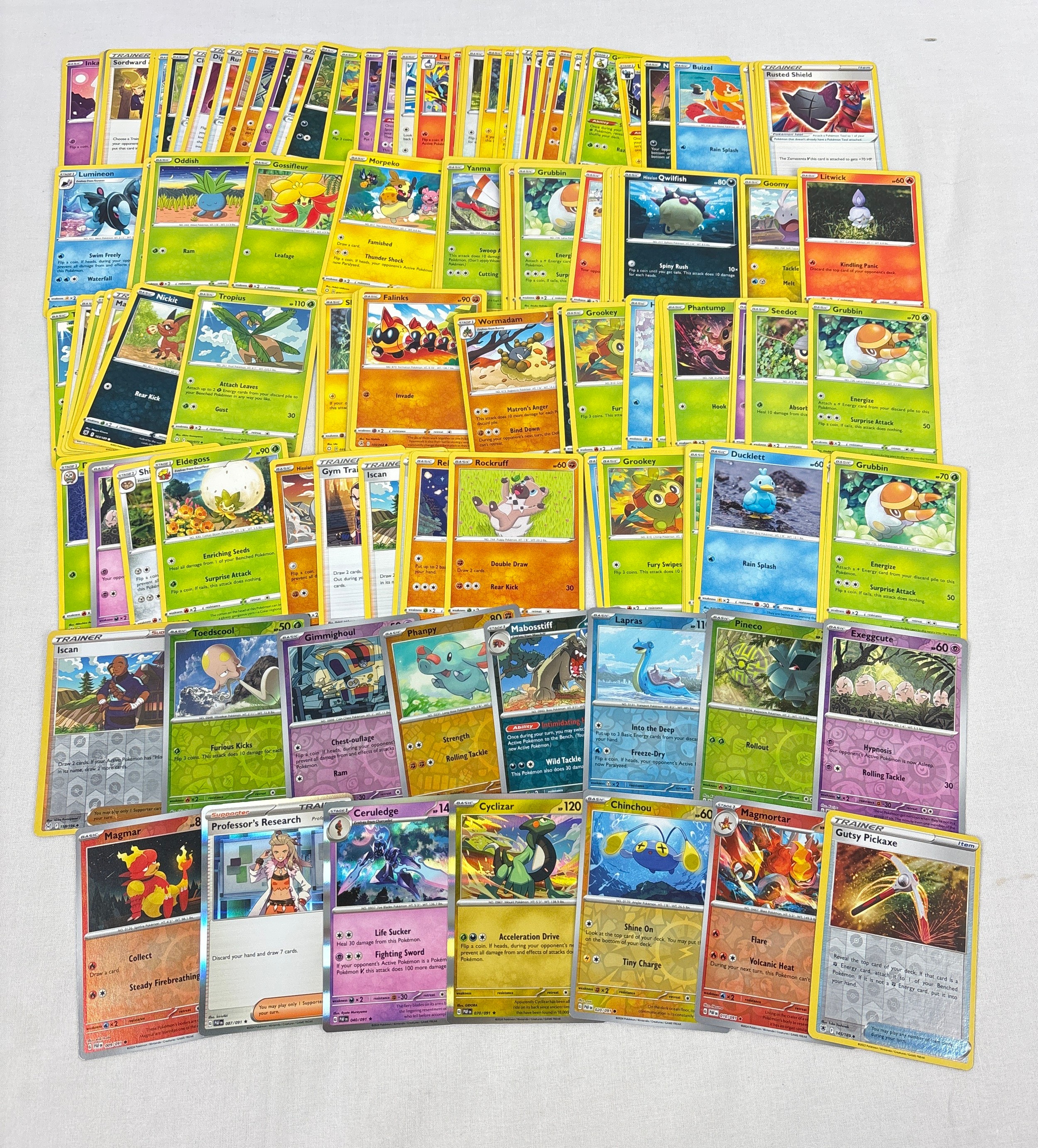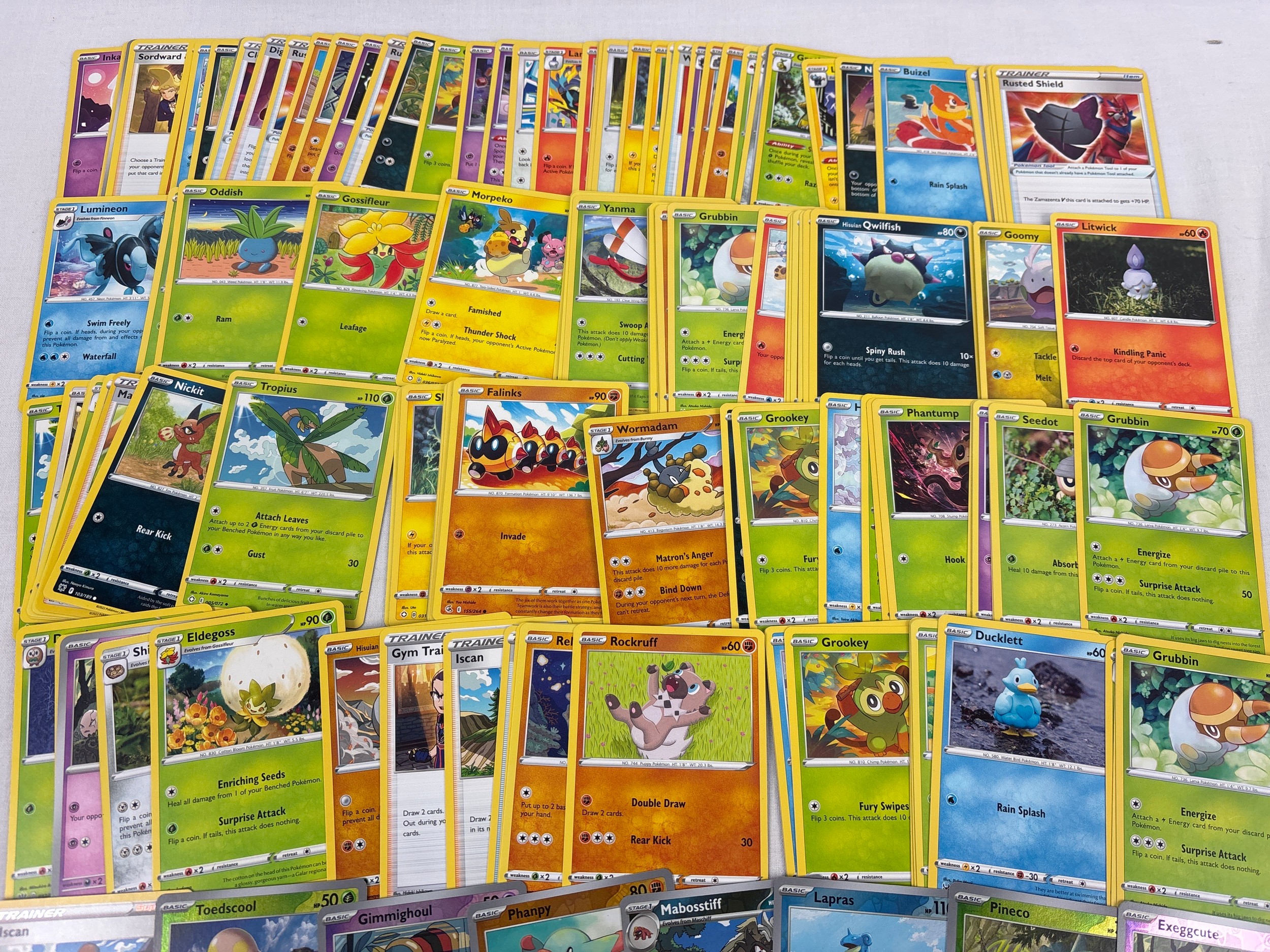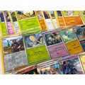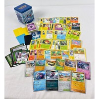 155 assorted Pokemon trading cards. To include 140 basic and trainer cards and 3 holo's and 12 reverse holo's.