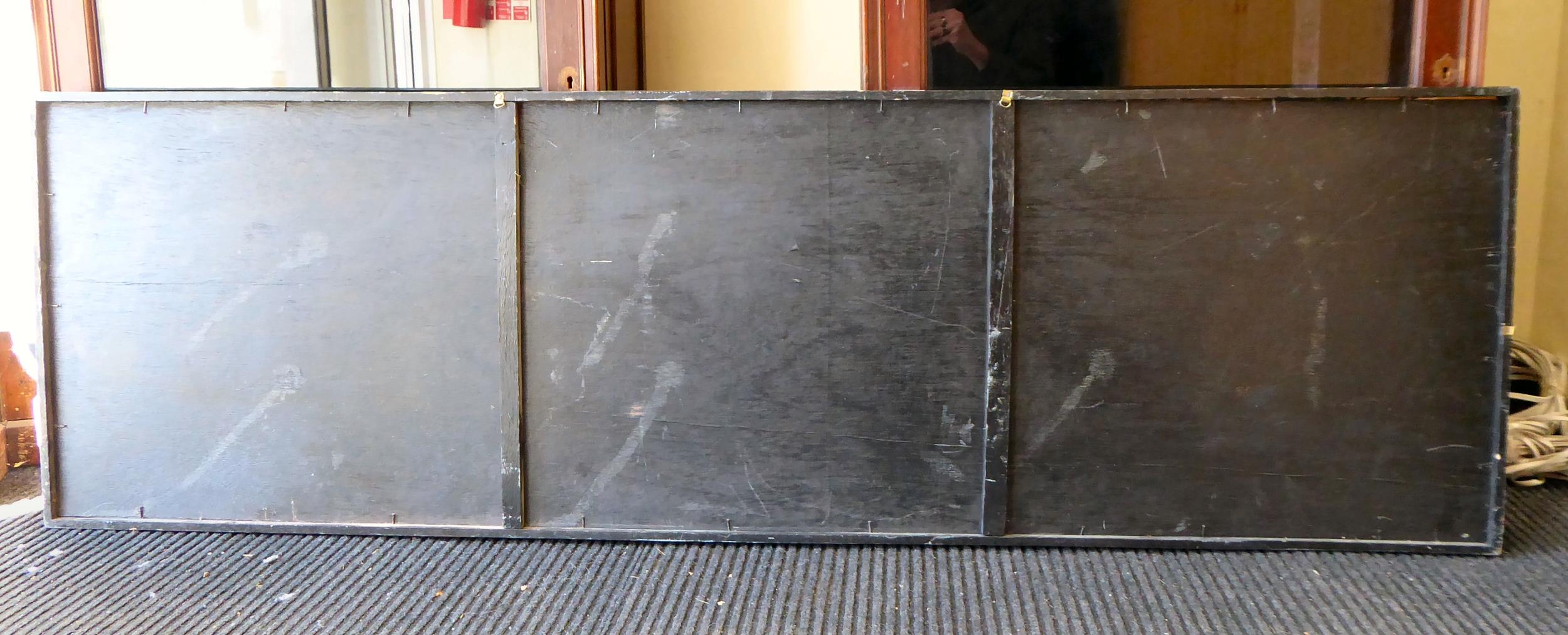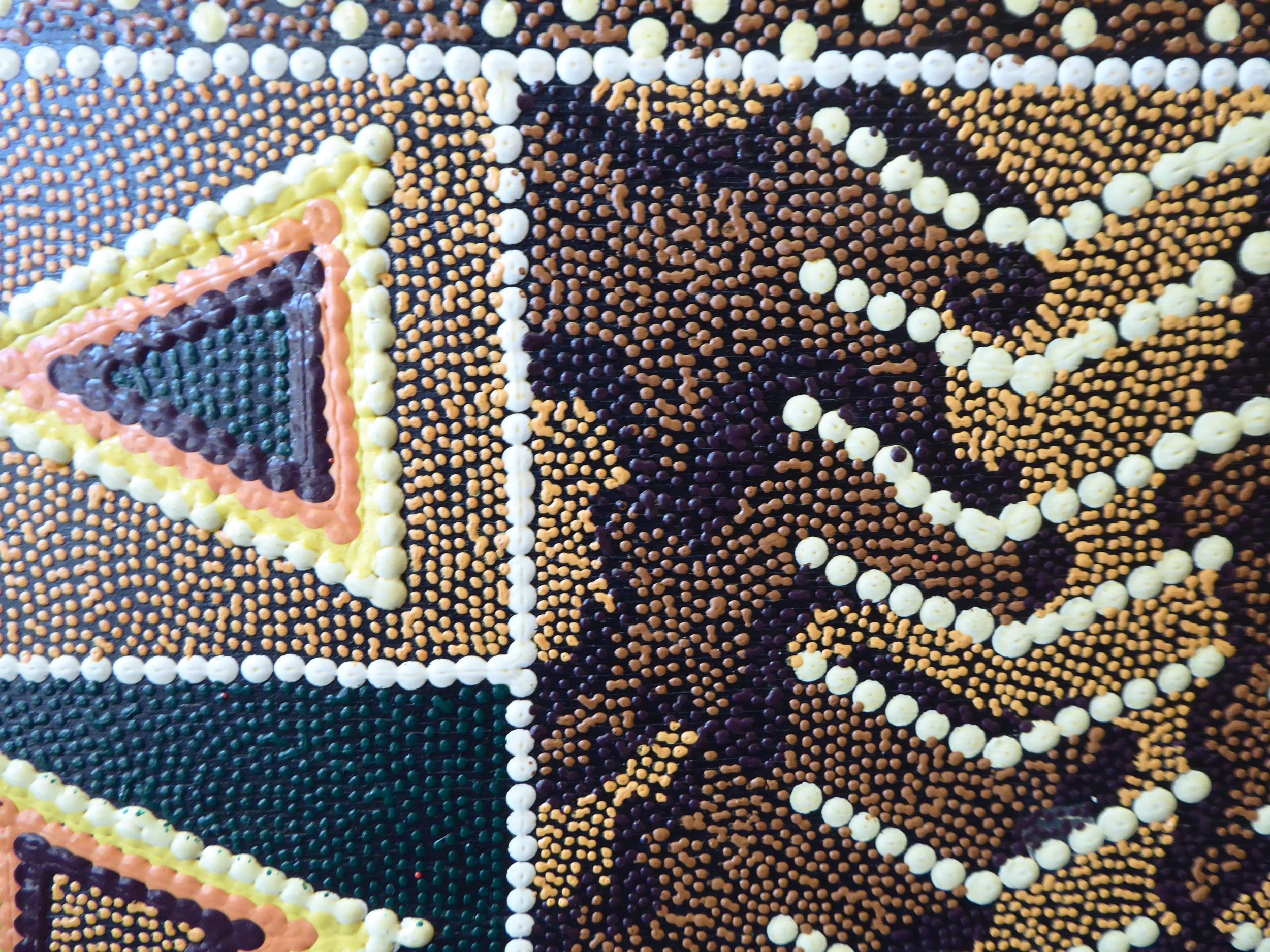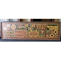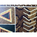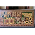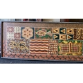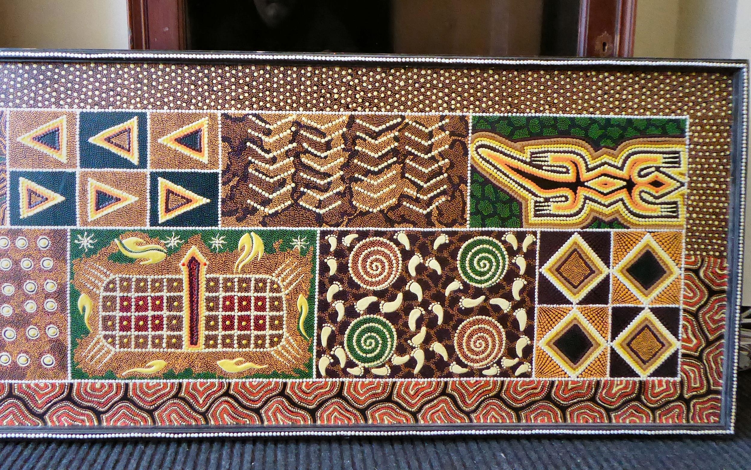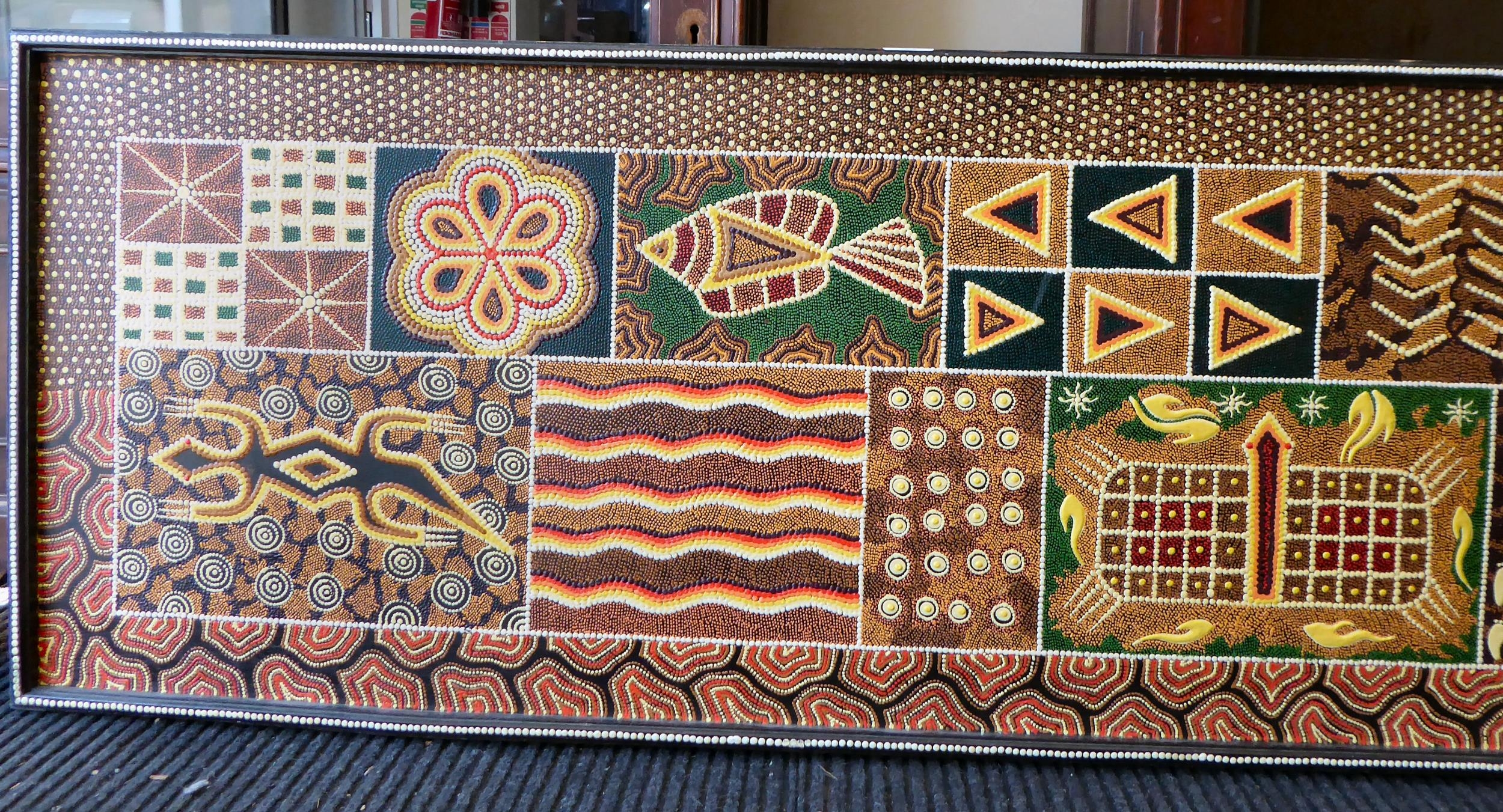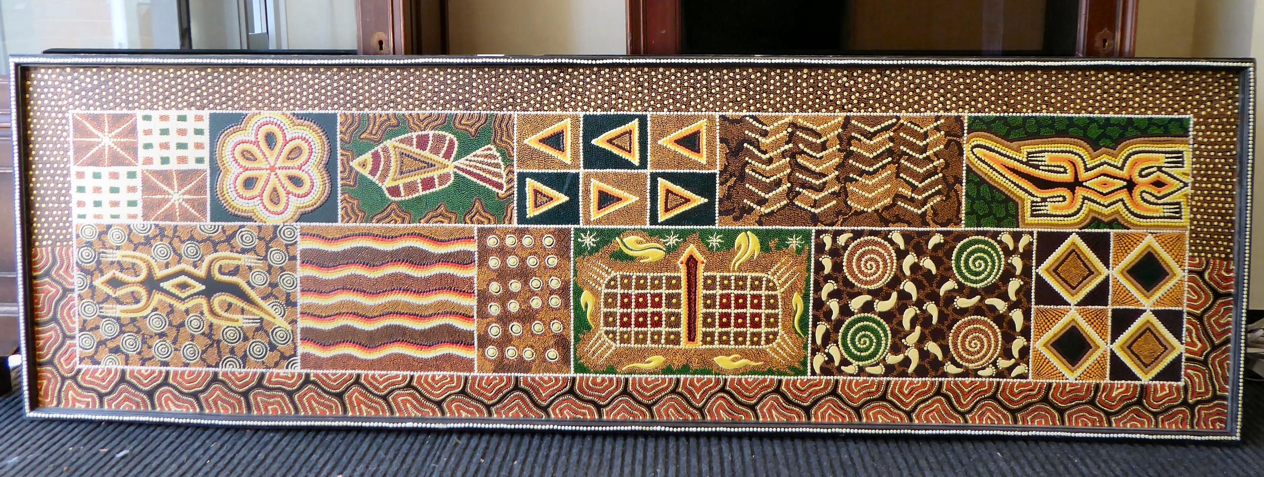 An Aboriginal painting, depicting fish and other ornament, in muted colours and geometric forms 21" x 67"