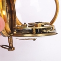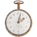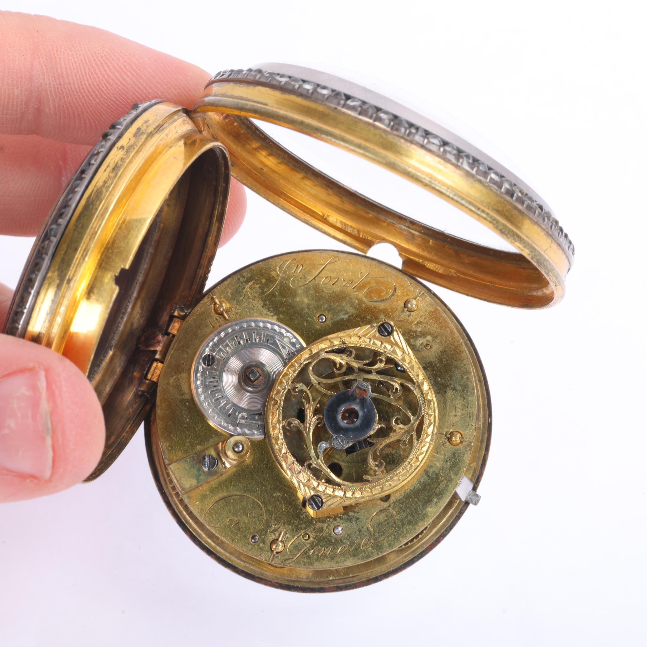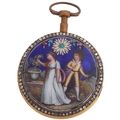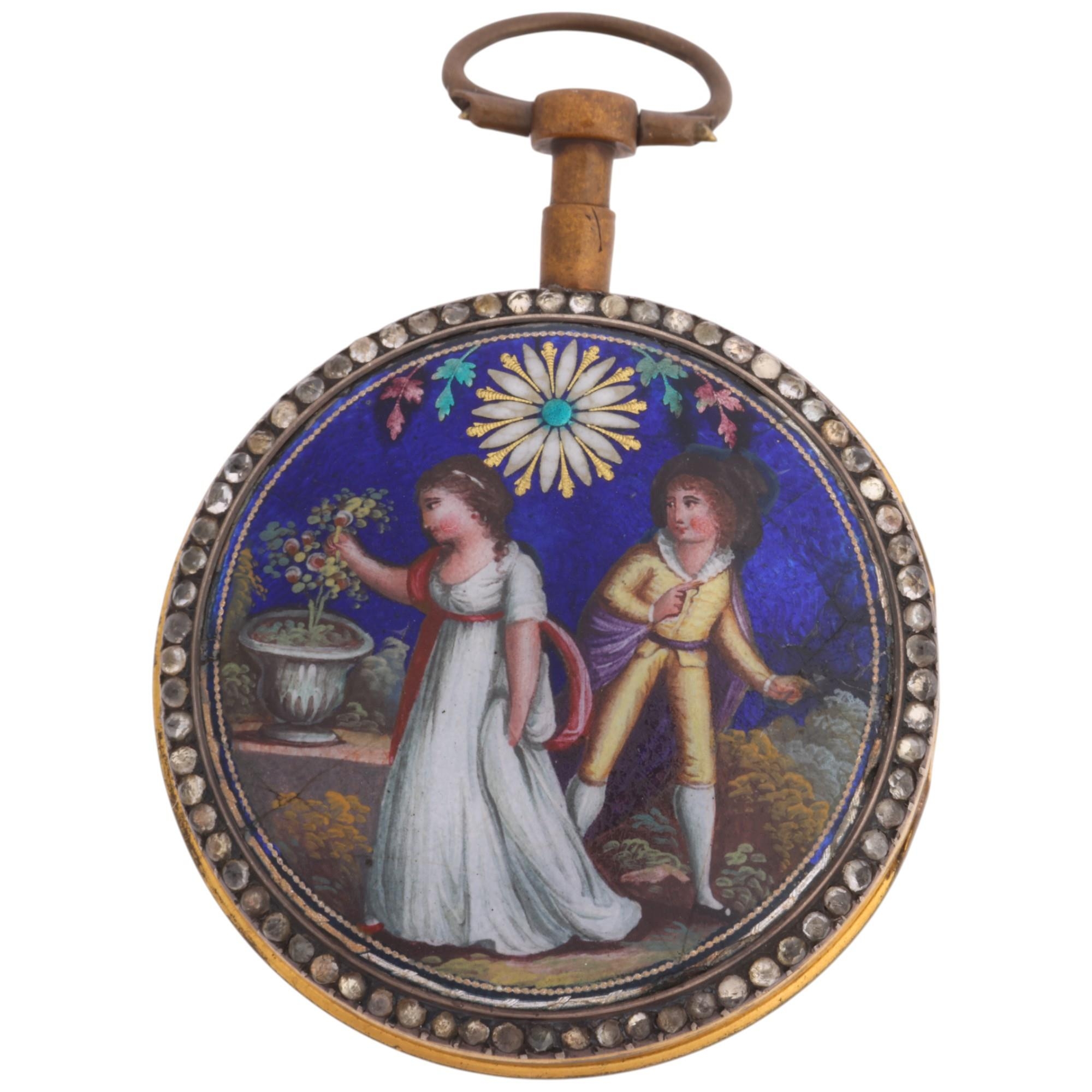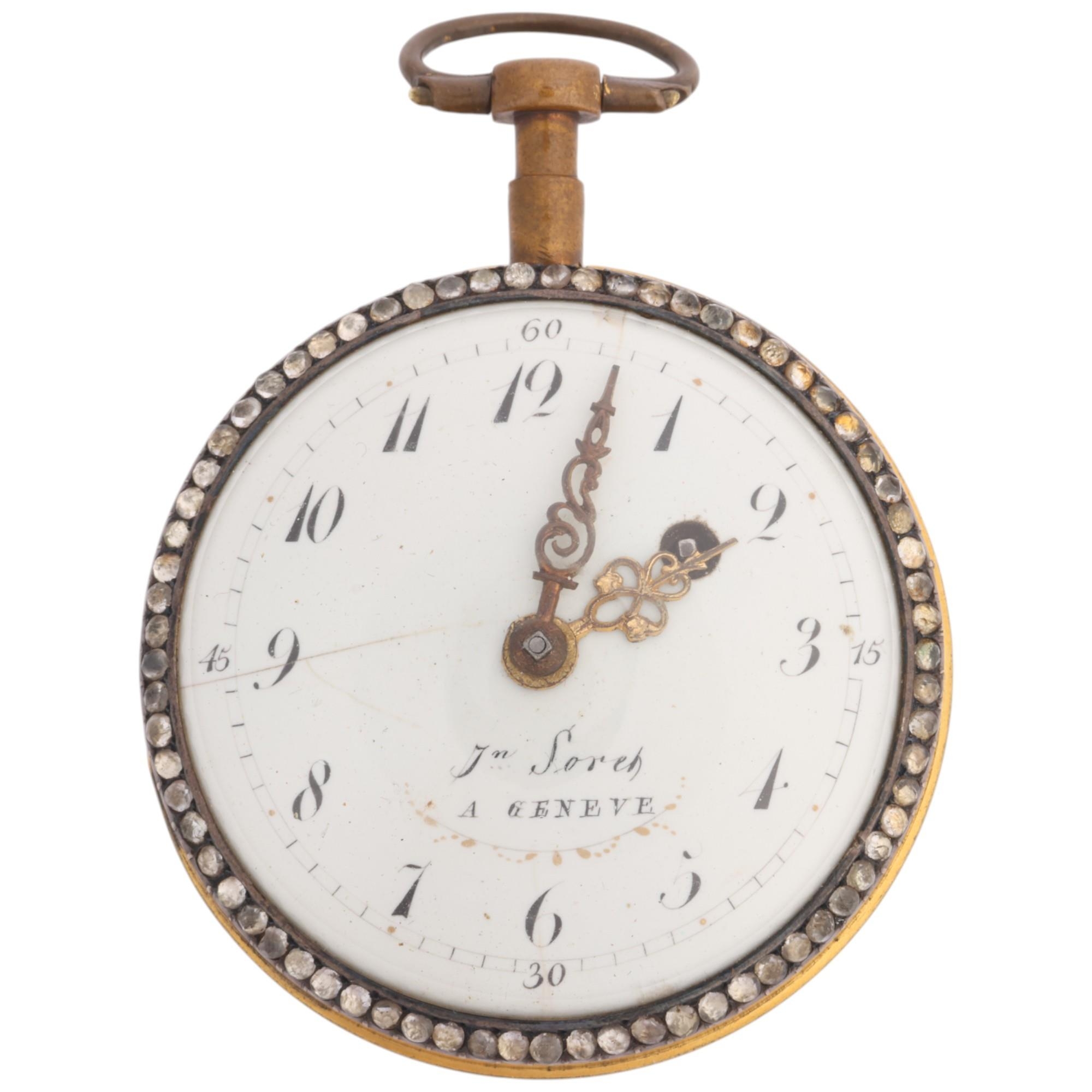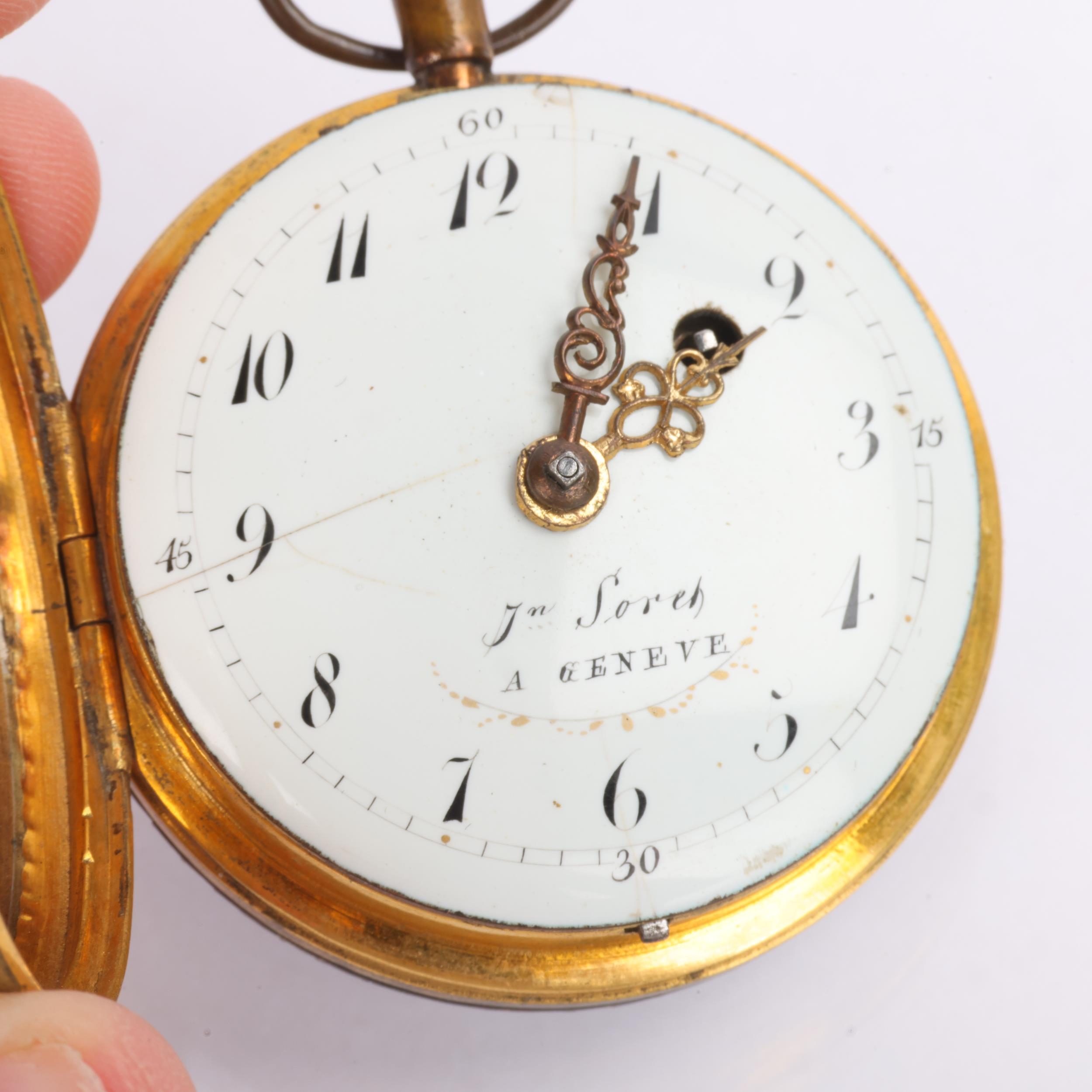 An 18th century Swiss gilt-metal paste and enamel open-face key-wind verge pocket watch, by Jean Robert Soret, Geneva, white enamel dial with hand painted black Arabic numerals, gilt foliate hands, with enamel caseback depicting 2 figures, and movement with hexagonal pillars, case width 50mm, not currently working