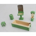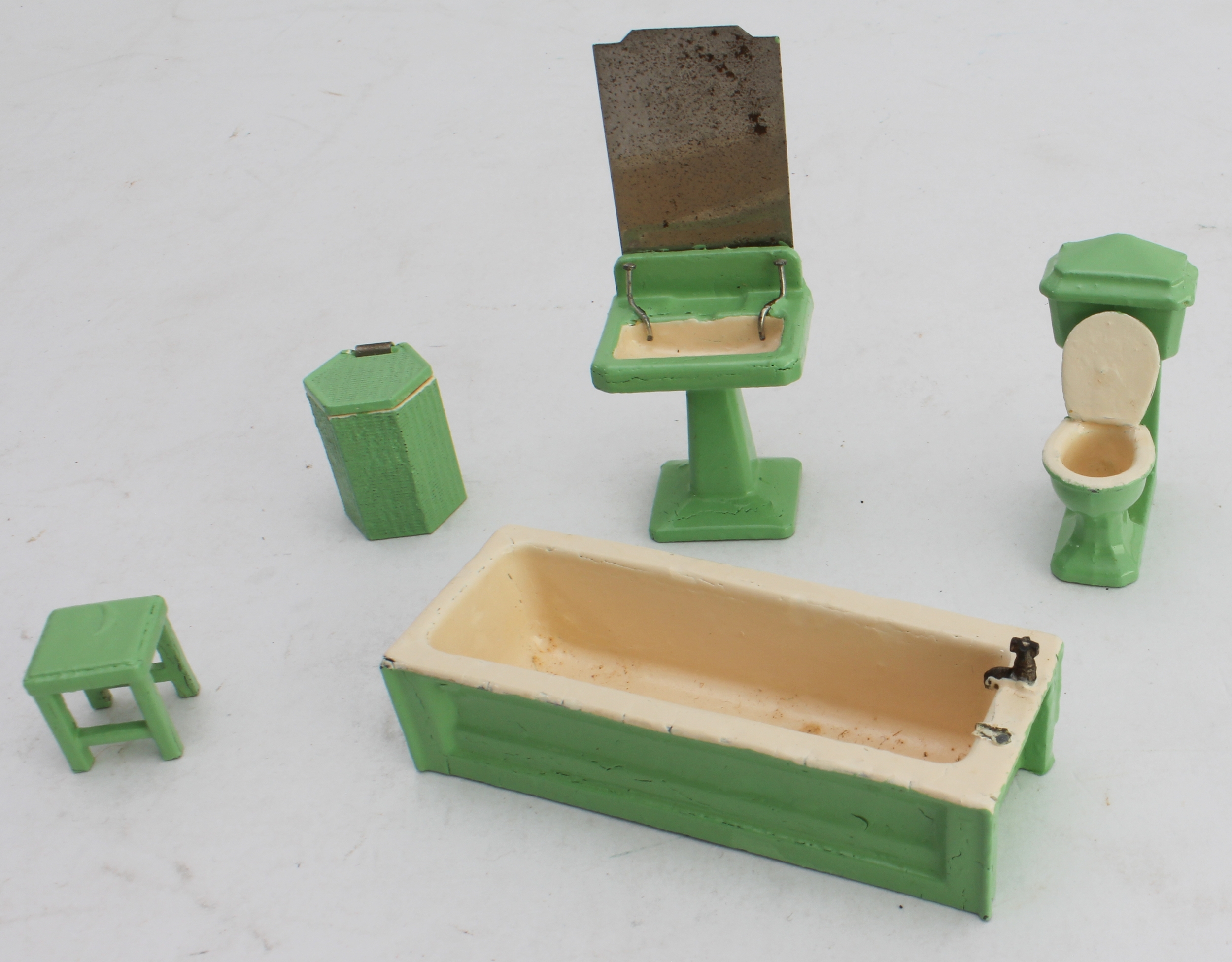 Condition: All pieces repainted. Minor metal fatigue. A leg of the bedroom chair away. Paint loss to a dining-room carver. Tap missing from bath. Otherwise good.