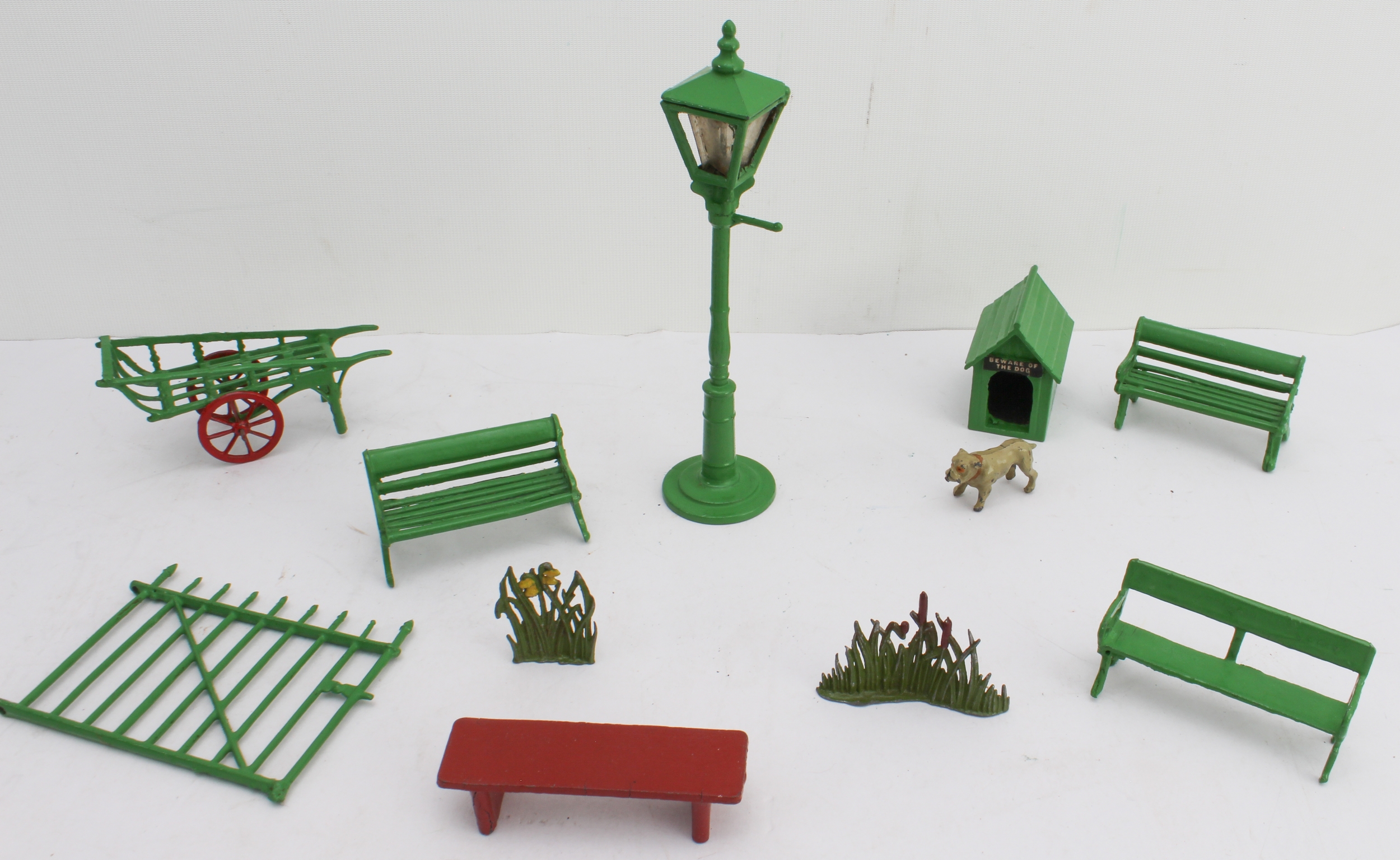 a J. Hill & Co. 'Street Gas Lamp' (14 cm high), garden gate, kennel and bulldog;