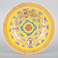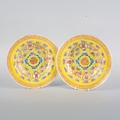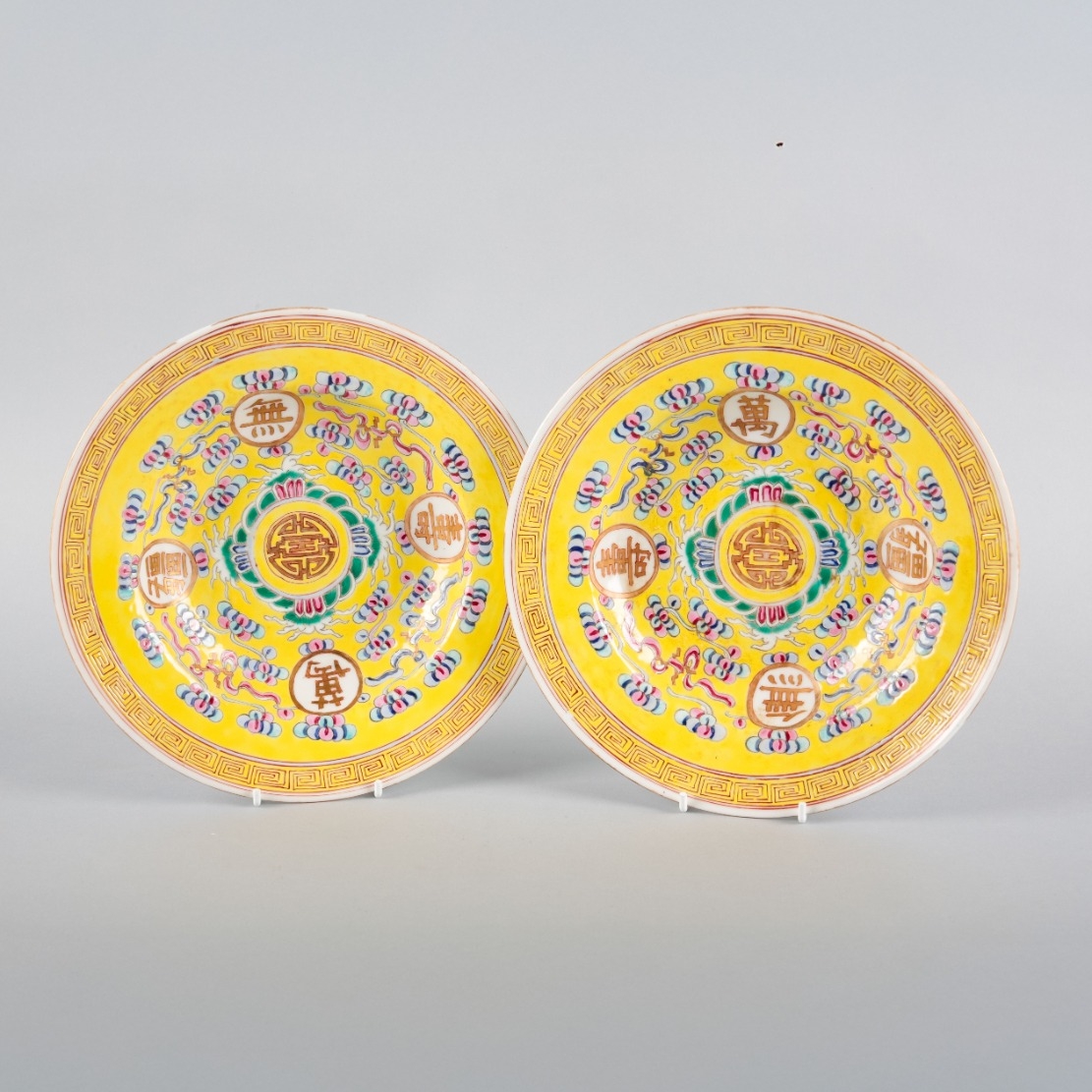 bearing six character Xuantong marks to the base, the yellow grounds decorated with roundels containing gilt characters, bands of ribbon flowing between, 23cm diameter (2)