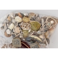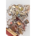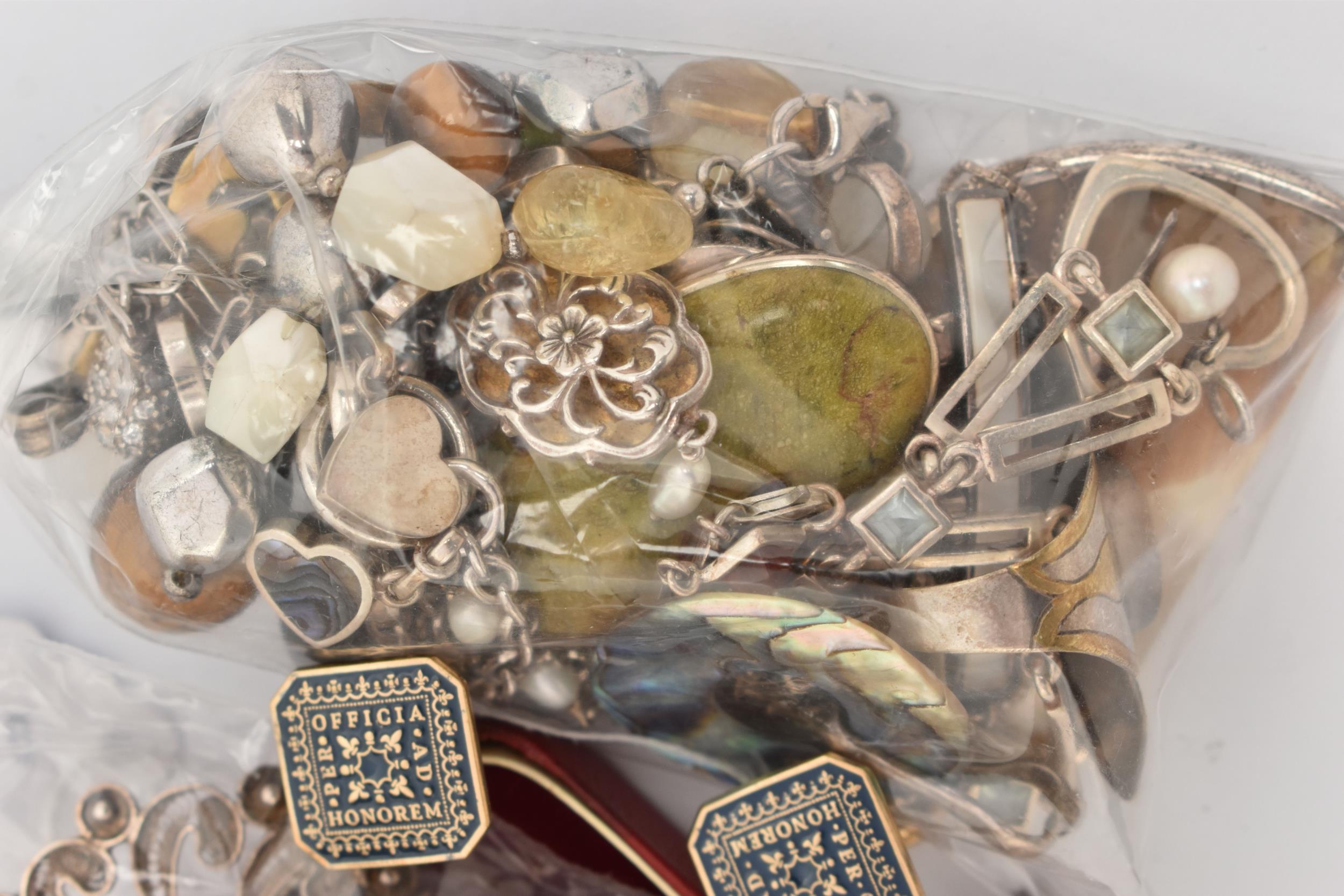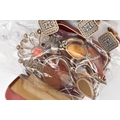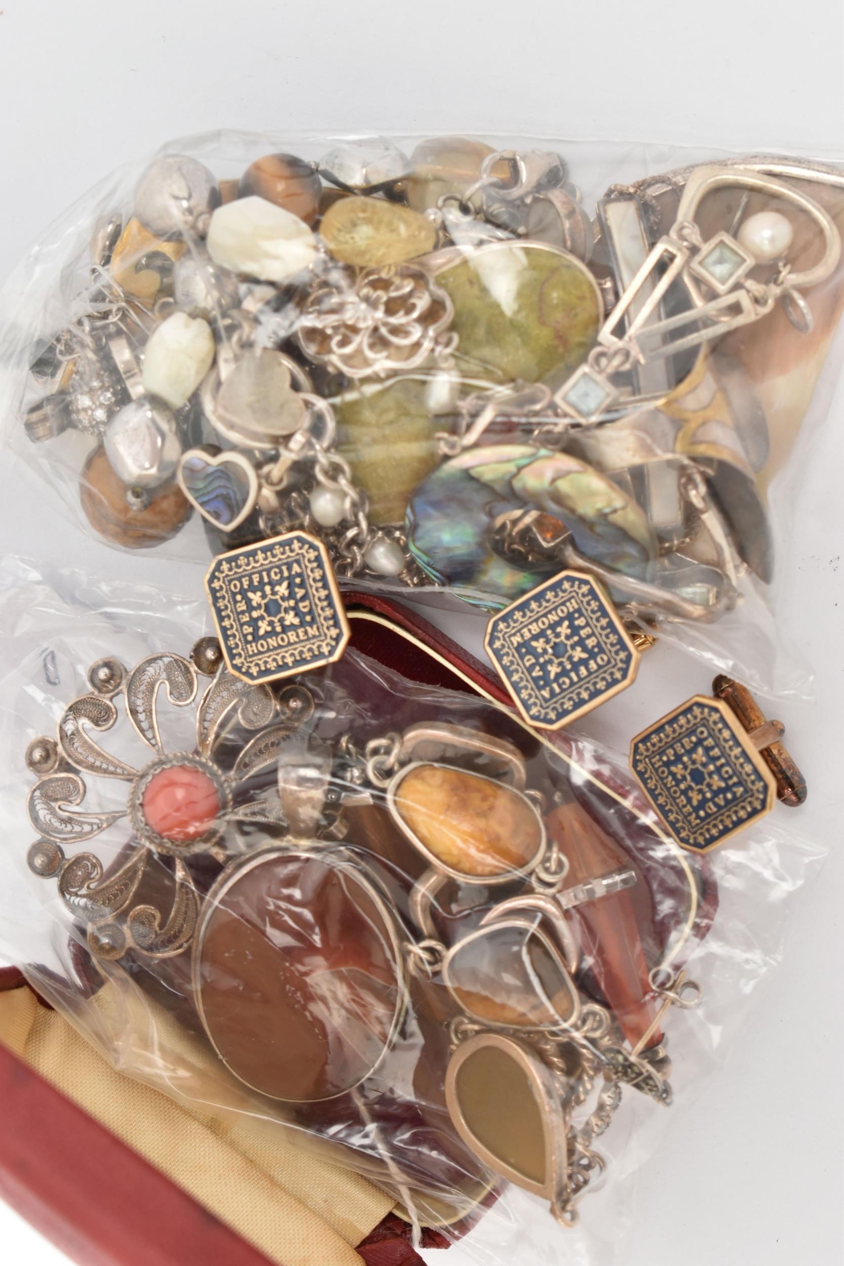 A SELECTION OF GEM SET SILVER AND WHITE METAL JEWELLERY AND ENAMEL SILVER CUFFLINK AND DRESS STUD SET, to include a silver enamel cufflink and dress stud set, sponsors mark RM, hallmarked Birmingham 1992, a coral filigree white metal brooch, an agate cabochon pendant stamped 925, a hard stone bracelet stamped QVC and hallmarked sterling silver, a pair of rock crystal, agate and marcasite ear pendants stamped 9ct & silver, a cubic zirconia eternity ring stamped Virtue 925, together with further items, approx. gross weight 222.90 grams, some items AF (condition report: overall condition very good)