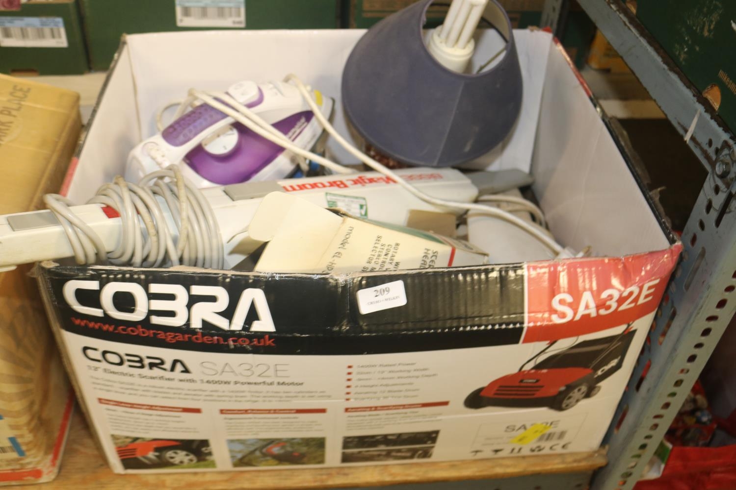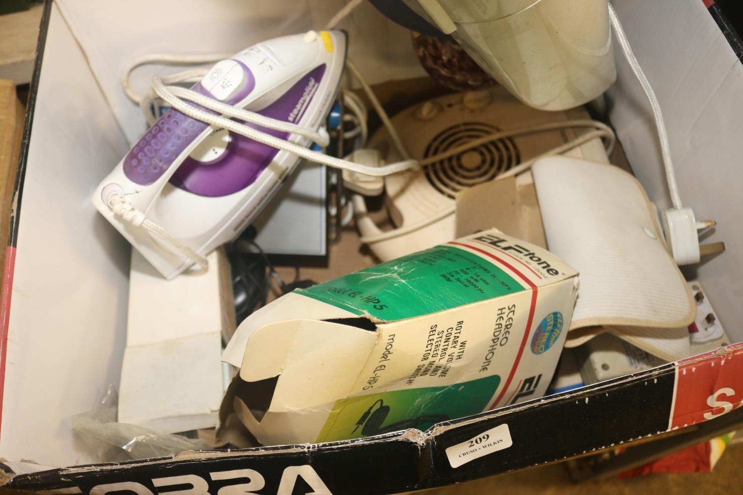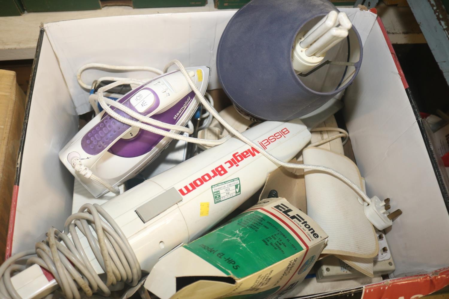 BOX OF ELECTRICS, LAMP, 2 X HEATERS, IRON, MAGIC BROOM, PHONES ETC. - WARRANTED UNTIL 12 NOON ON TUESDAY FOLLOWING THE ABOVE SALE
