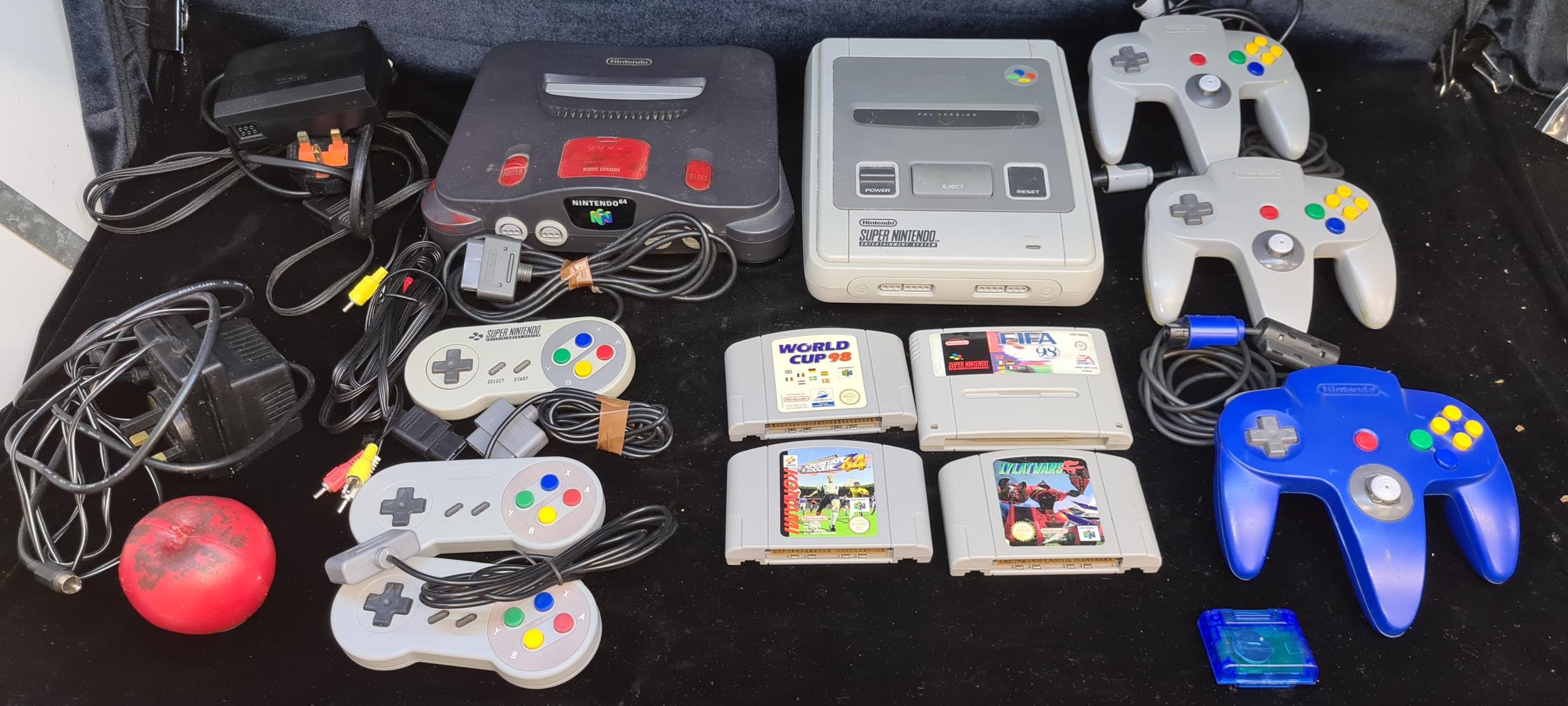 A box containing 2 games consoles including retro super Nintendo entertainment system along with a Nintendo 64 control deck with five controllers, cable leads and four game cartridges such as FIFA 98, World Cup 98 examples.