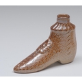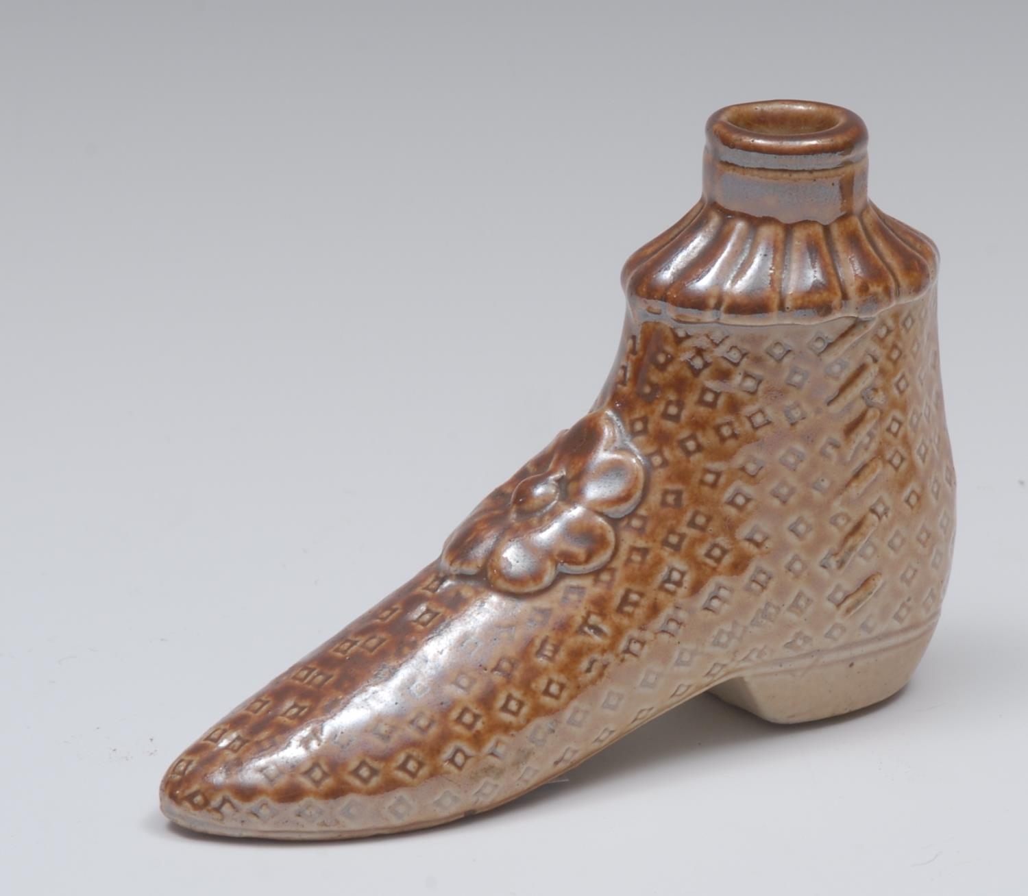 A 19th century brown salt glazed stoneware gin flask, in the form of a boot, applied with flowerhead, 10cm long, c.1840