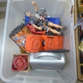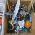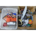 Two boxes of action figures and toys including Mega Blox creatures and Action Man