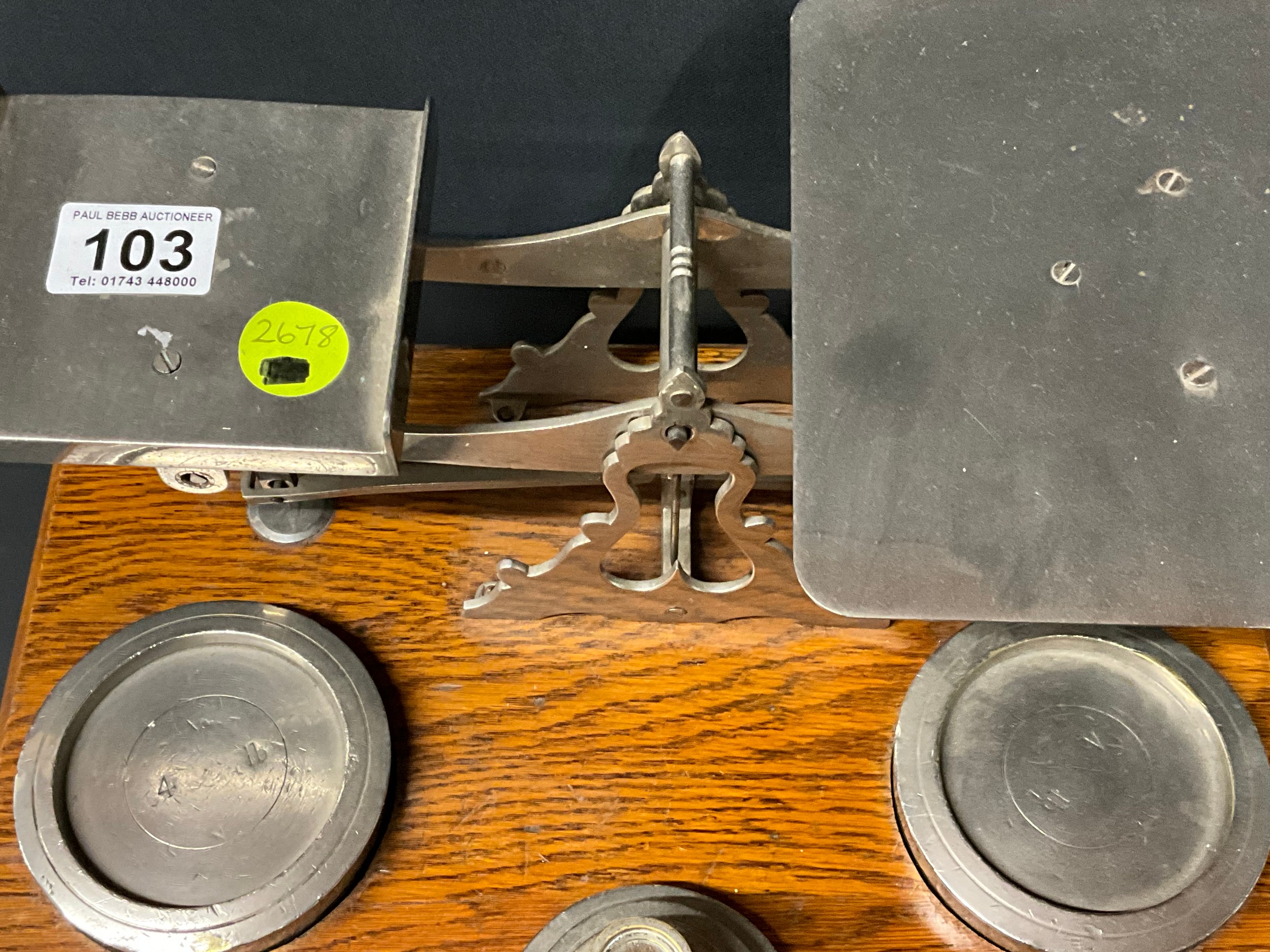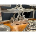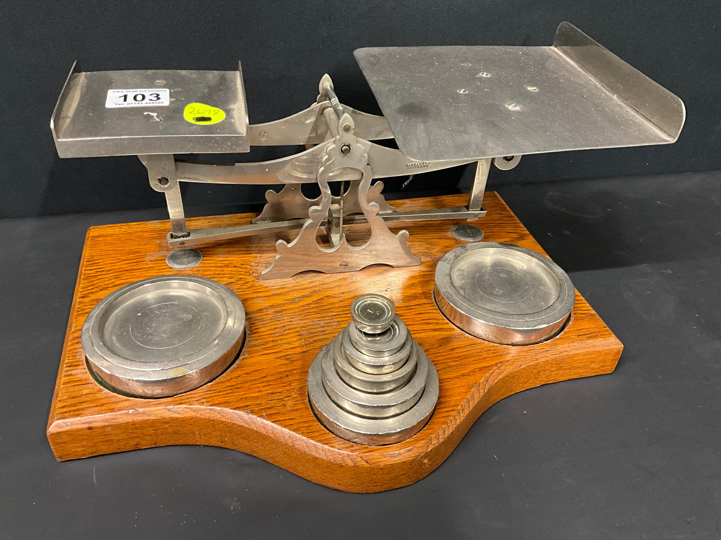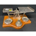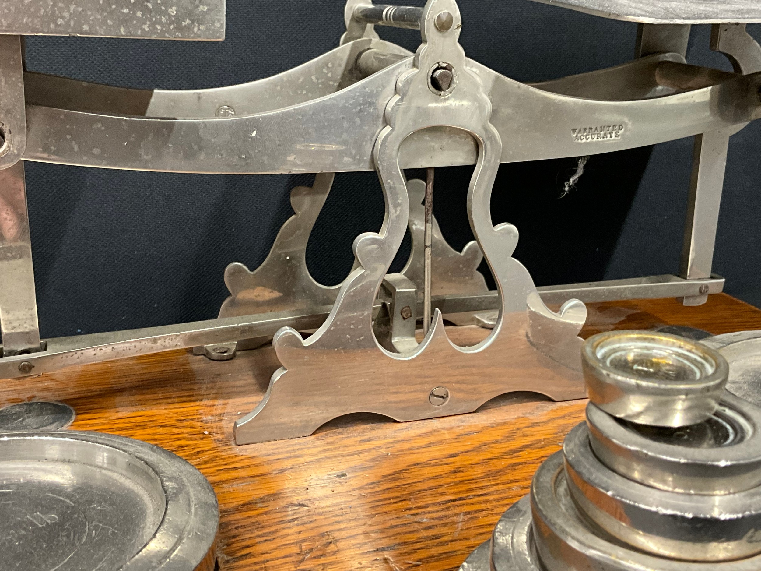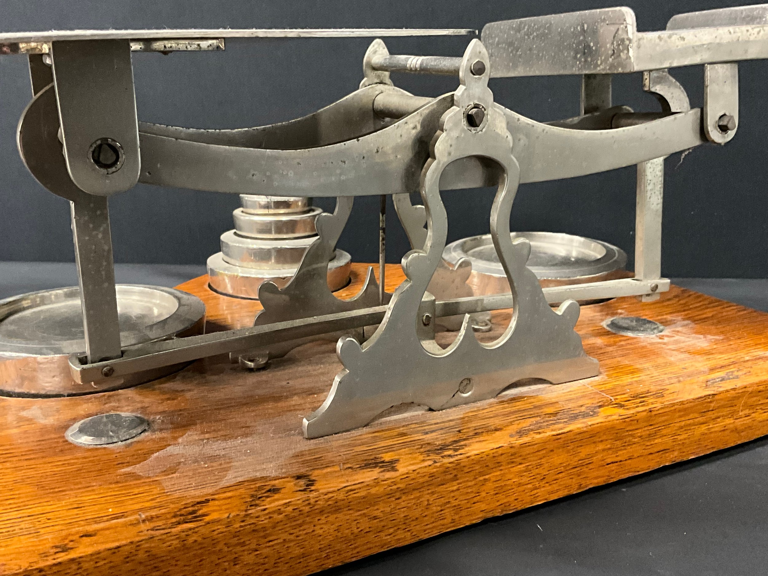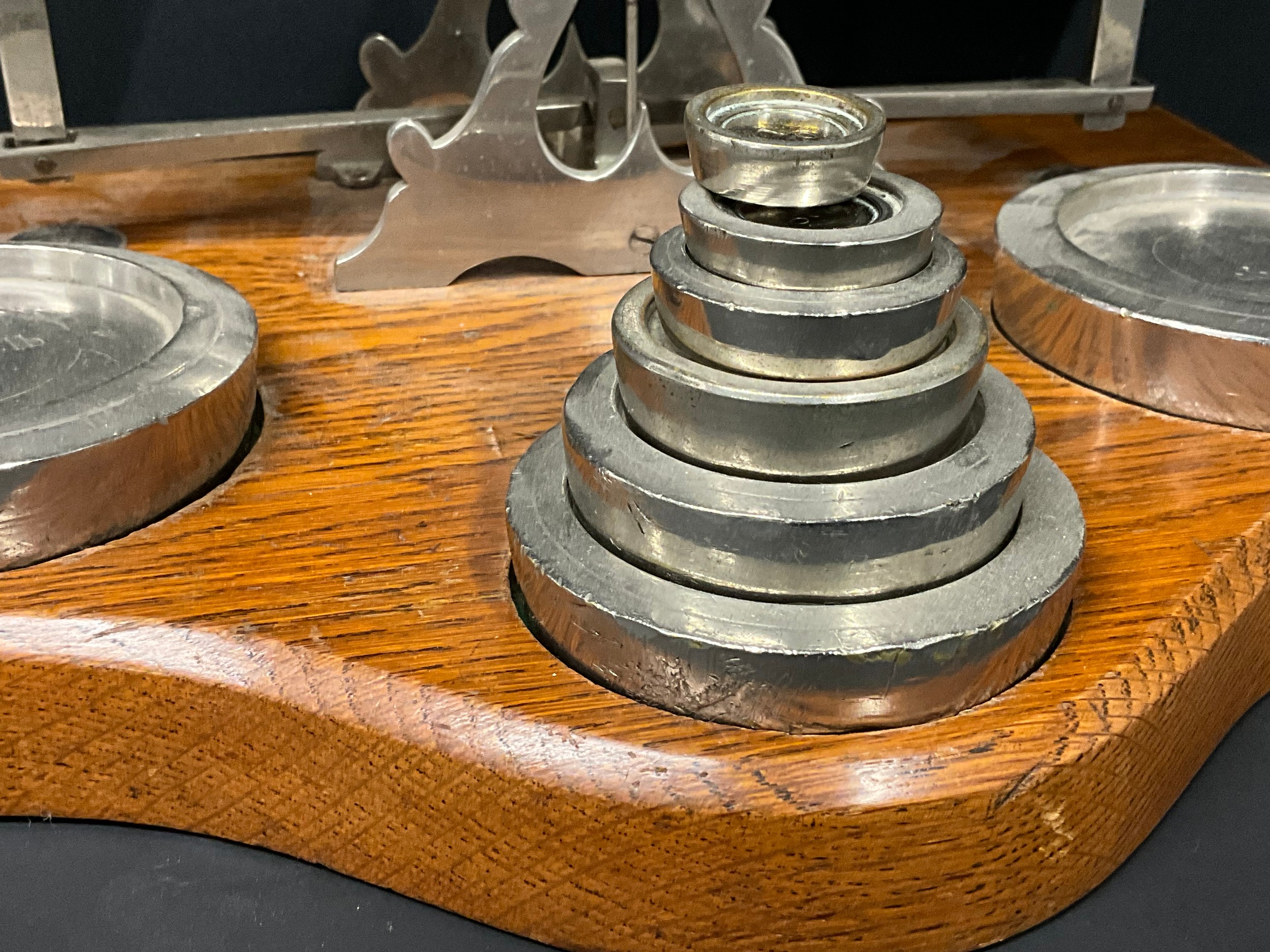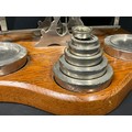 LARGE SET OF EDWARDIAN PARCEL SCALES AND WEIGHTS ON OAK BASE