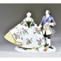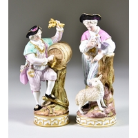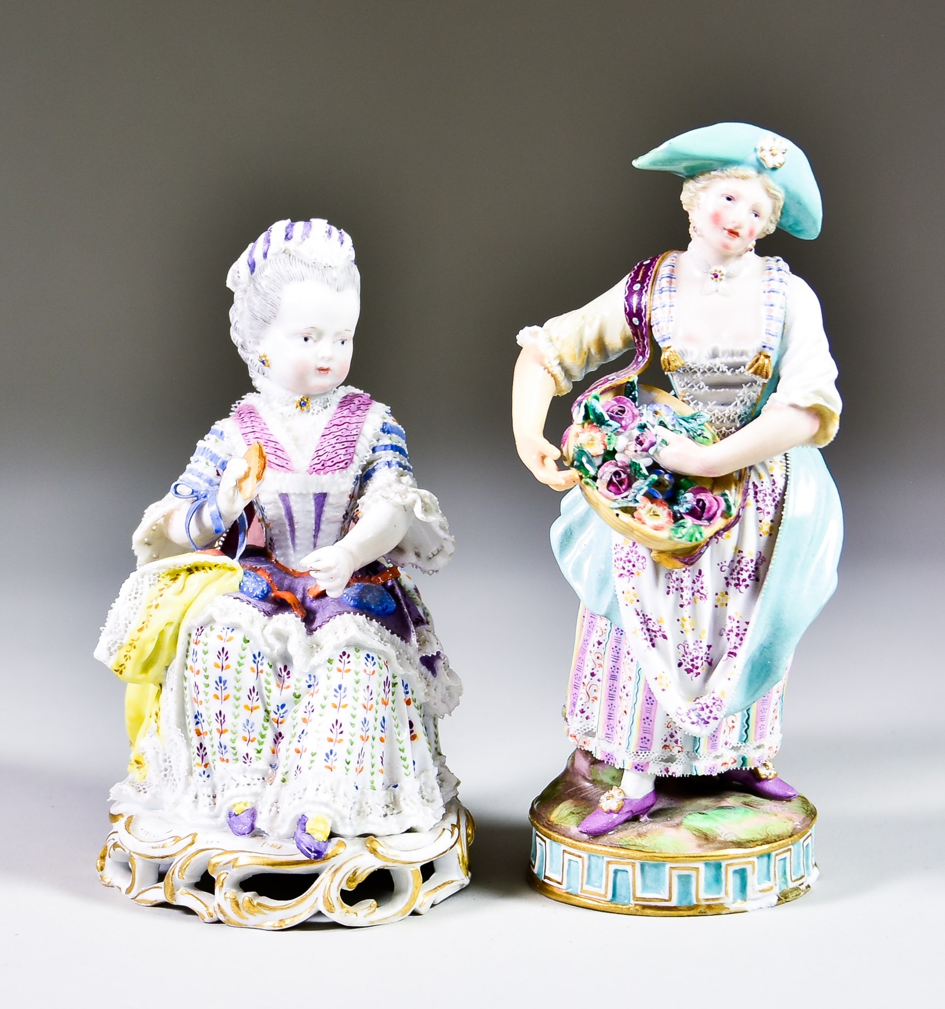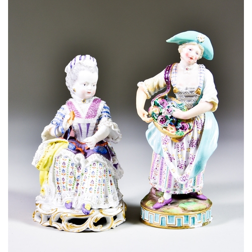 Two Meissen Porcelain Figures of a Gardener and a Seated Lady, the gardener designed by Michel Victor Acier, model No. C72, with painted blue mark to base, 6.25ins high, and the seated lady with knotting shuttle in hand, on open rocaille base, impressed mark and painted blue mark to base, 5ins high