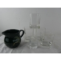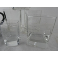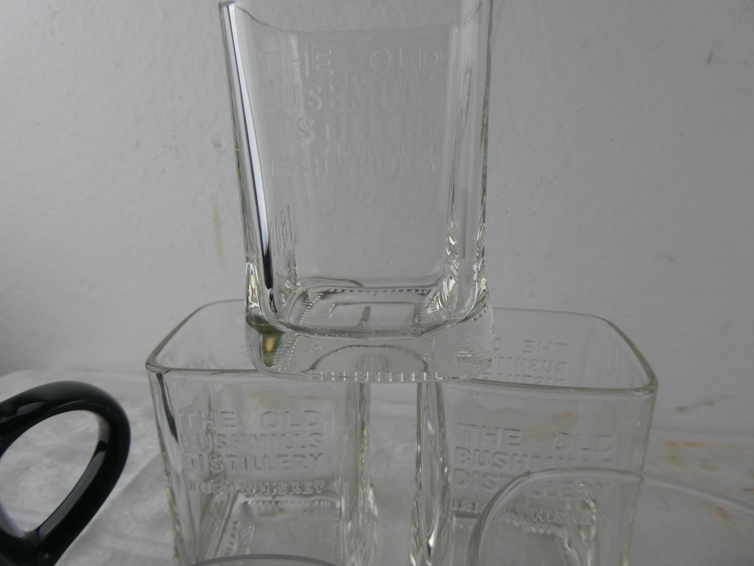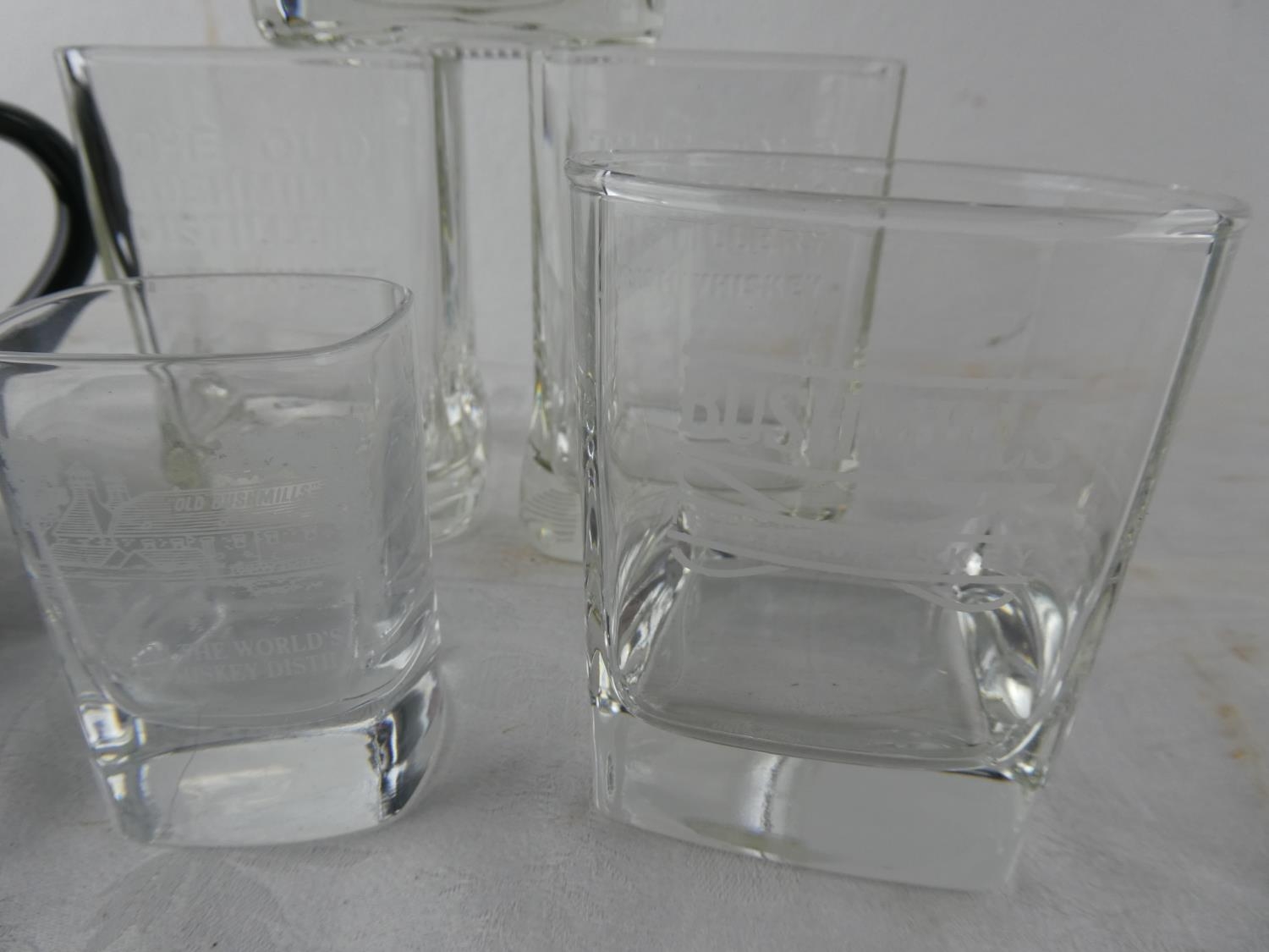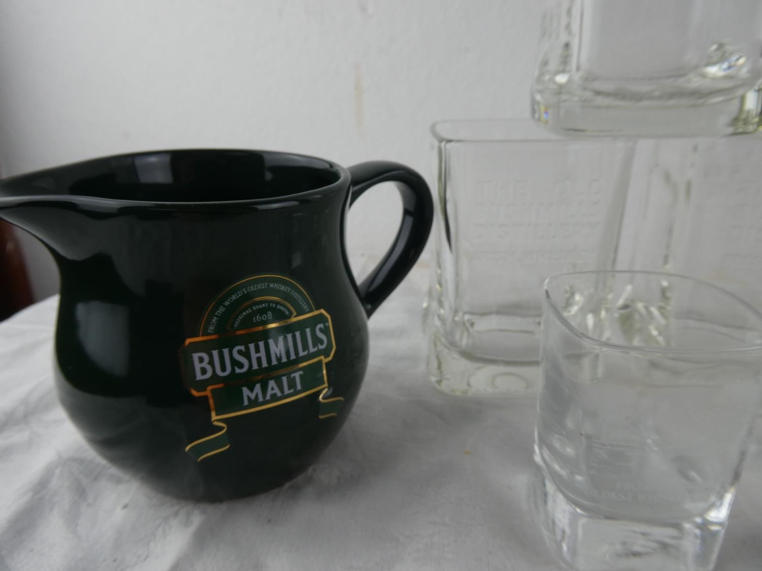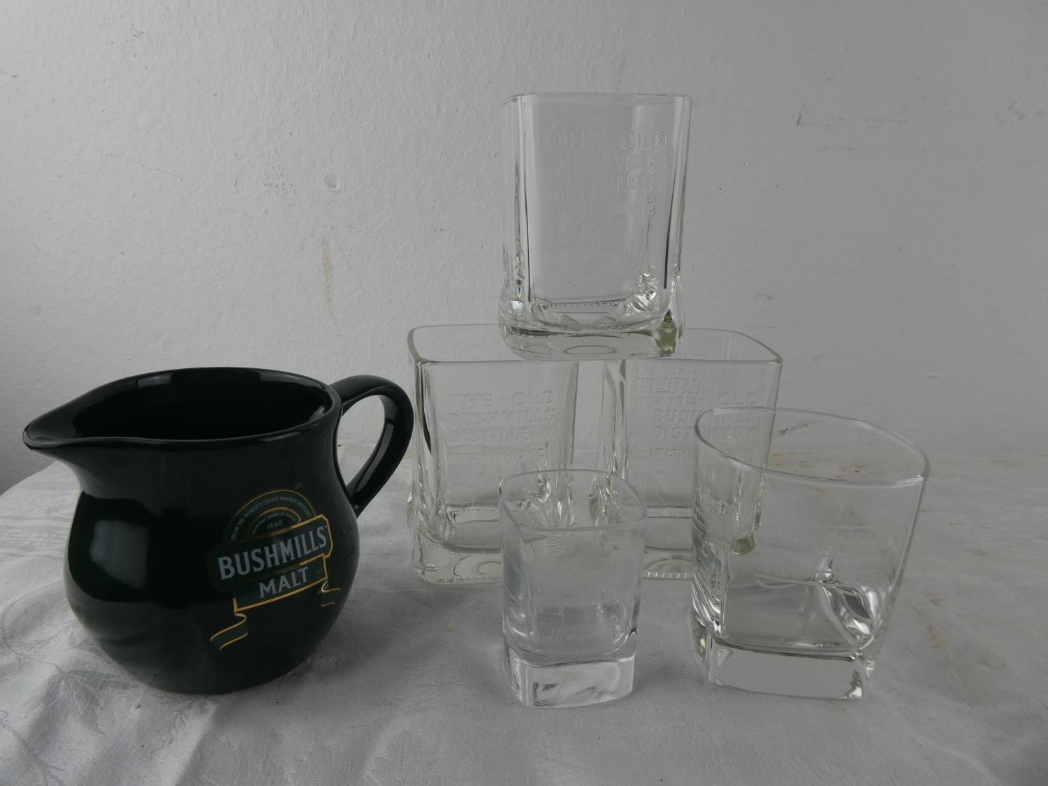 An assortment of glass ware and a jug relating to the Old Bushmills Distillery.