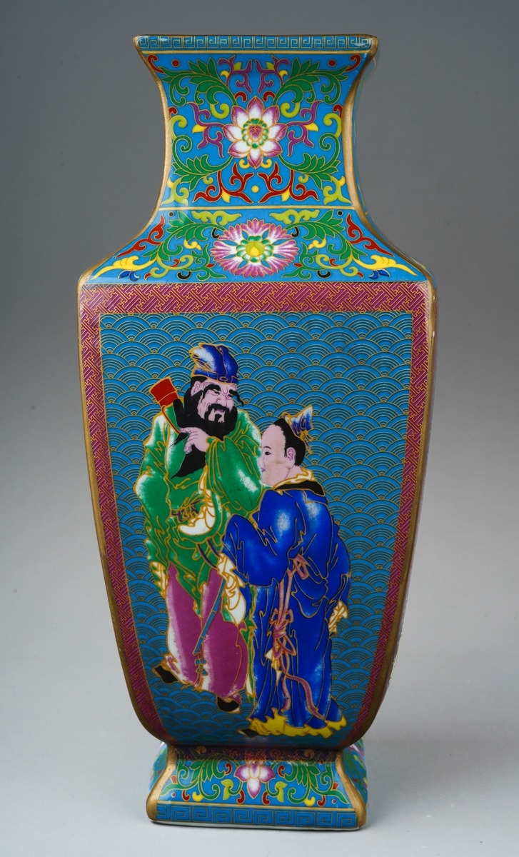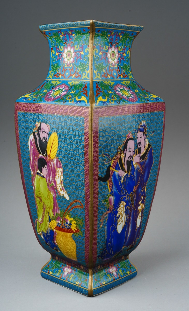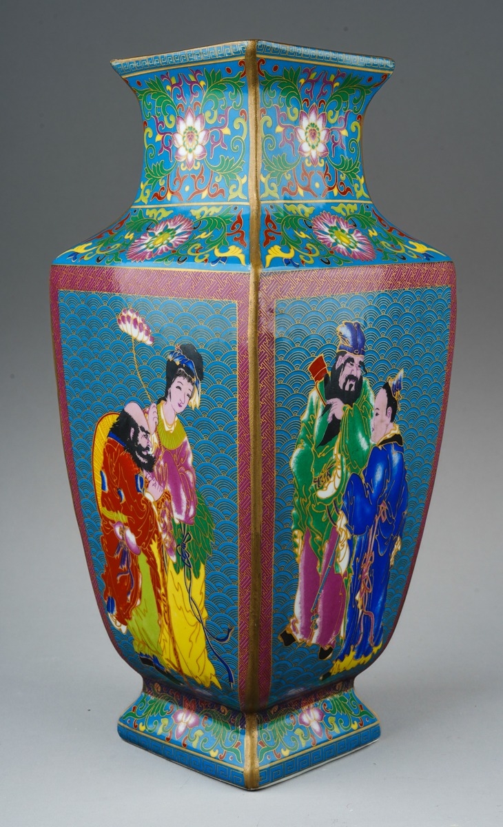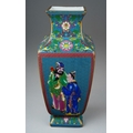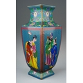 A modern Chinese porcelain vase of square baluster form, polychrome enamelled in the style of cloisonne decoration depicting figures to all four sides, printed seal mark to base, height 29cm