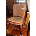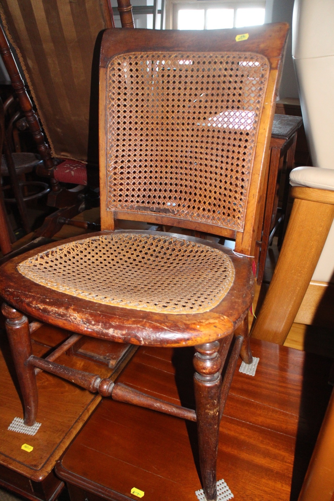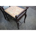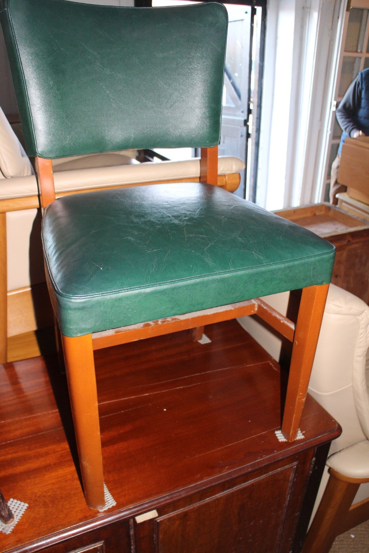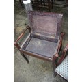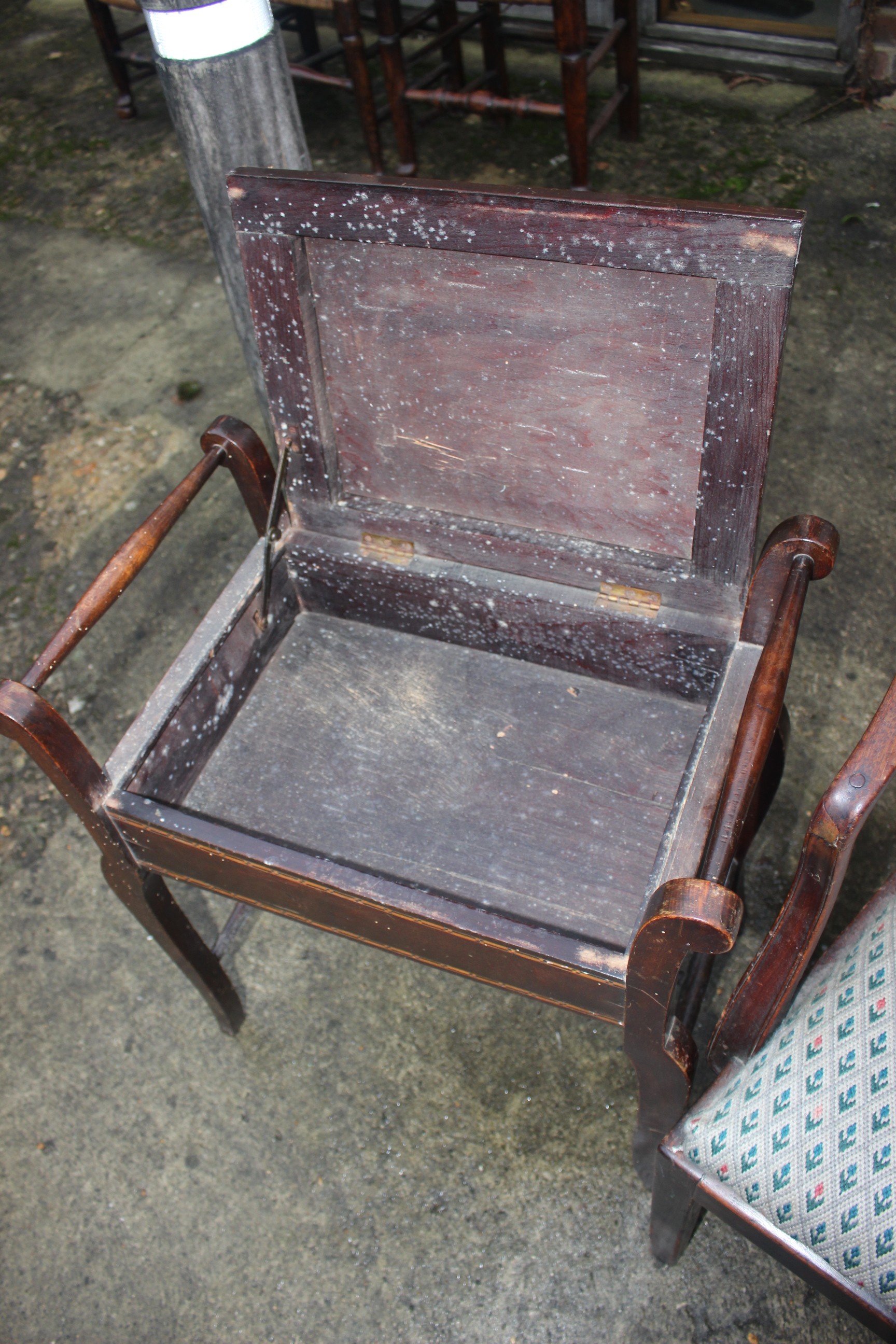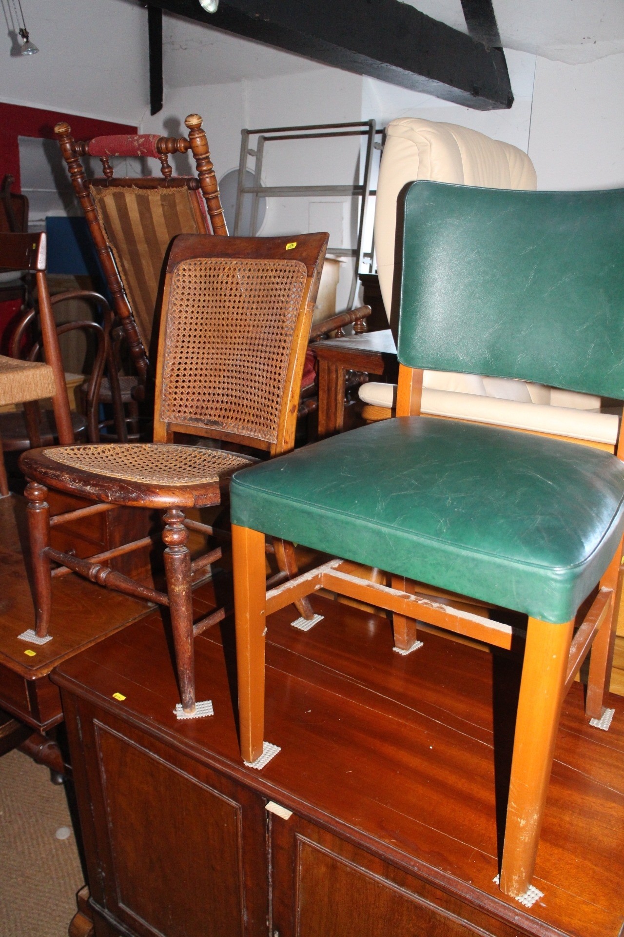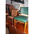 An Edwardian polished as walnut box seat piano stool, on cabriole supports, 21" wide x 13" deep x 25" high, a cane seat nursing chair and a mid century green leatherette upholstered side chair