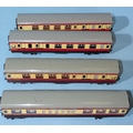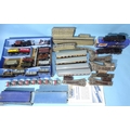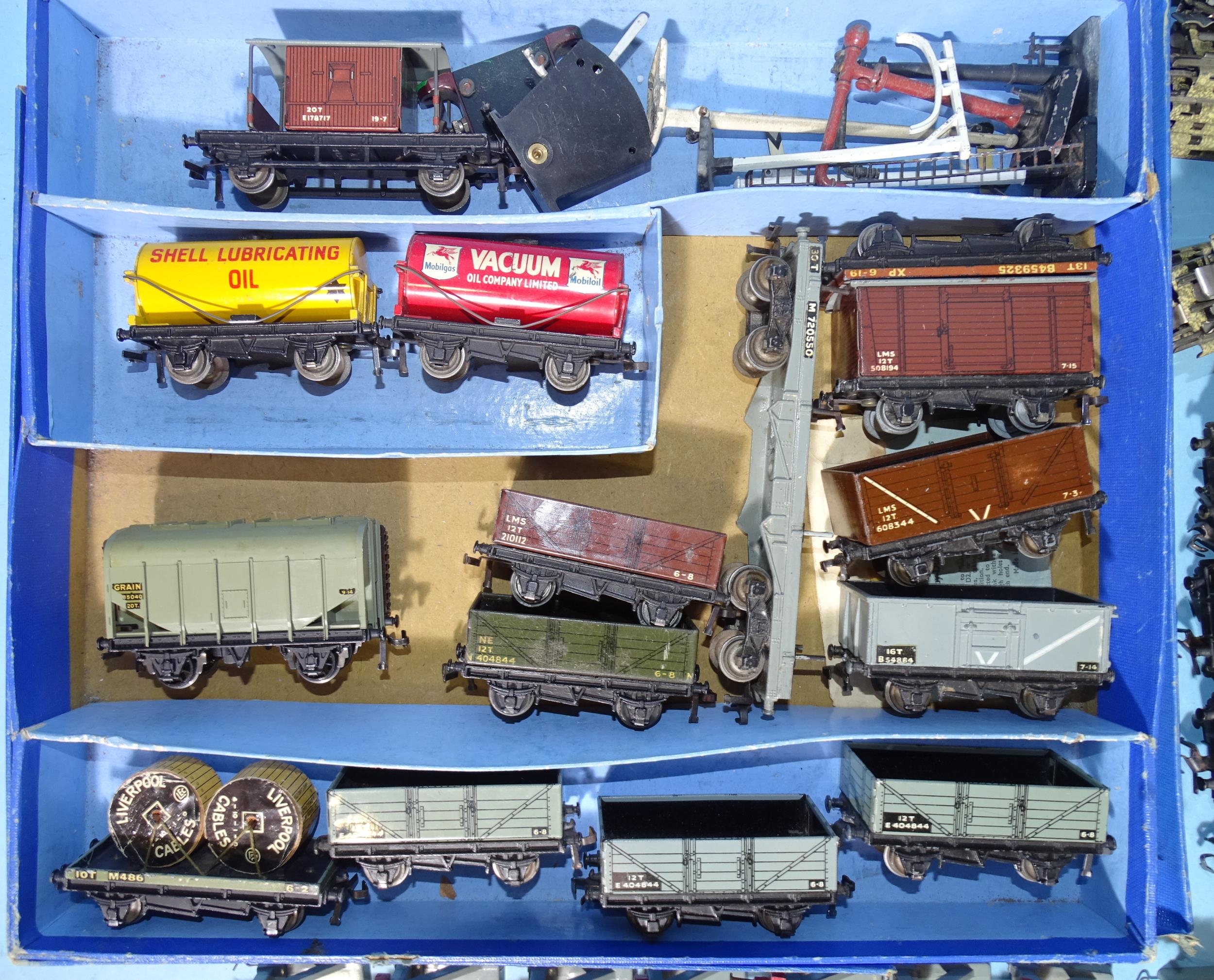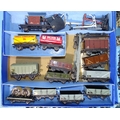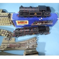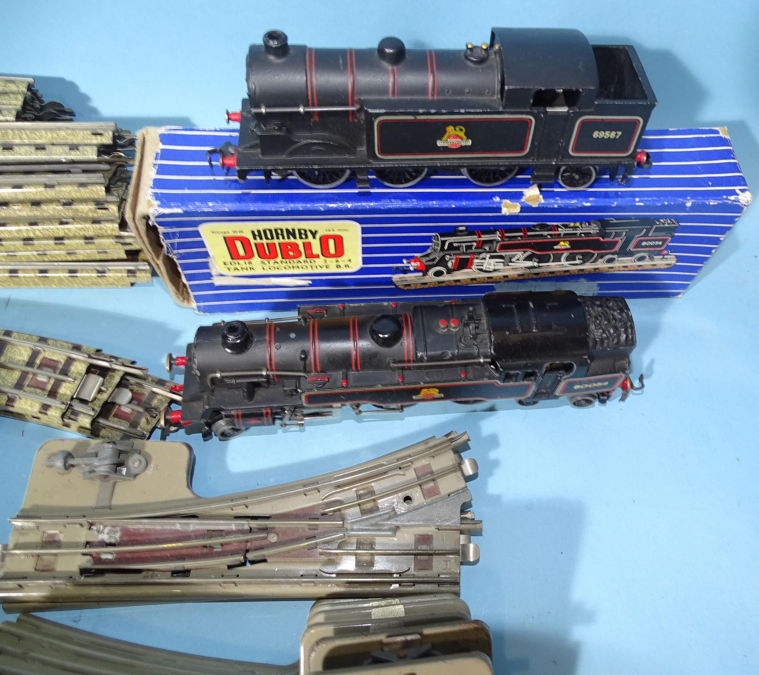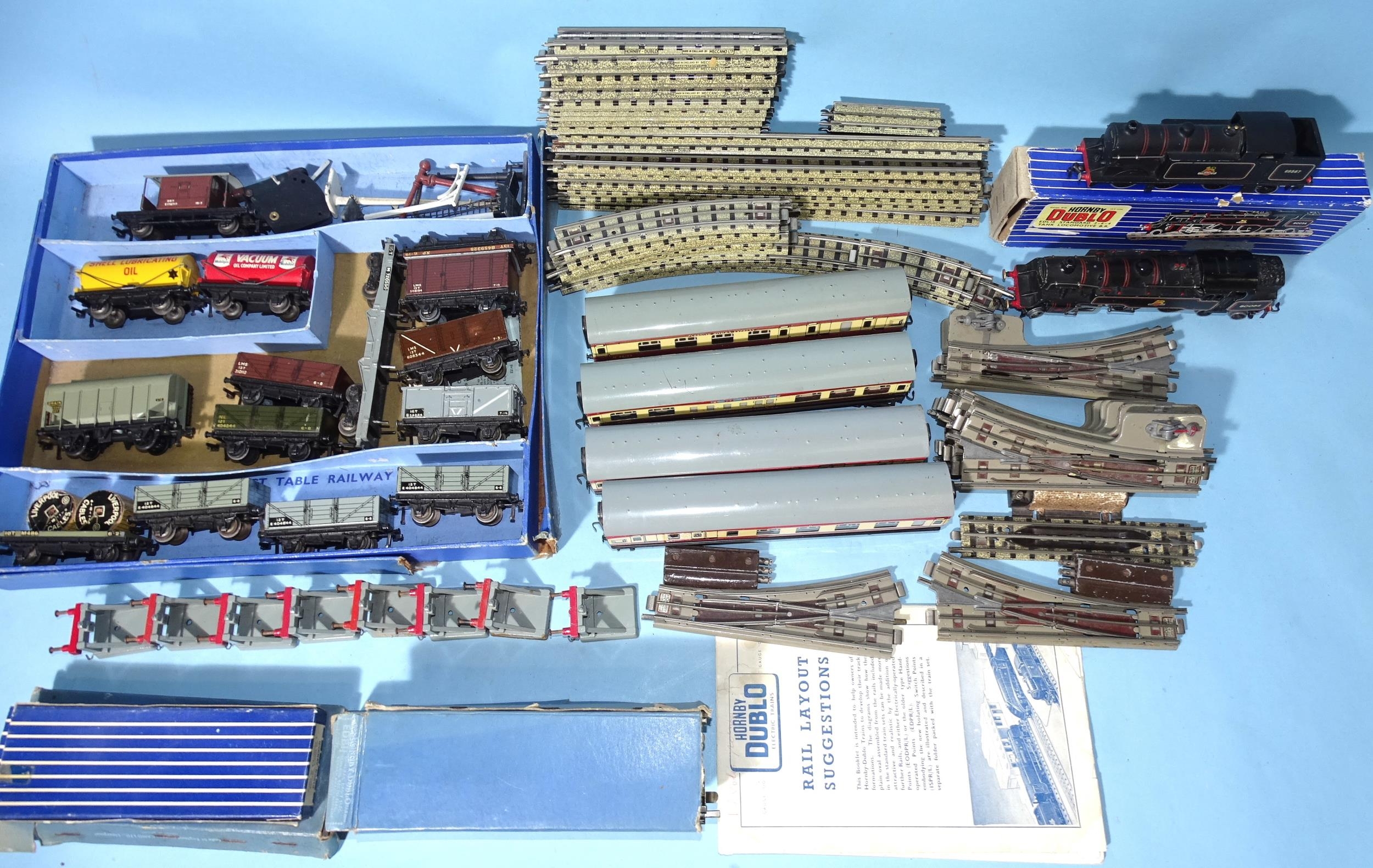 Hornby Dublo, EDL18 standard 2-6-4 tank locomotive, (lid only, lid end missing), EDL17 0-6-2 tank locomotive, four coaches, fourteen wagons and a quantity of three-rail tinplate track and accessories.