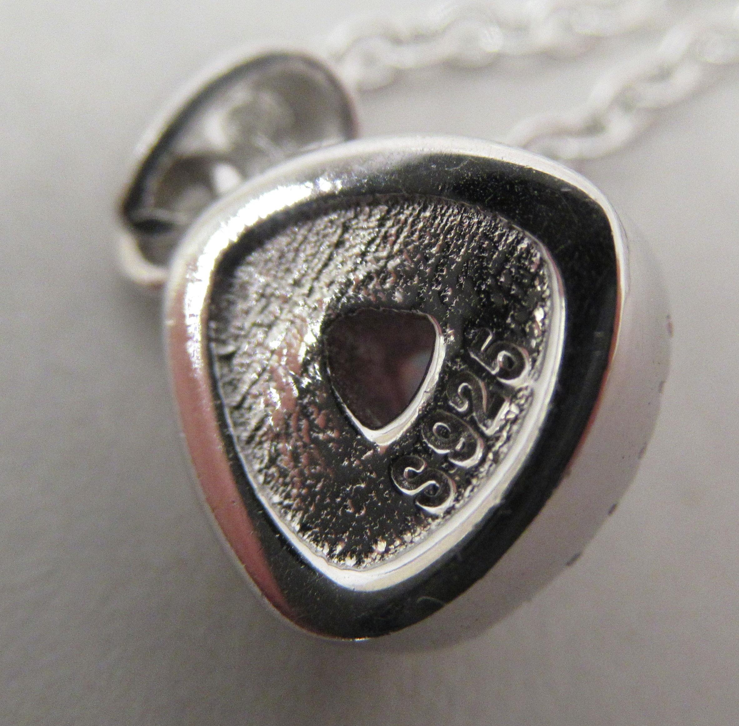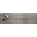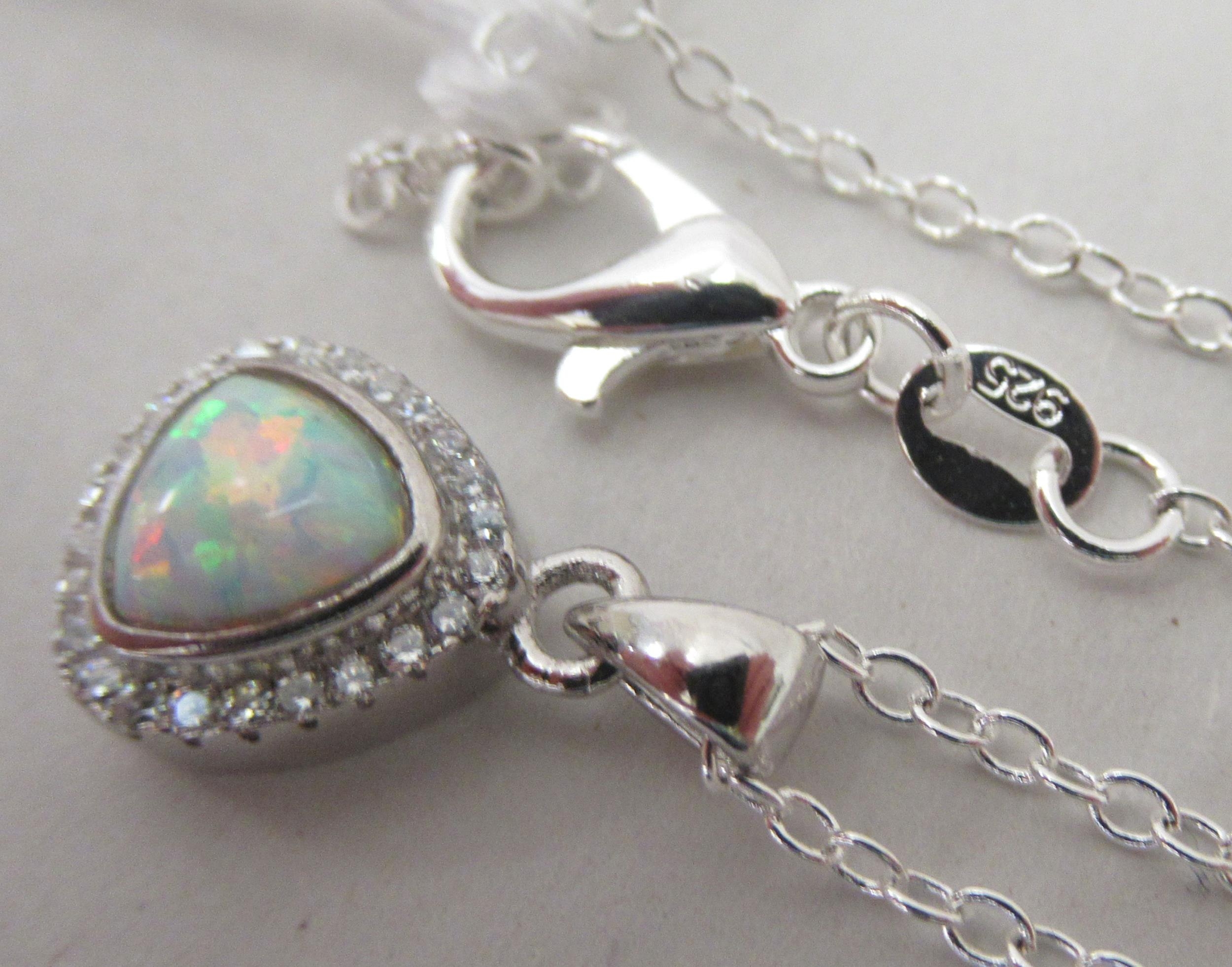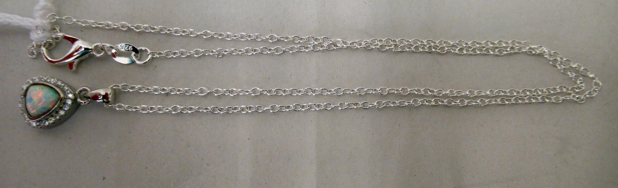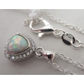 A silver coloured metal pear shaped pendant, set with an opal and cubic zirconia, on a fine neckchain