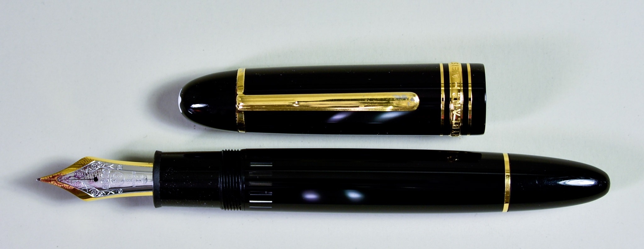 A Montblanc "Meisterstuck" No. 149 Fountain Pen, in black resin with gold band and clip detailing, nib marked 18k, 4810