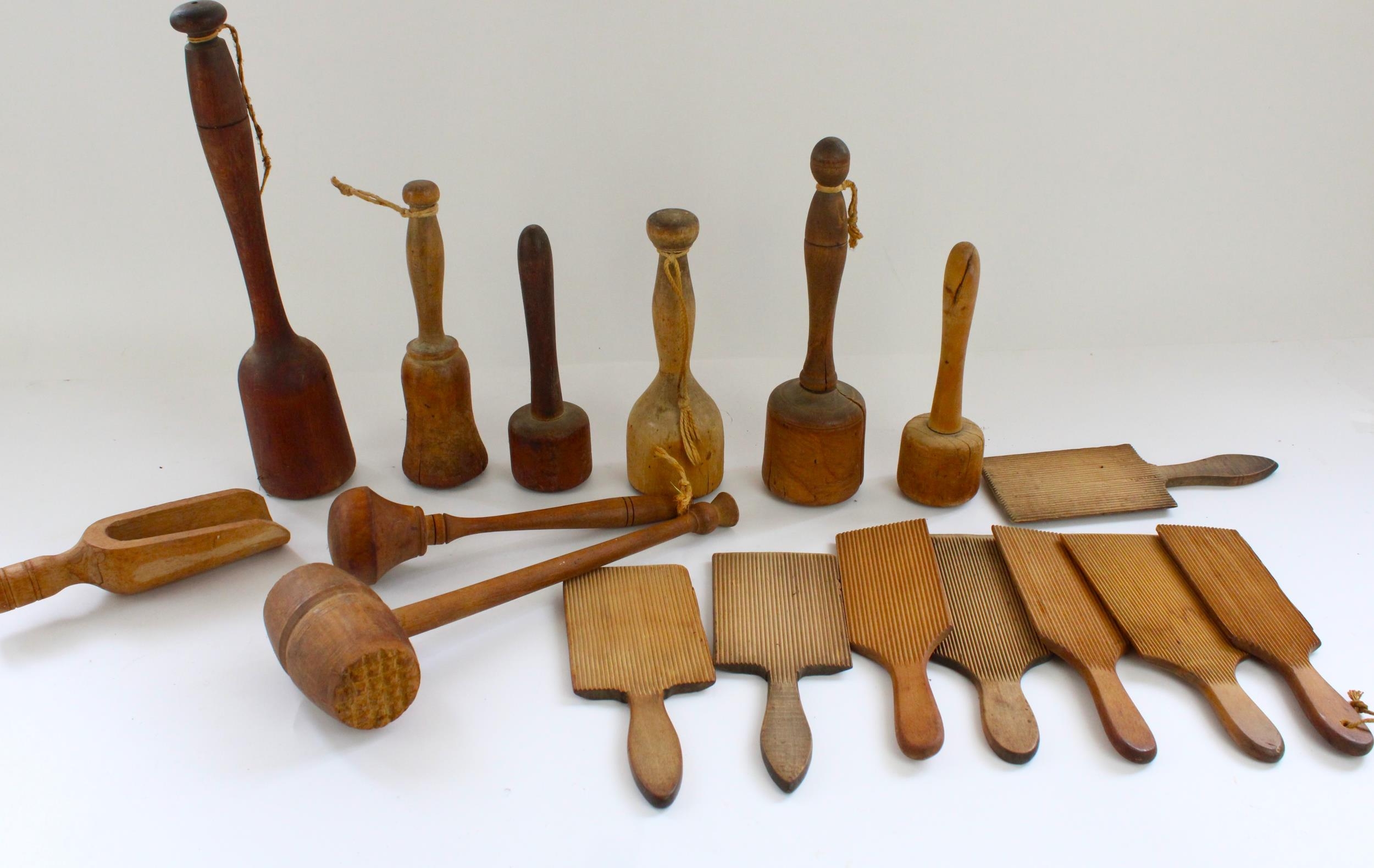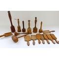 C20th treen kitchenalia incl. wooden potato mashers, butter pats etc. (qty)