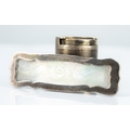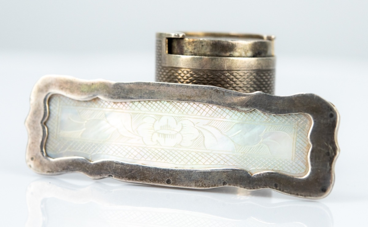 ENGINE TURNED AND TEXTURED BARK PATTERN SILVER SOVEREIGN HOLDER of typical form, 1" high (2.7cm); and a SILVER MOUNTED ENGRAVED MOTHER OF PEARL WAVY OBLONG BROOCH, 2½" x ¾" (6.2cm x 1.9cm), makers B.M., Birmingham 1981 (2)