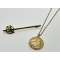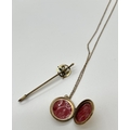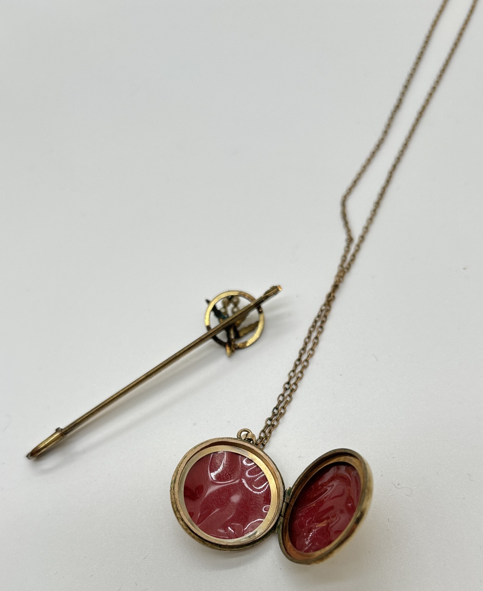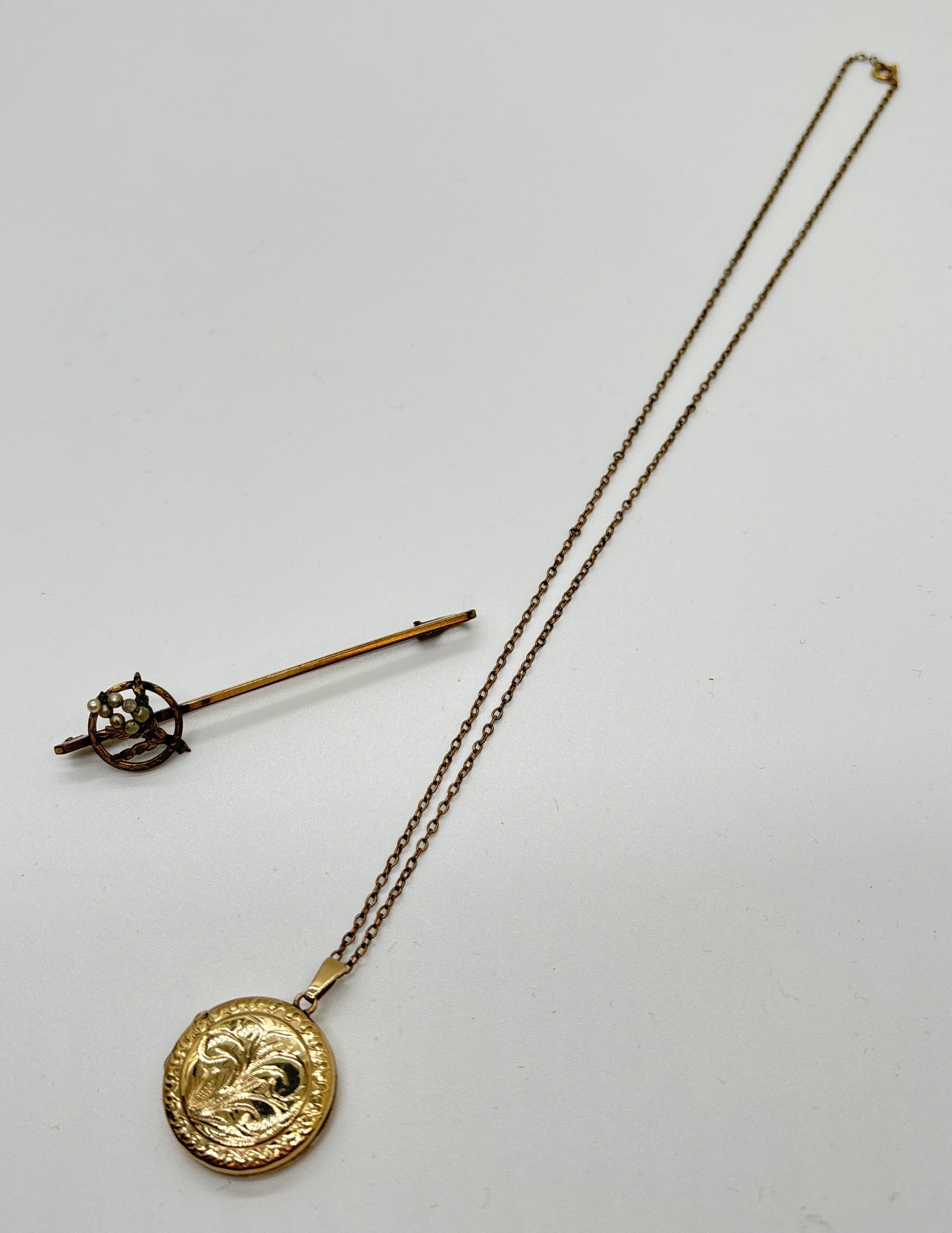 2 items of vintage rolled gold jewellery. A 2.25cm diameter circular locket with floral decoration to front, on an 18" belcher chain. Together with a bar brooch decorated with a small flower spray of faux pearls. Both pieces marked Rolled Gold.