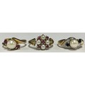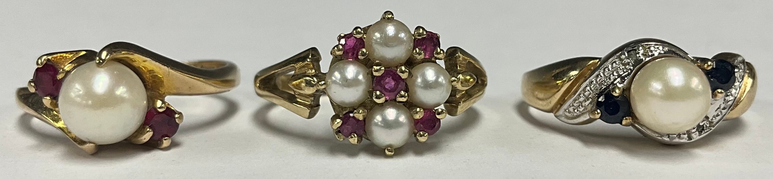 A cultured pearl, sapphire and diamond accented dress ring, 9ct gold shank, size N; others Ruby and cultured pearl, all 9ct gold shanks, size M and O, one Birmingham 1994, 8.1g gross (3)