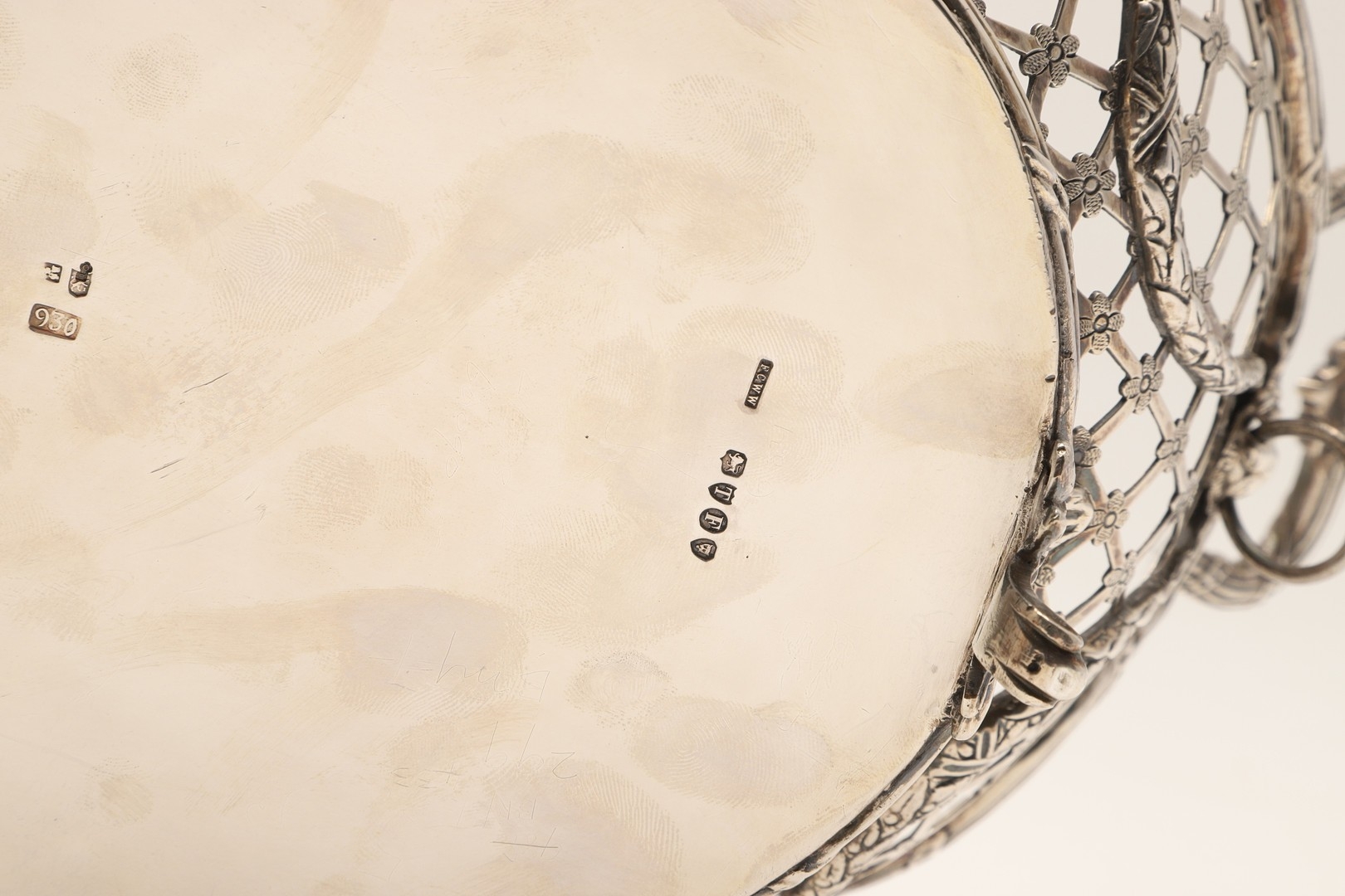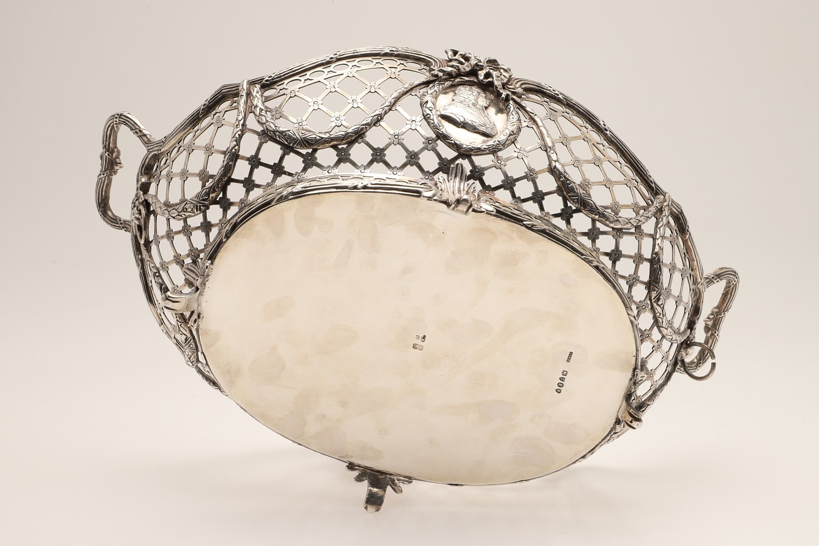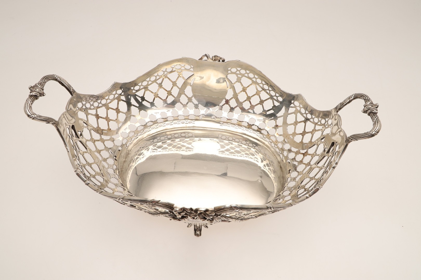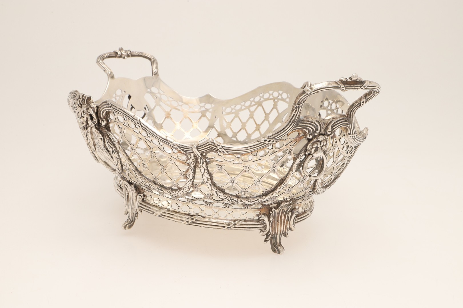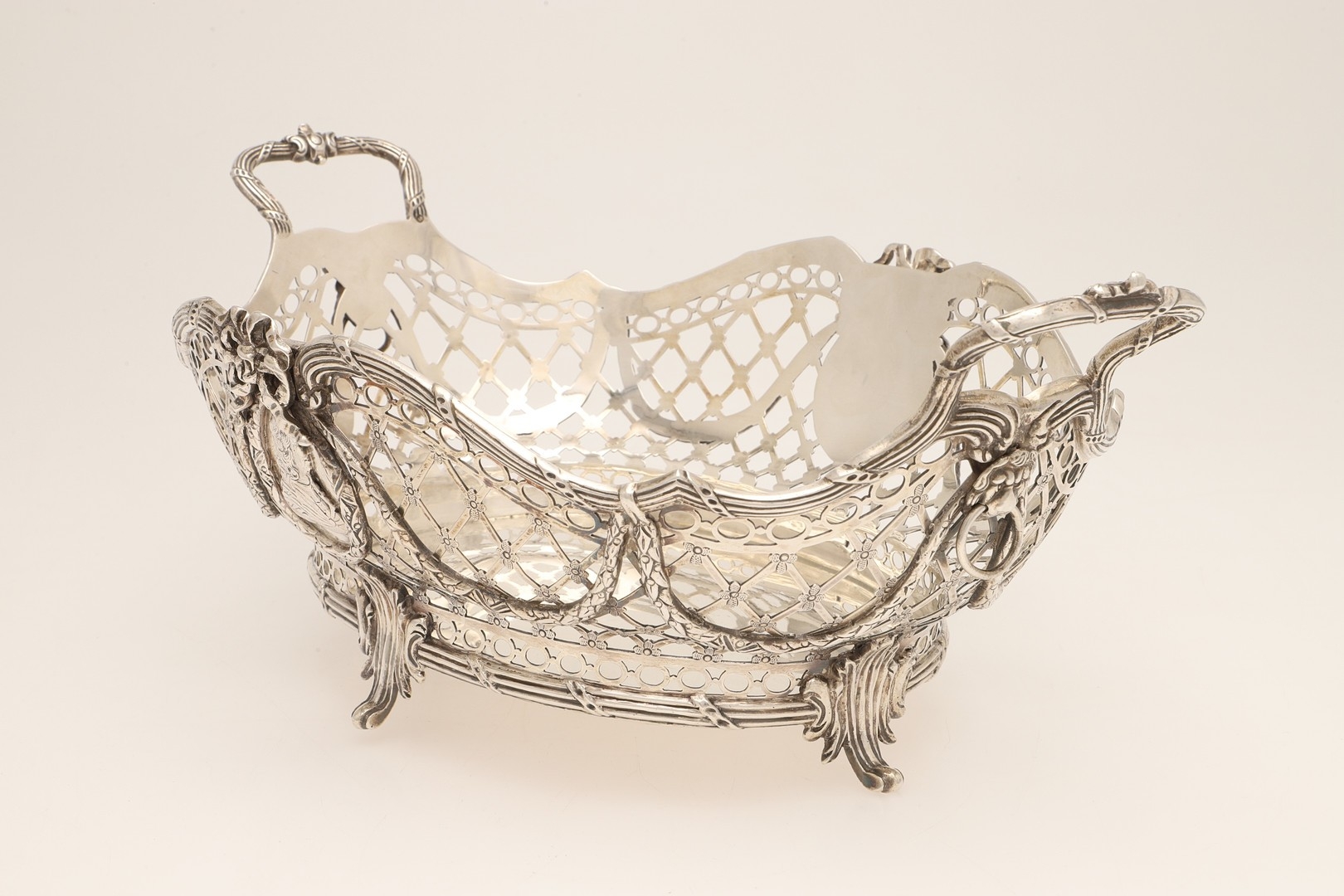 A 19TH CENTURY DUTCH SILVER TWIN HANDLED BREAD BASKET. Of shaped oval form in the Louis Seize style, with pierced decoration, festoons, medallions and lion mask rings at each end, stood on four scroll shaped supports. With Dutch Export marks for .930 fineness and British import hallmarks for Frederick Carel William Wagner, London, 1894, F (Foreign). Height 17cm x Width 41cm x Depth 26.5cm, Weight 52.7ozt.