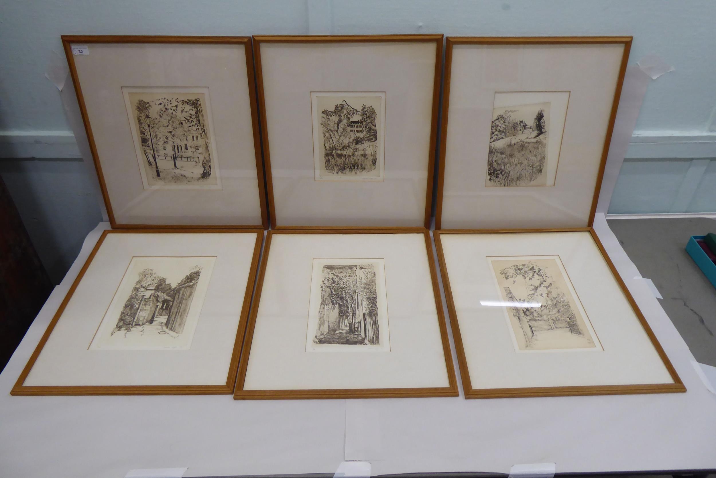 Six works after Matthew Wright - mainly street scenes monochrome prints bears pencil signatures 7" x 10" framed
