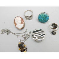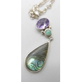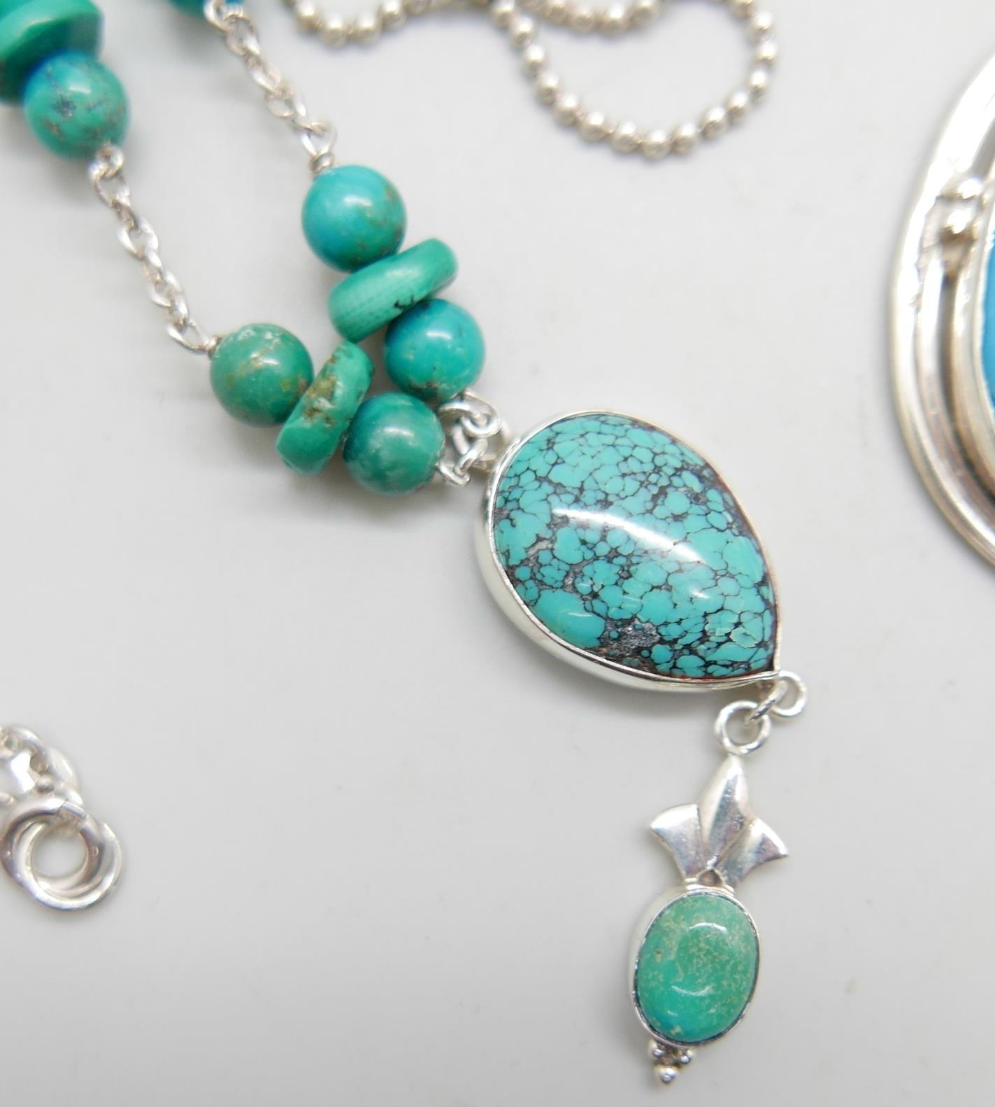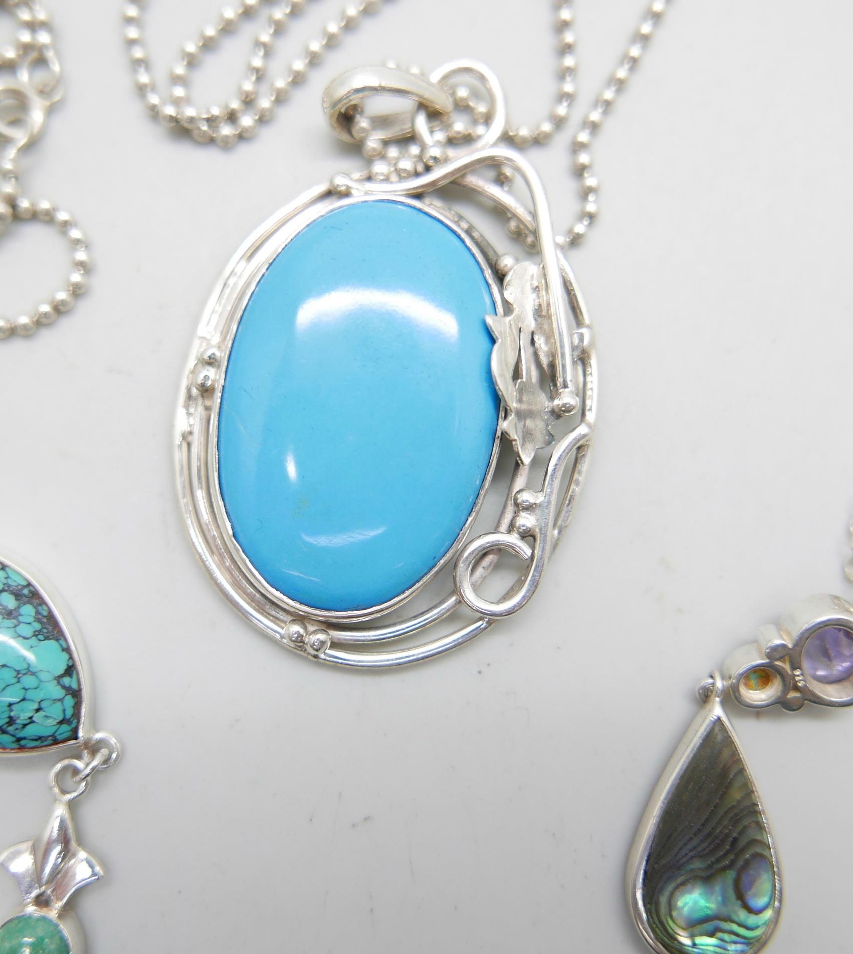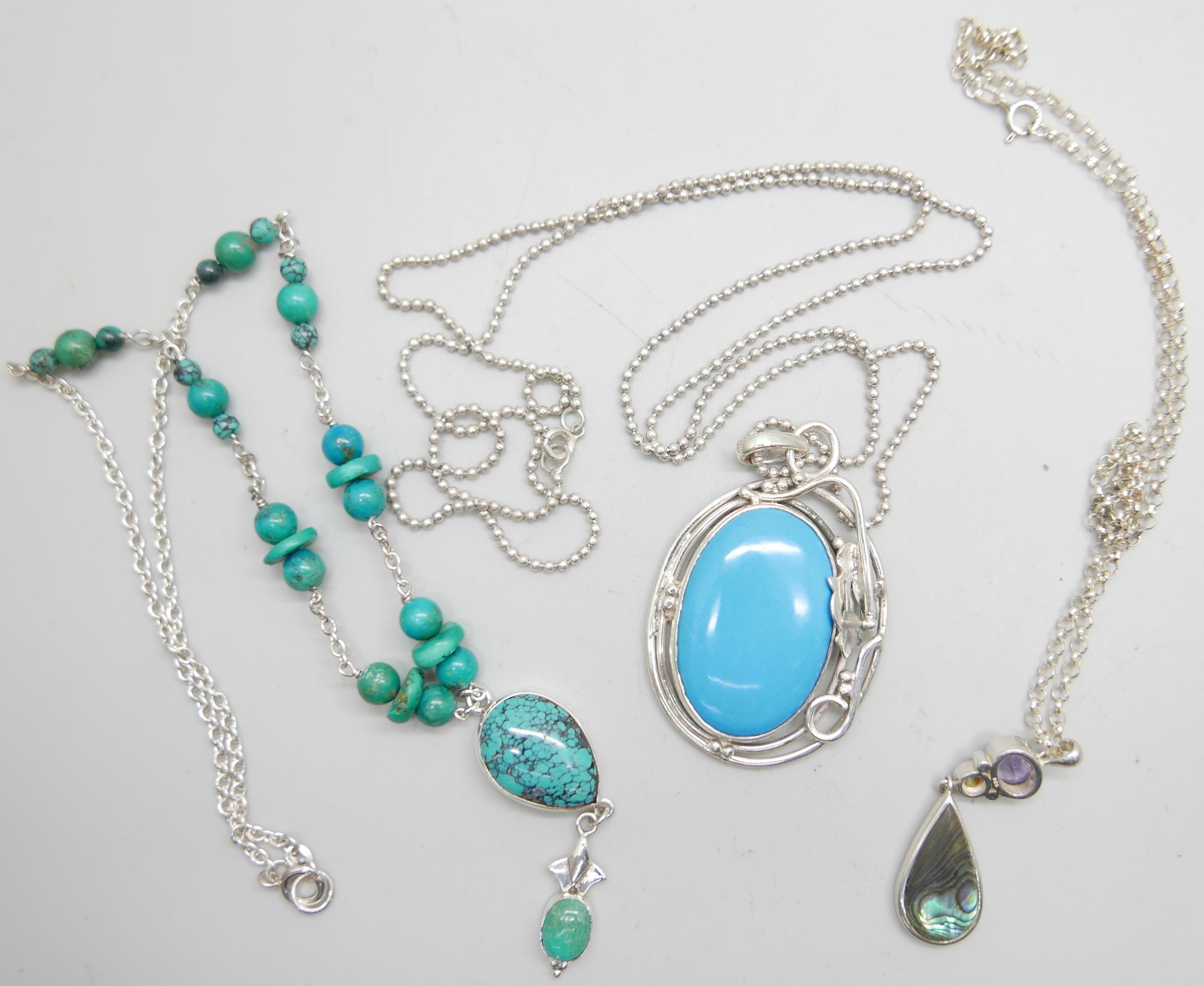 A silver and stone set necklet, and two silver pendants and chains, largest pendant 6cm including bale, 47g