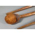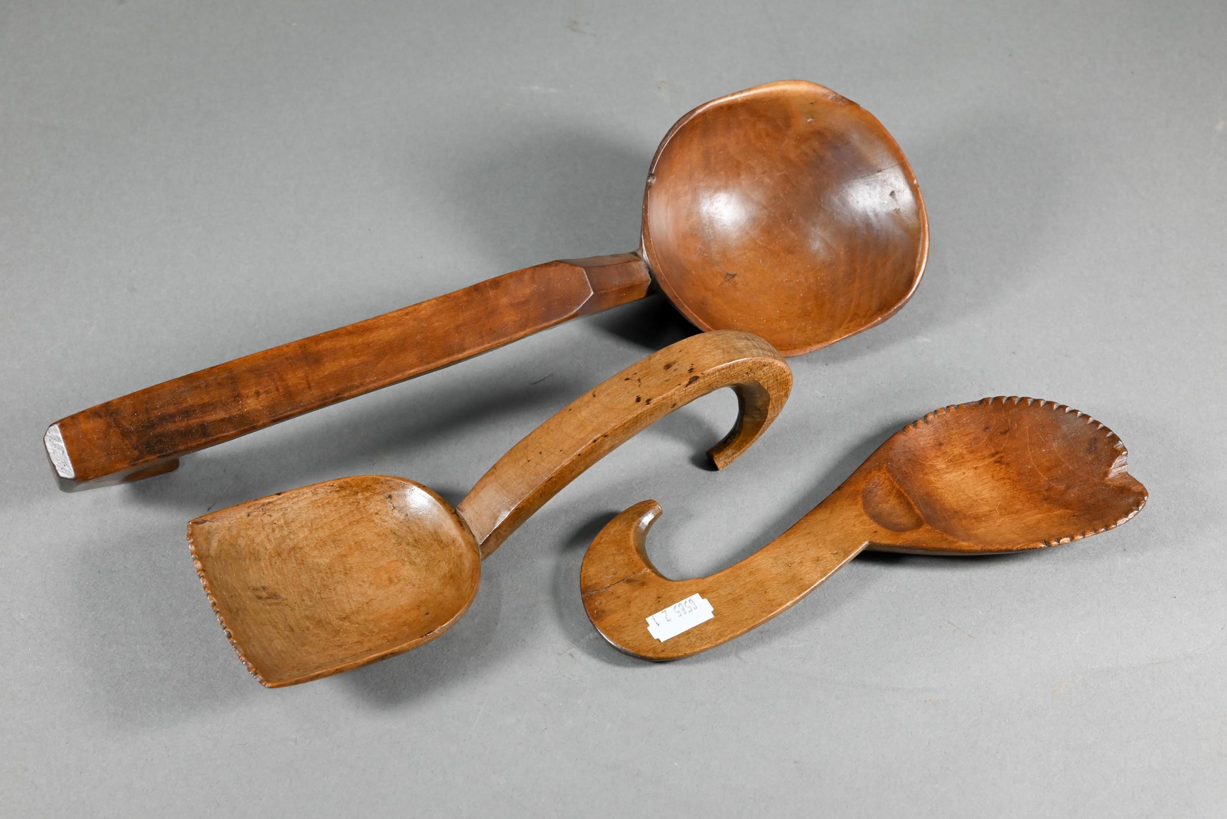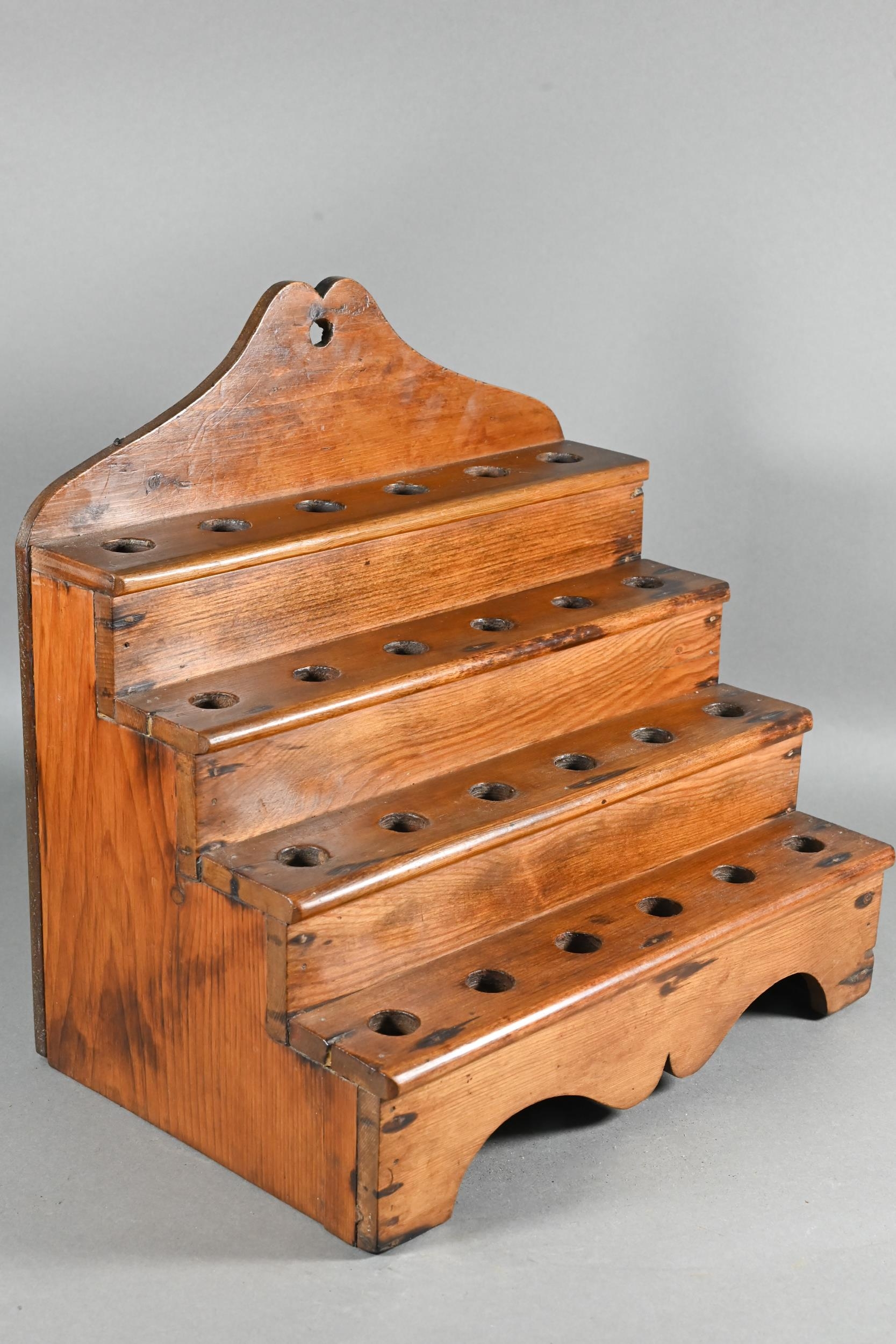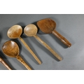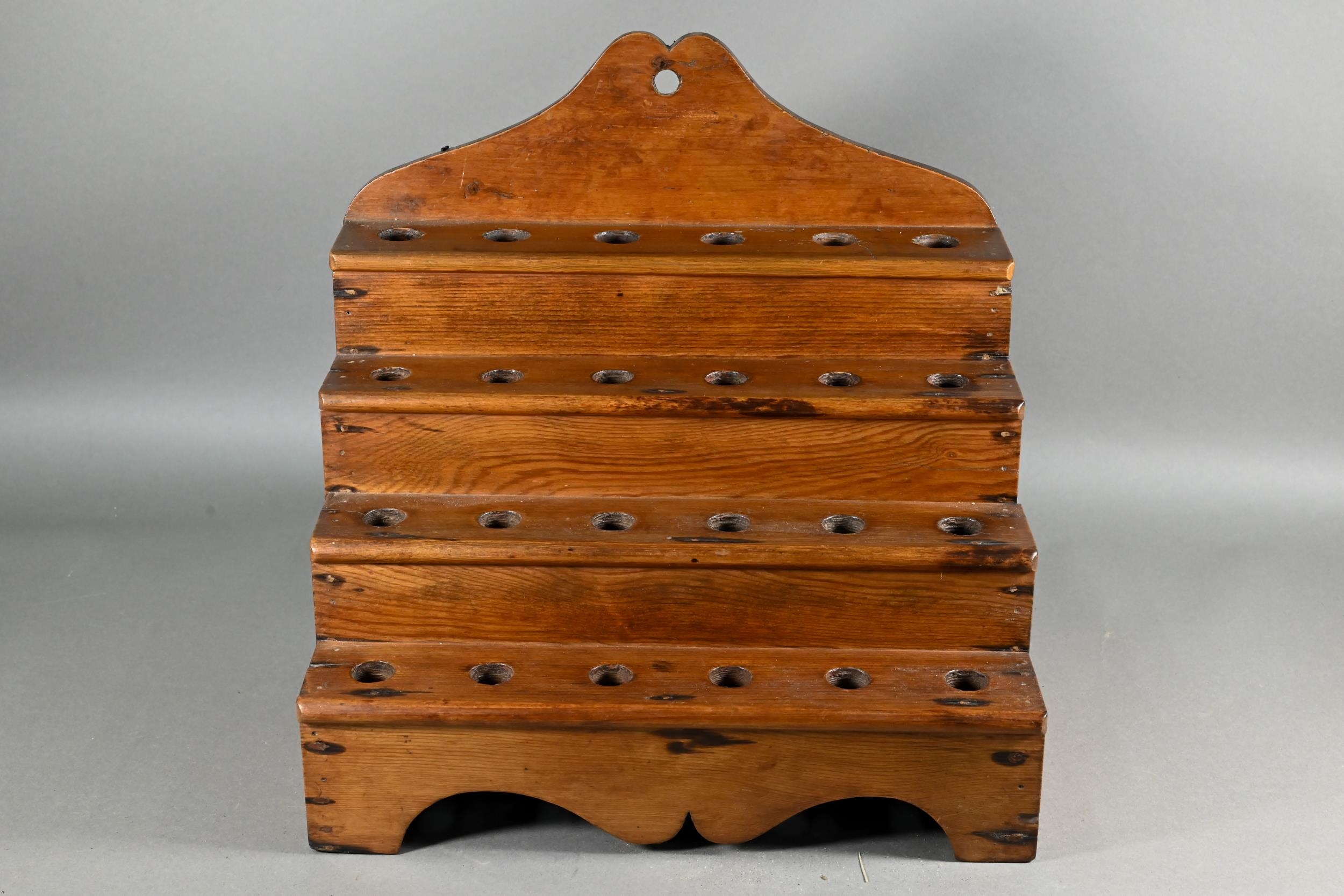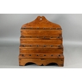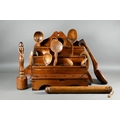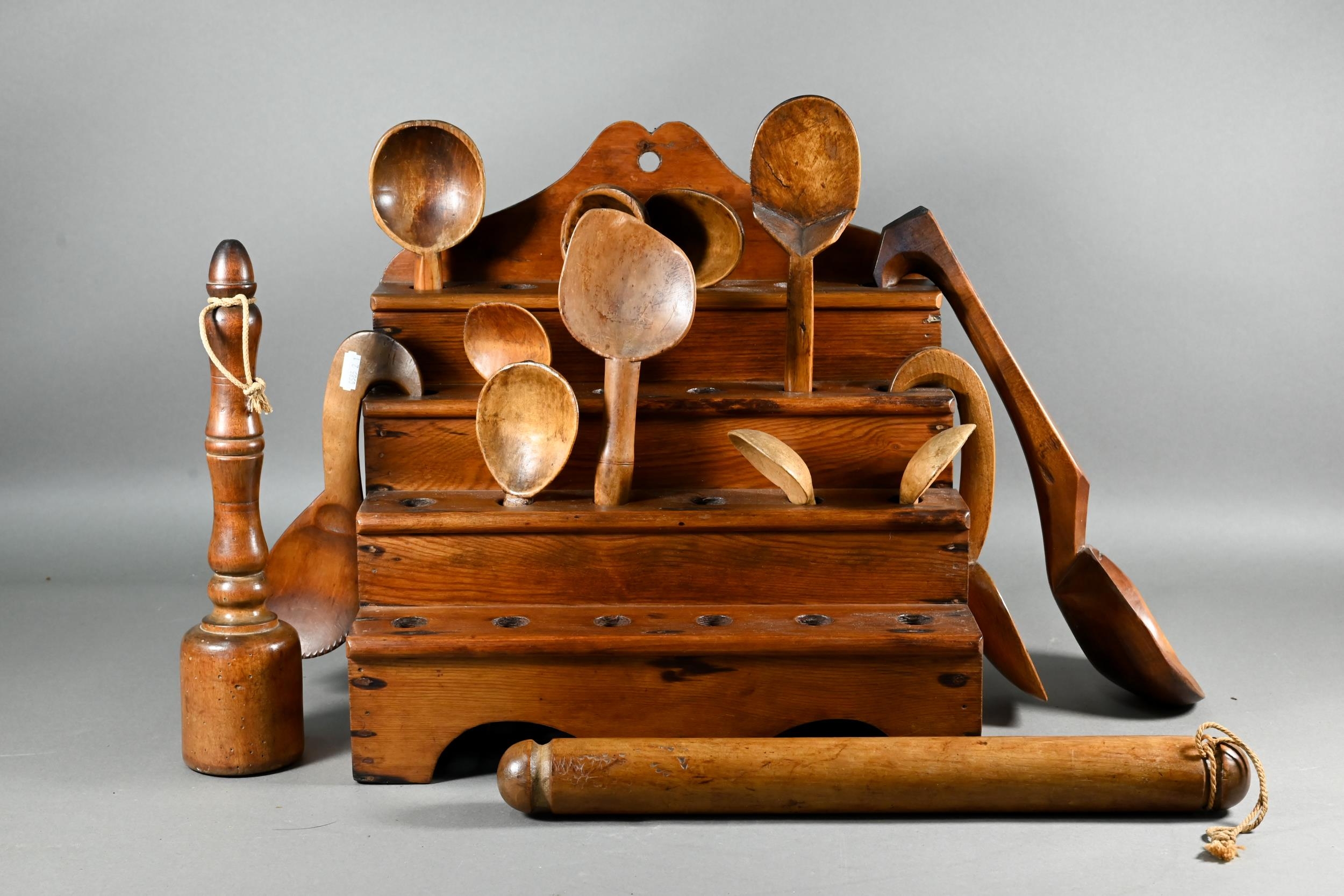 An antique Welsh stepped four tier spoon rack, with shaped top for hanging, 35.5 cm x 23.5 cm x 36 cm h to/w a collection of fourteen assorted carved and shaped spoons, a ladle, rolling pin, turned mallet