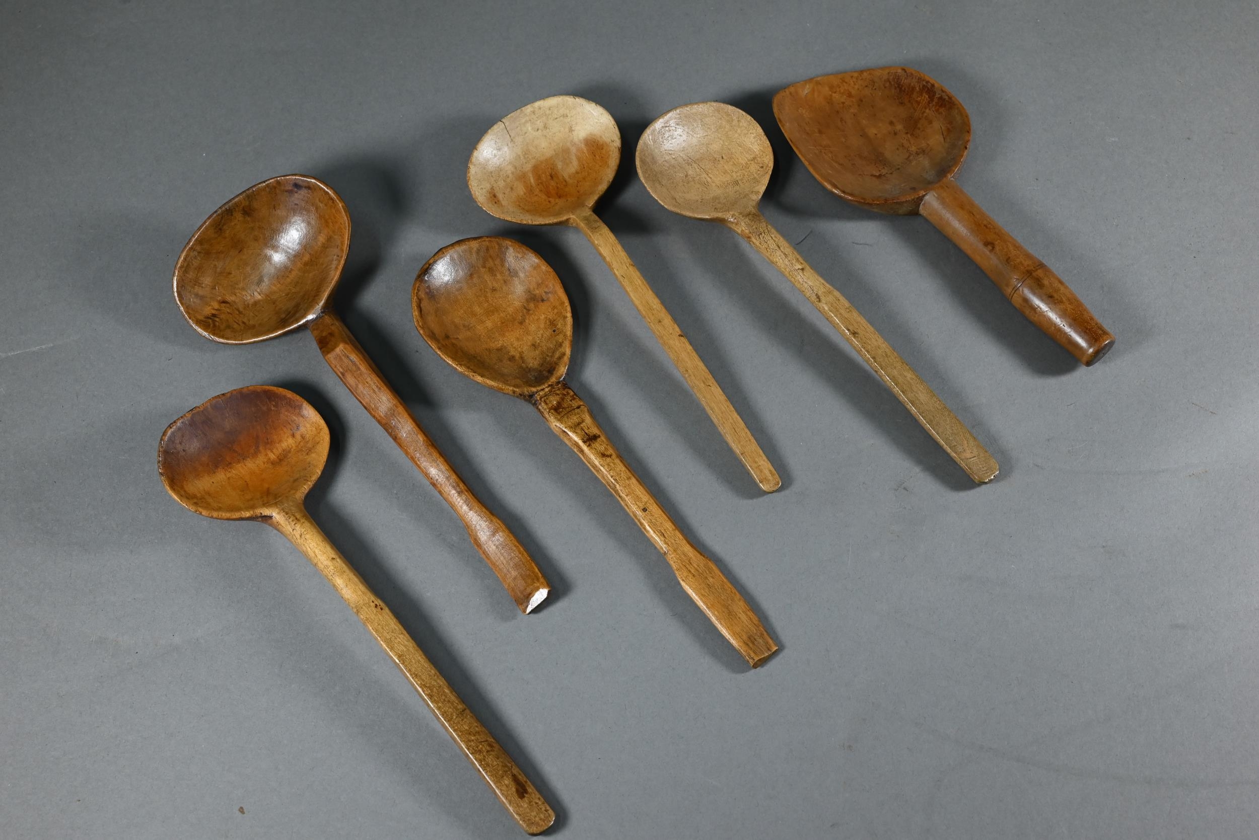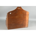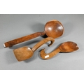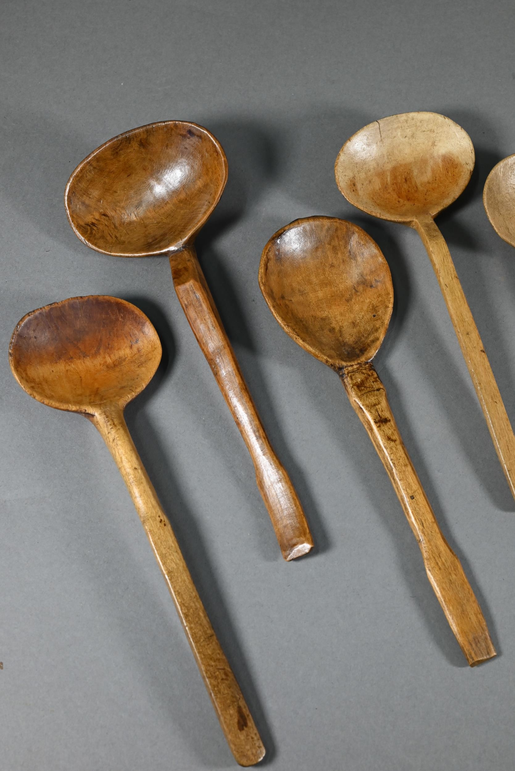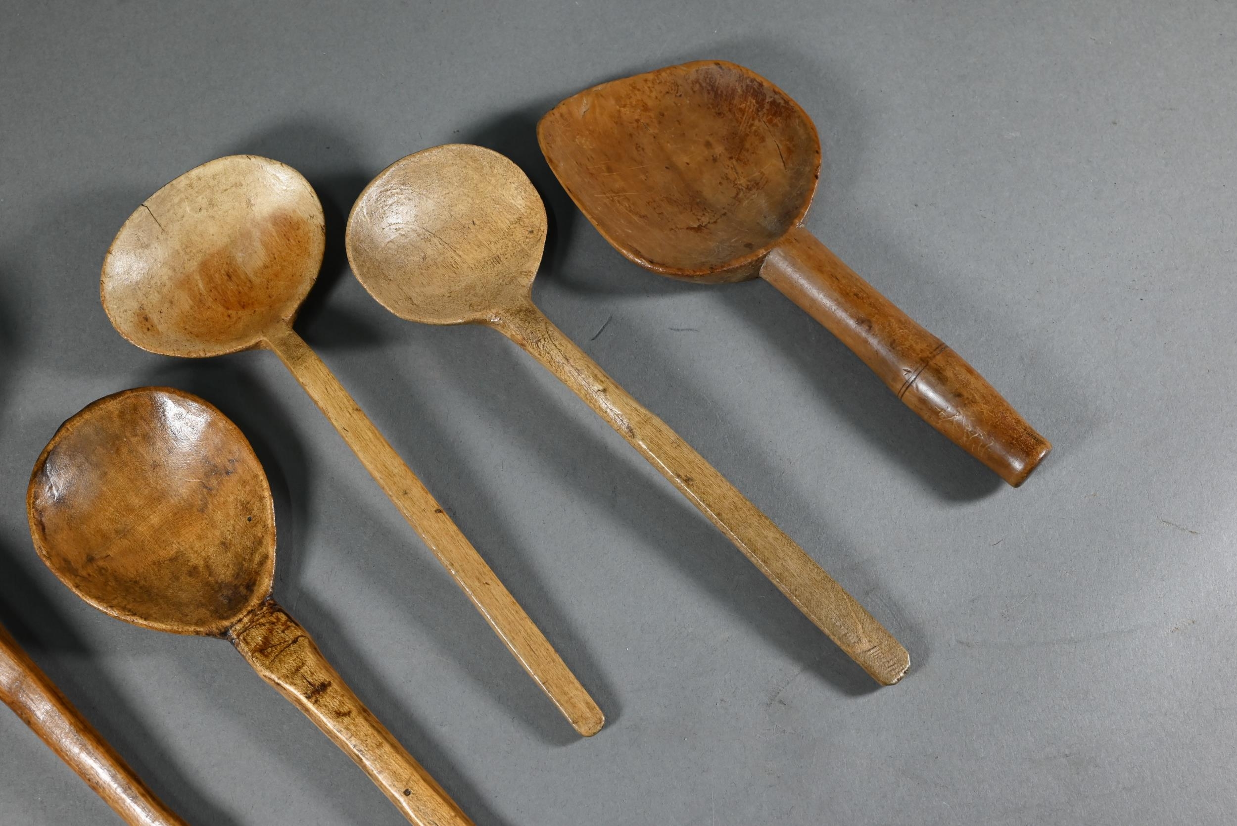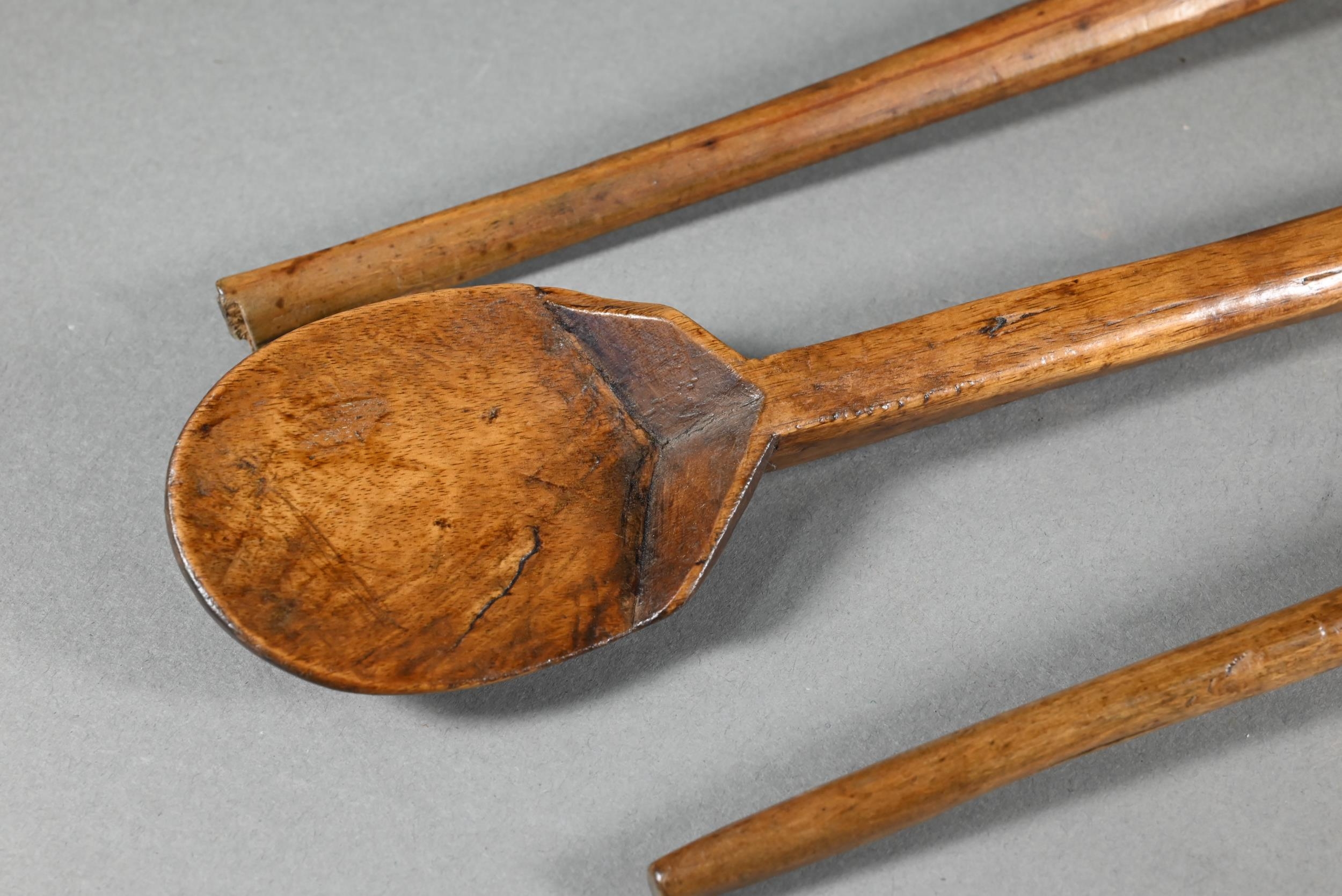 An antique Welsh stepped four tier spoon rack, with shaped top for hanging, 35.5 cm x 23.5 cm x 36 cm h to/w a collection of fourteen assorted carved and shaped spoons, a ladle, rolling pin, turned mallet
