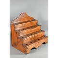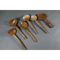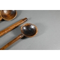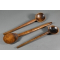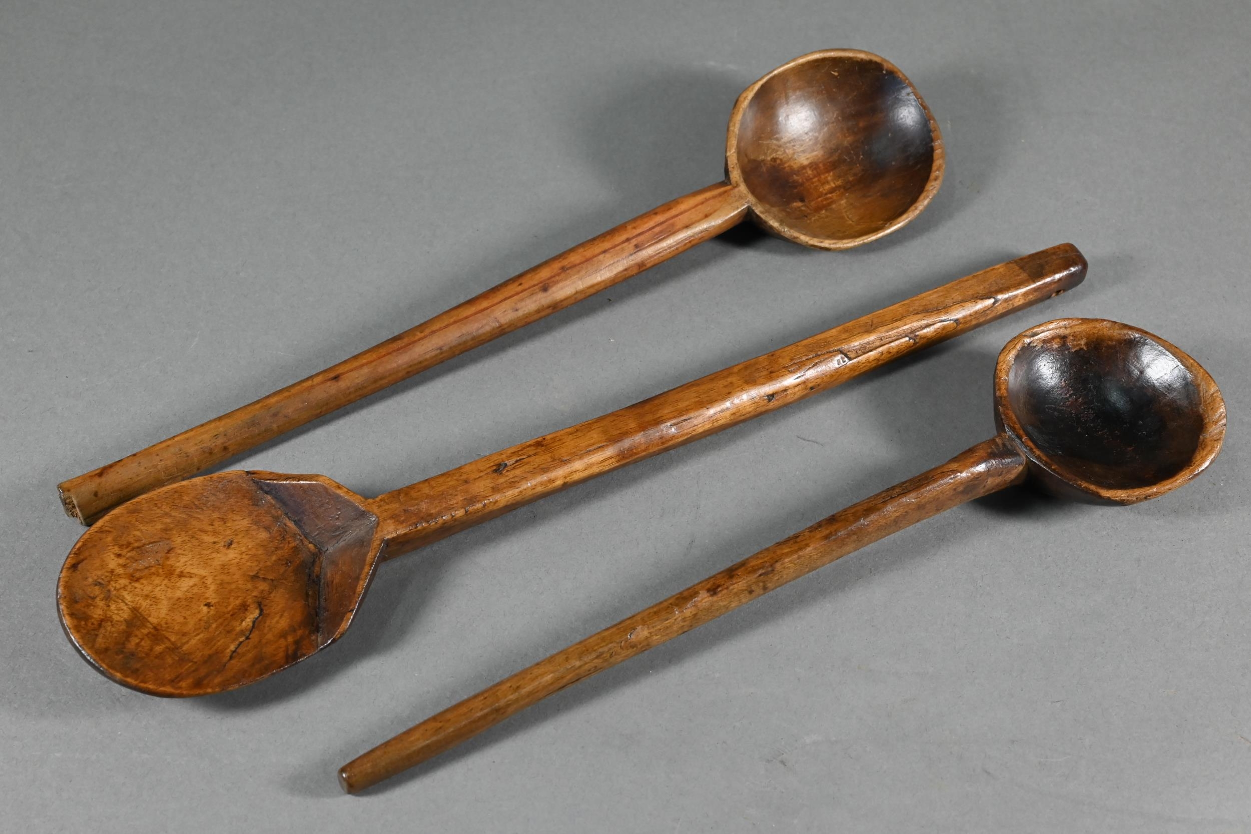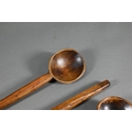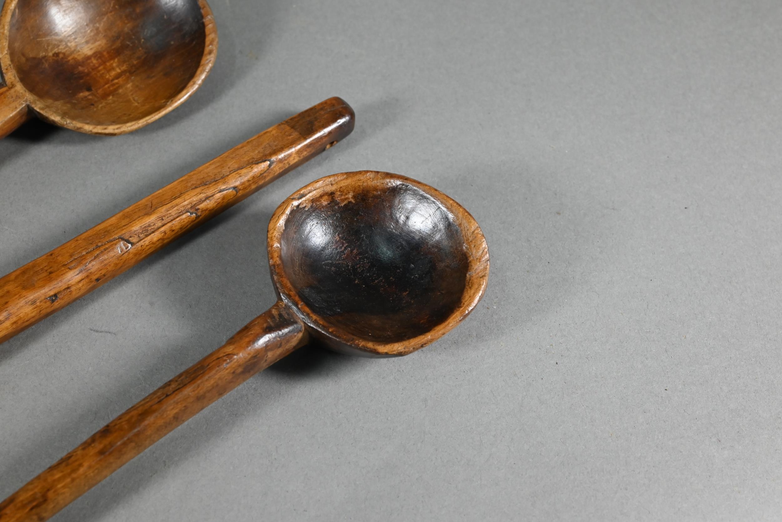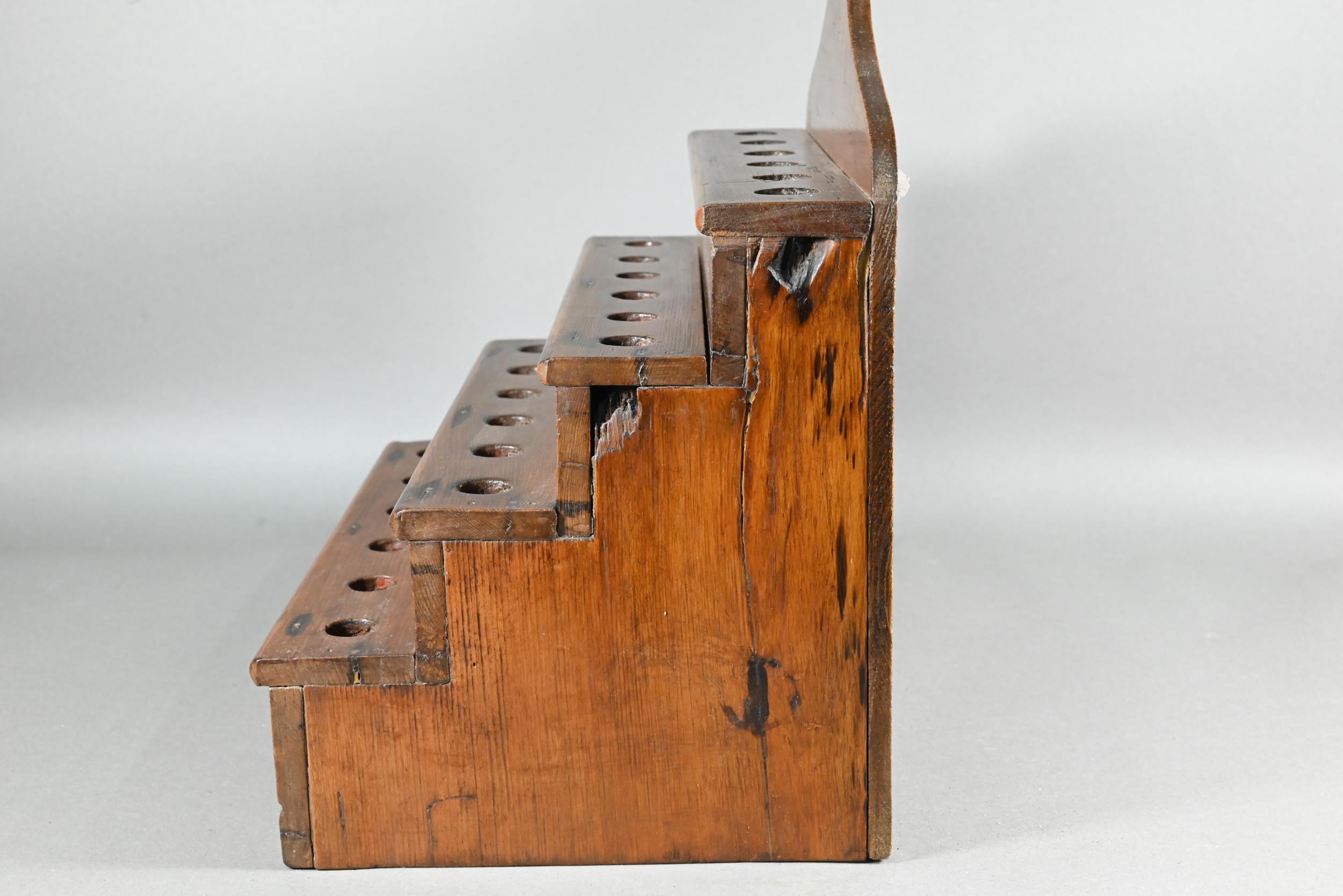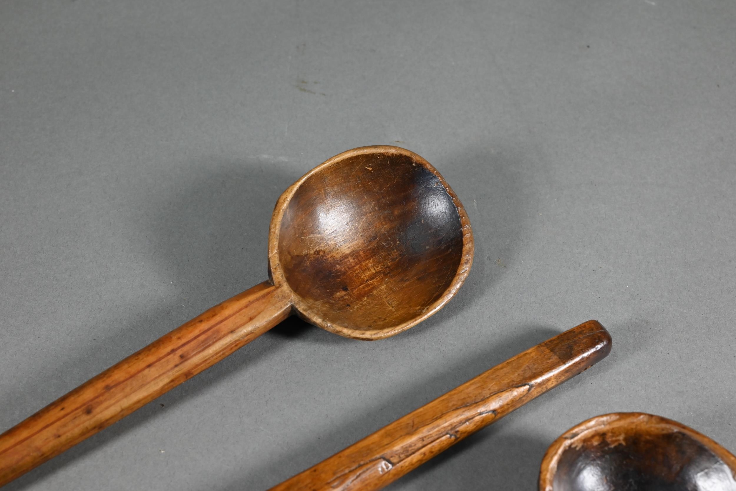 An antique Welsh stepped four tier spoon rack, with shaped top for hanging, 35.5 cm x 23.5 cm x 36 cm h to/w a collection of fourteen assorted carved and shaped spoons, a ladle, rolling pin, turned mallet