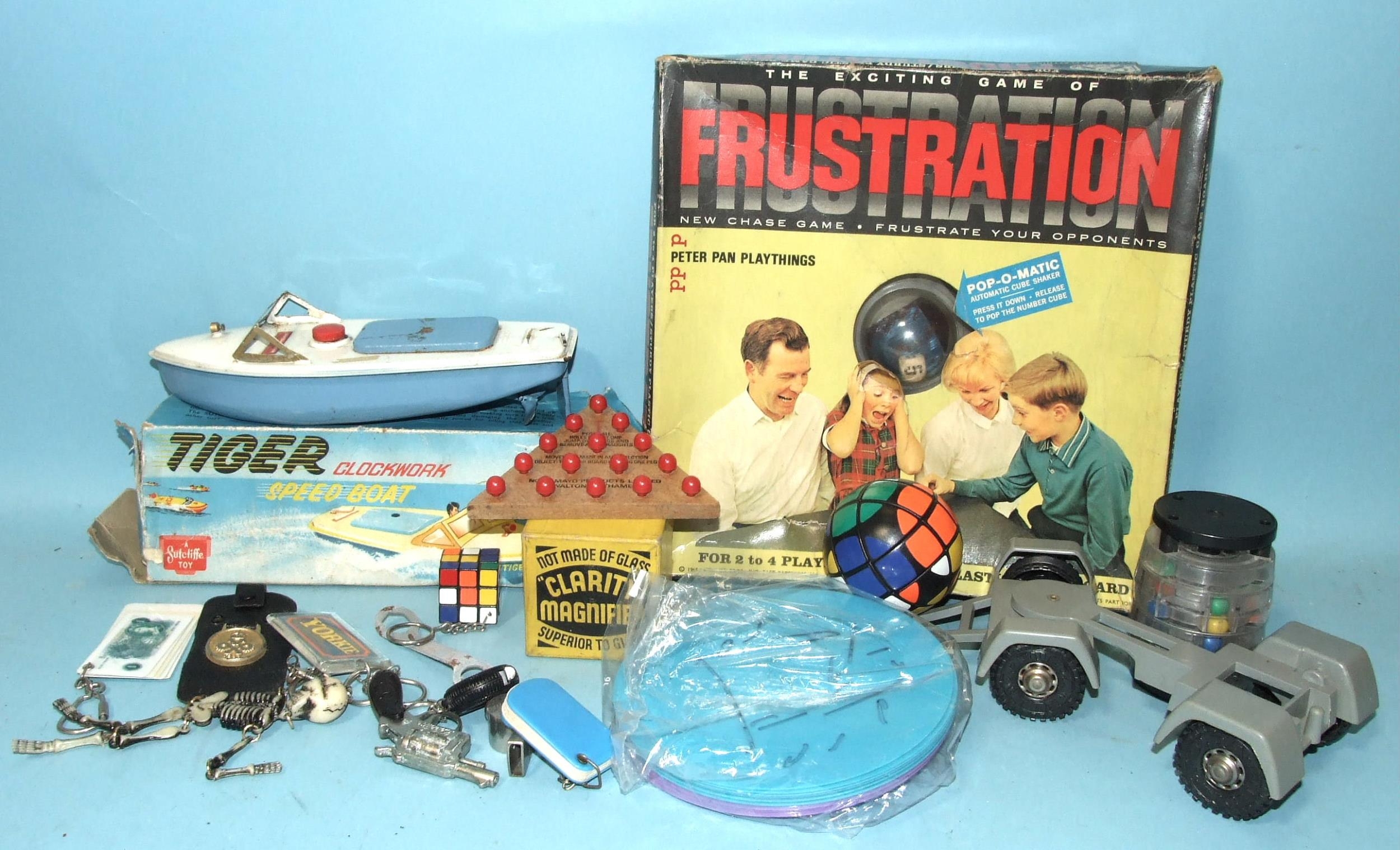 A Sutcliffe c/w Tiger speedboat, boxed, a "Frustration" game, boxed and other items.