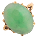 A Chinese 18ct gold jade dress ring, set with oval cabochon jade, jade measures approx 15.0 x 10.9 x 3.5mm, size J, 3.1g