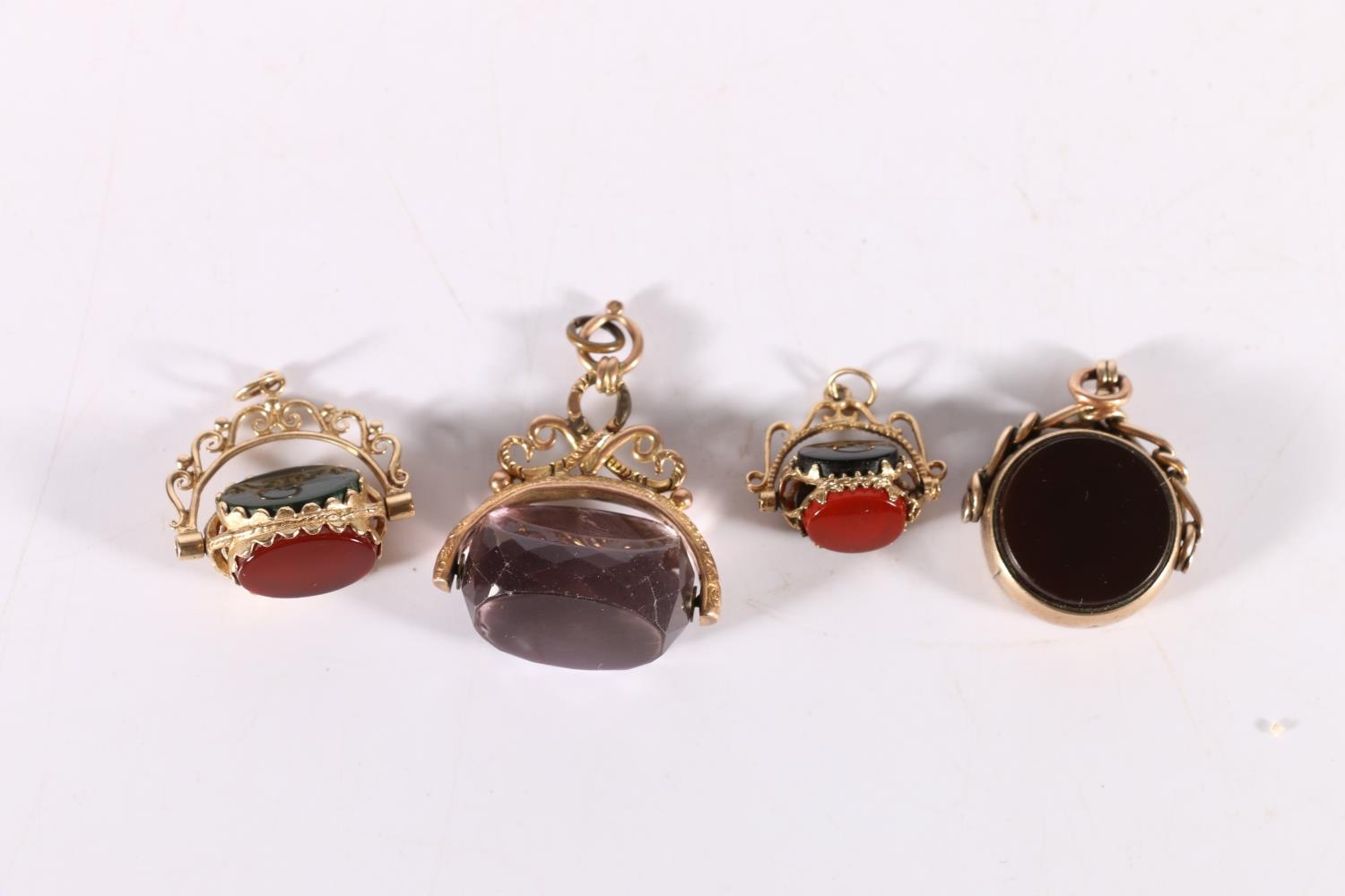 Four 9ct gold mounted bloodstone, agate or amethyst swivel fobs, 23.7g gross