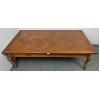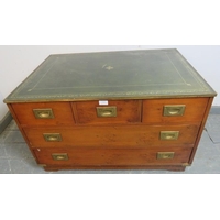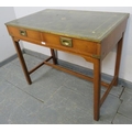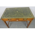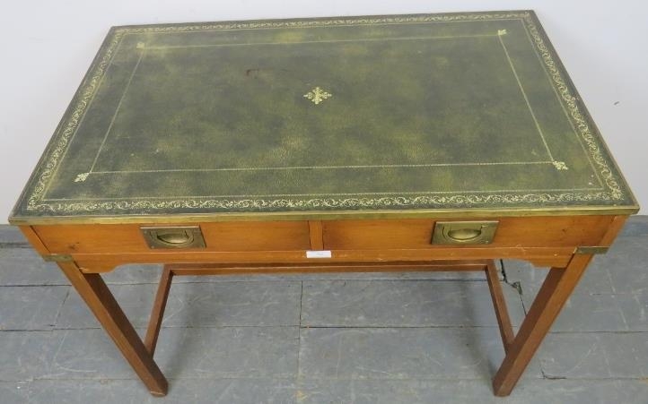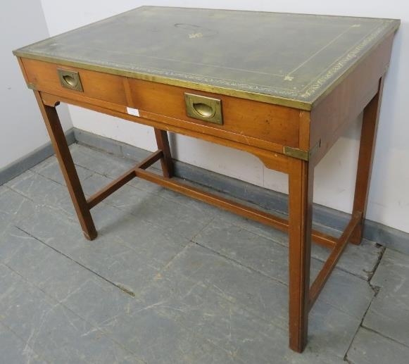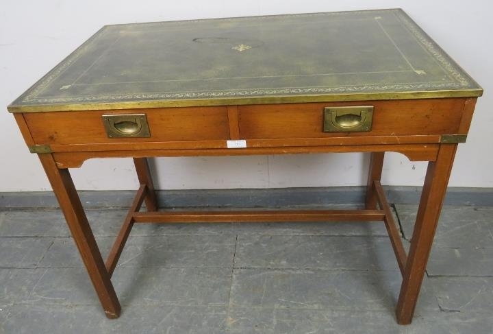 A vintage yew wood brass bound campaign style desk, with inset green leather gilt tooled writing surface, housing two short drawers with brass campaign handles, on square supports with a ‘H’ stretcher. H74 W91 D55 (approx).