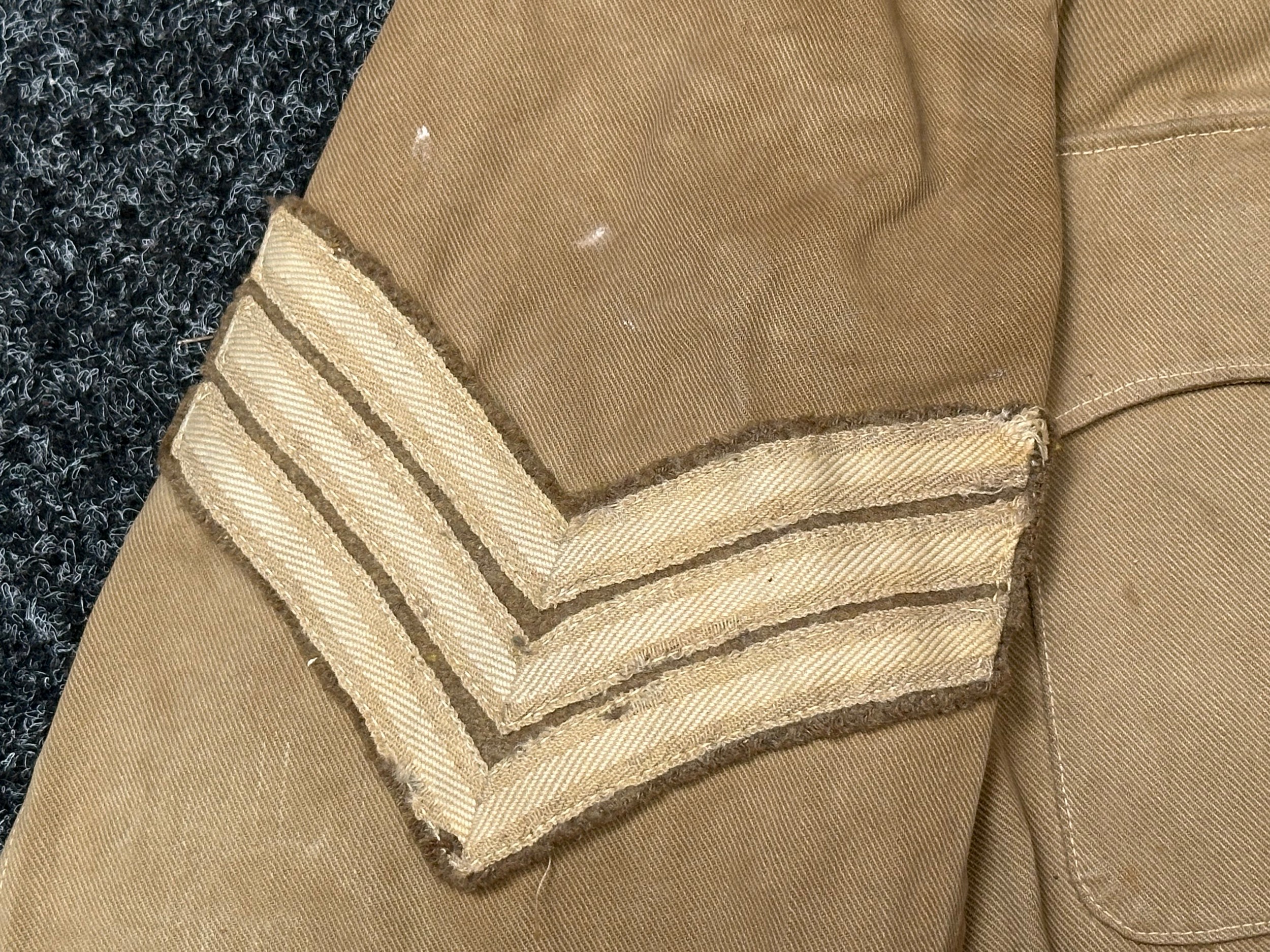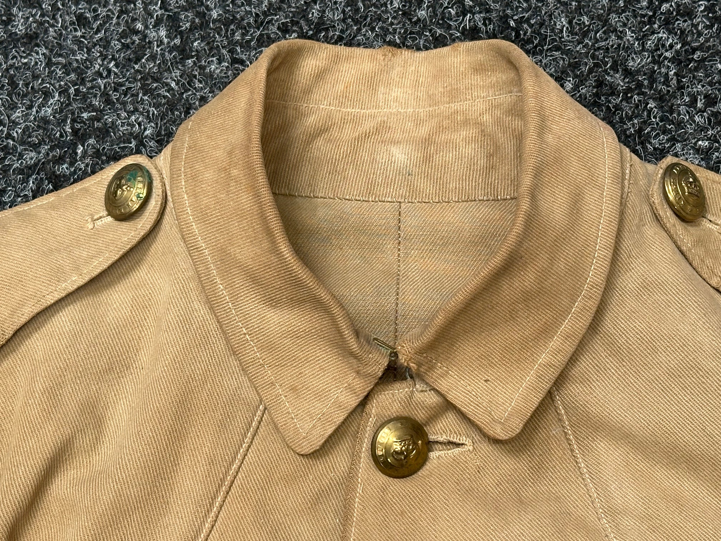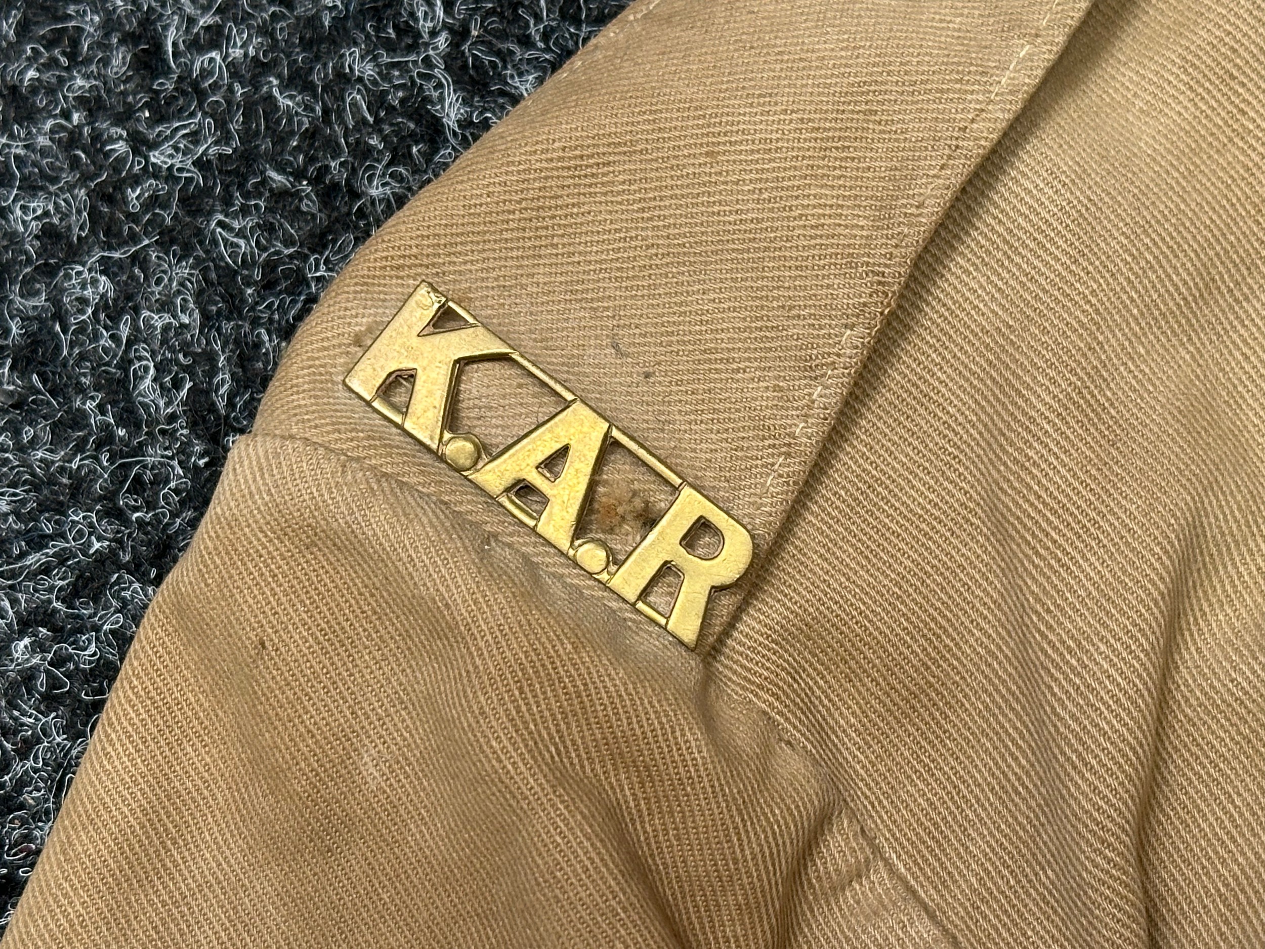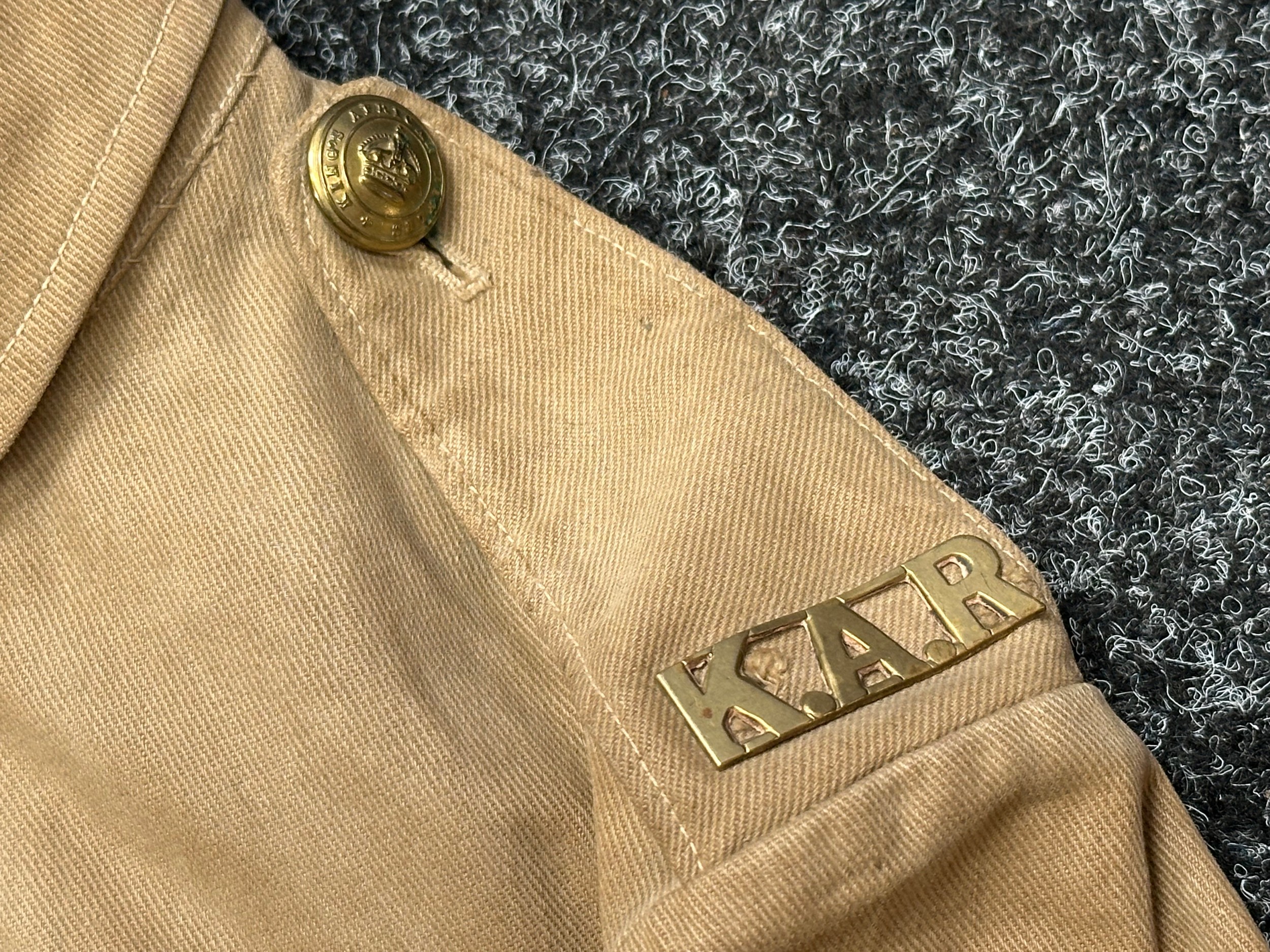 WW1 British Khaki Drill Tunic Sgt Kings African Rifles complete with original buttons, brass shoulder titles and Sgt's rank insignia to sleeve. Small size approx. 32 inch chest.
