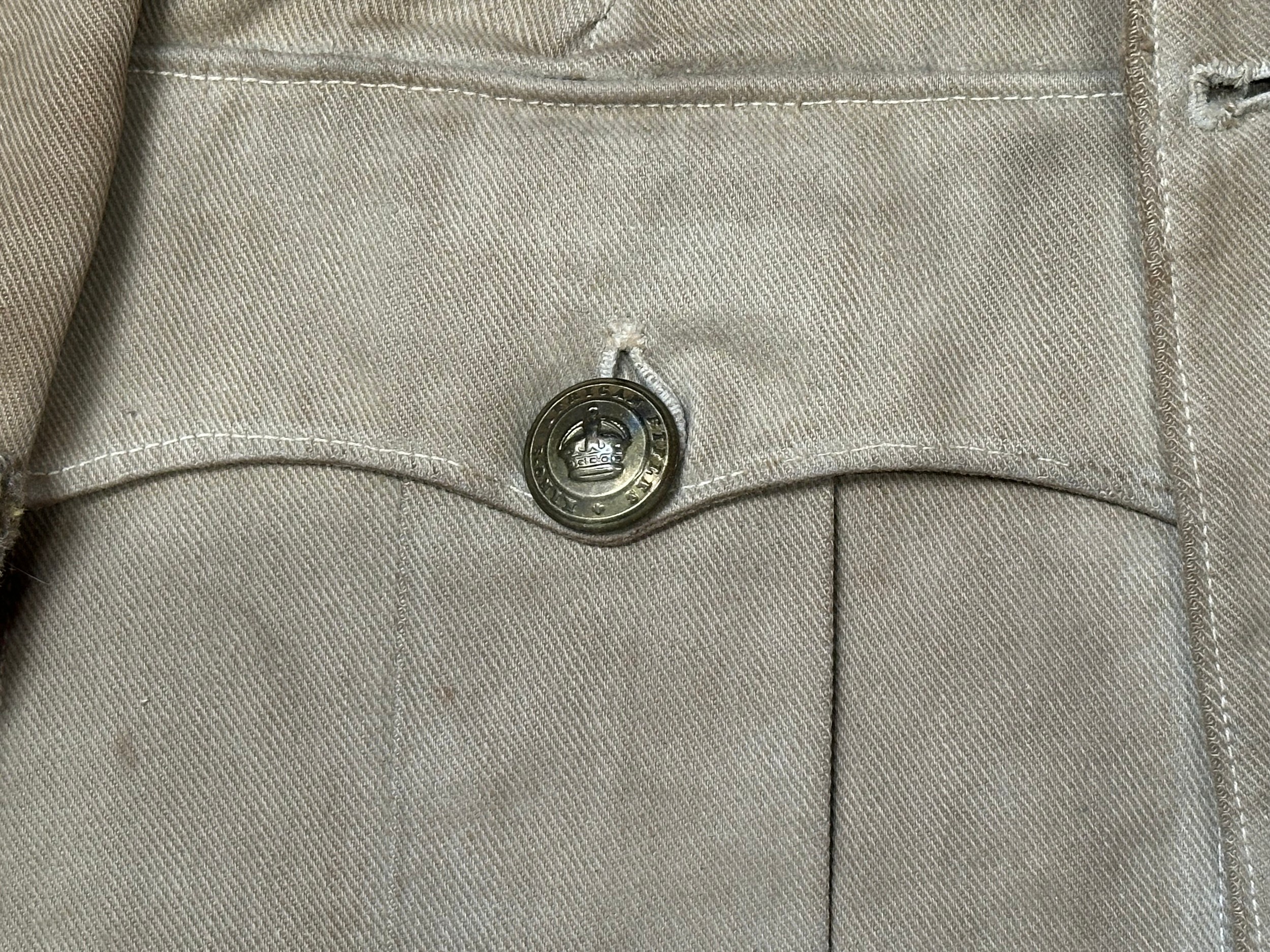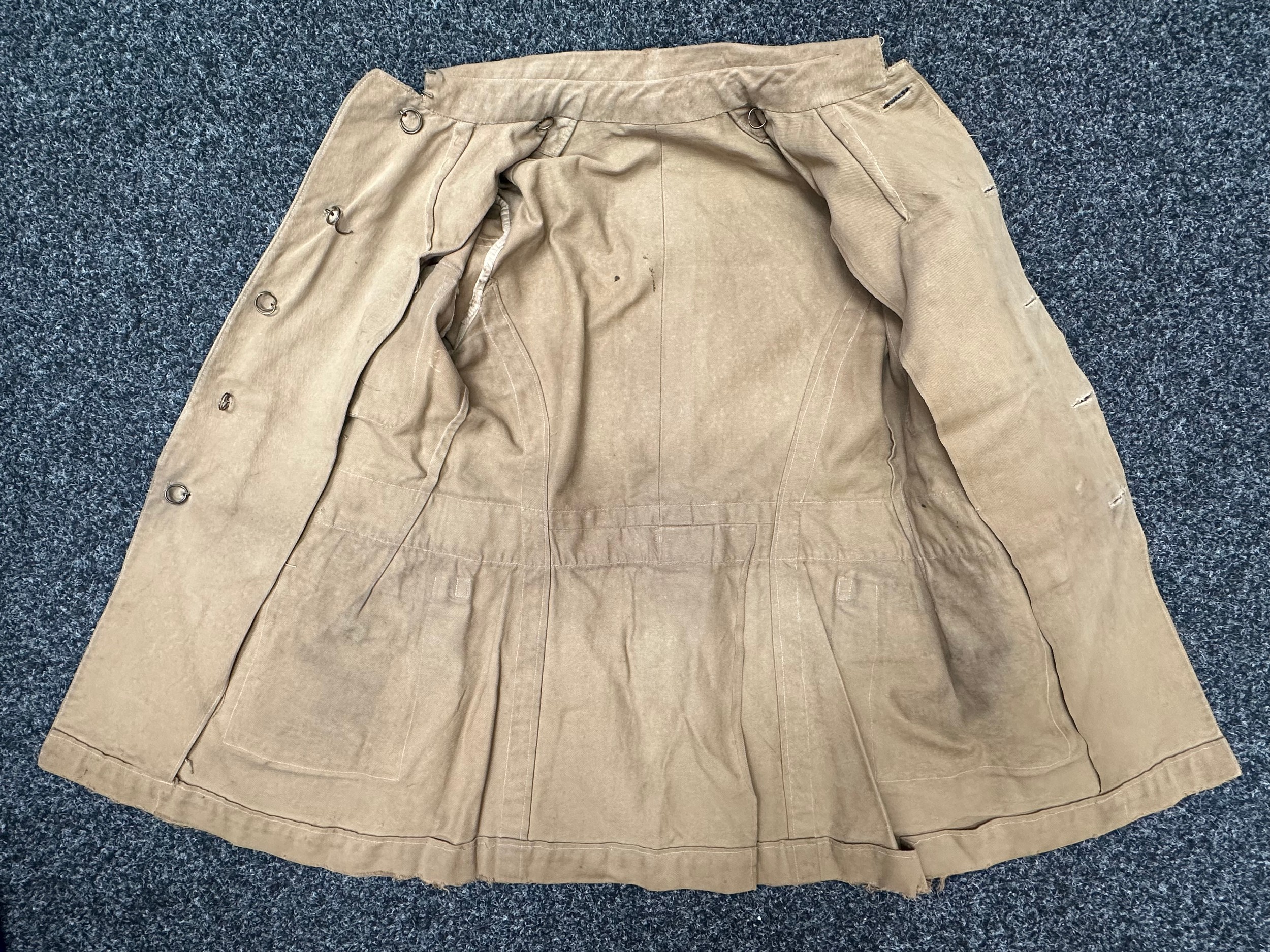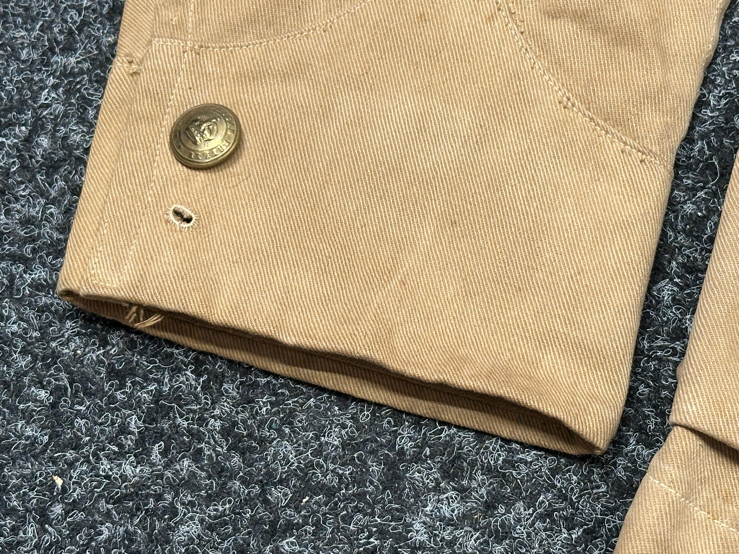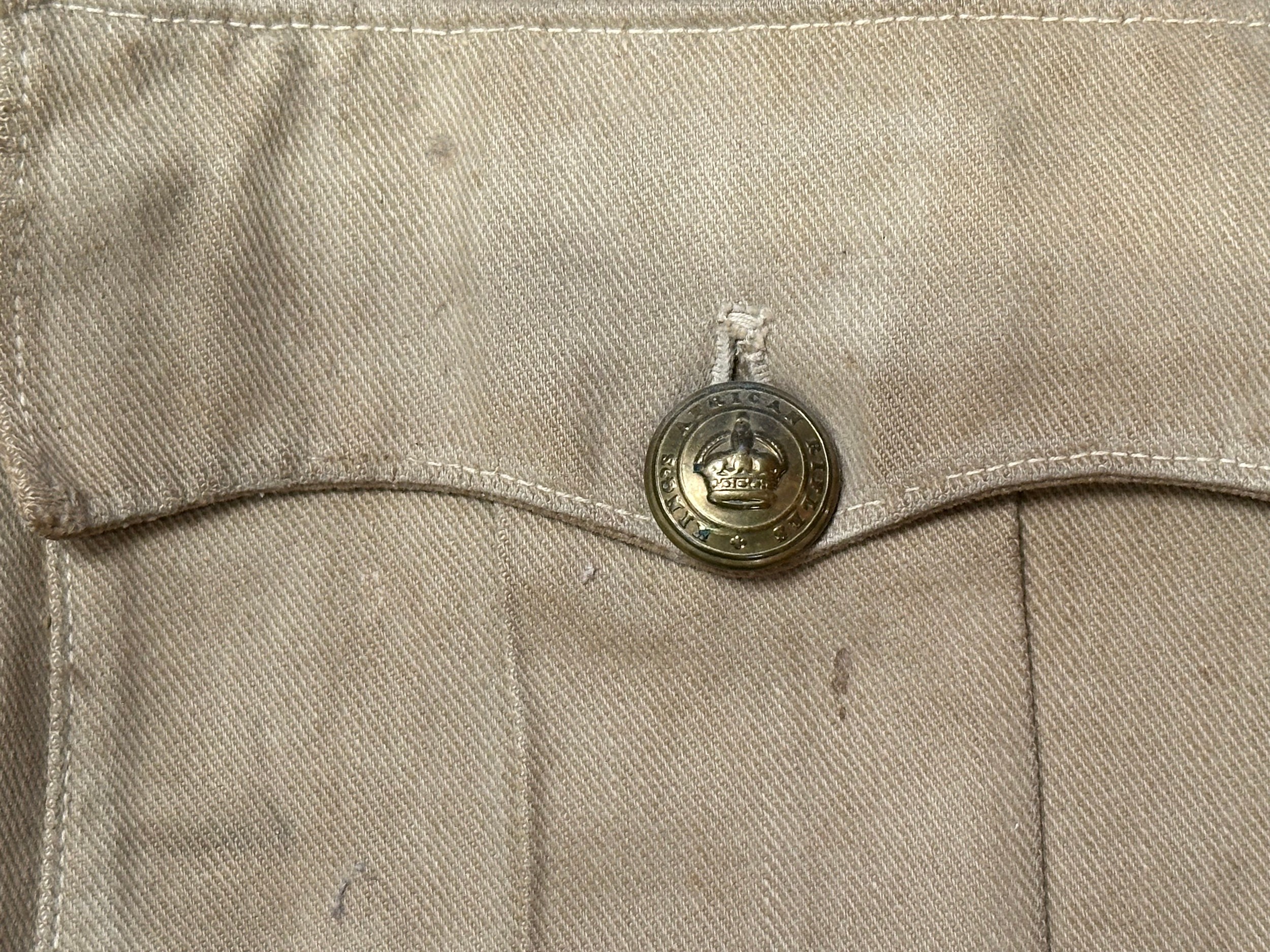 WW1 British Khaki Drill Tunic Sgt Kings African Rifles complete with original buttons, brass shoulder titles and Sgt's rank insignia to sleeve. Small size approx. 32 inch chest.
