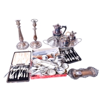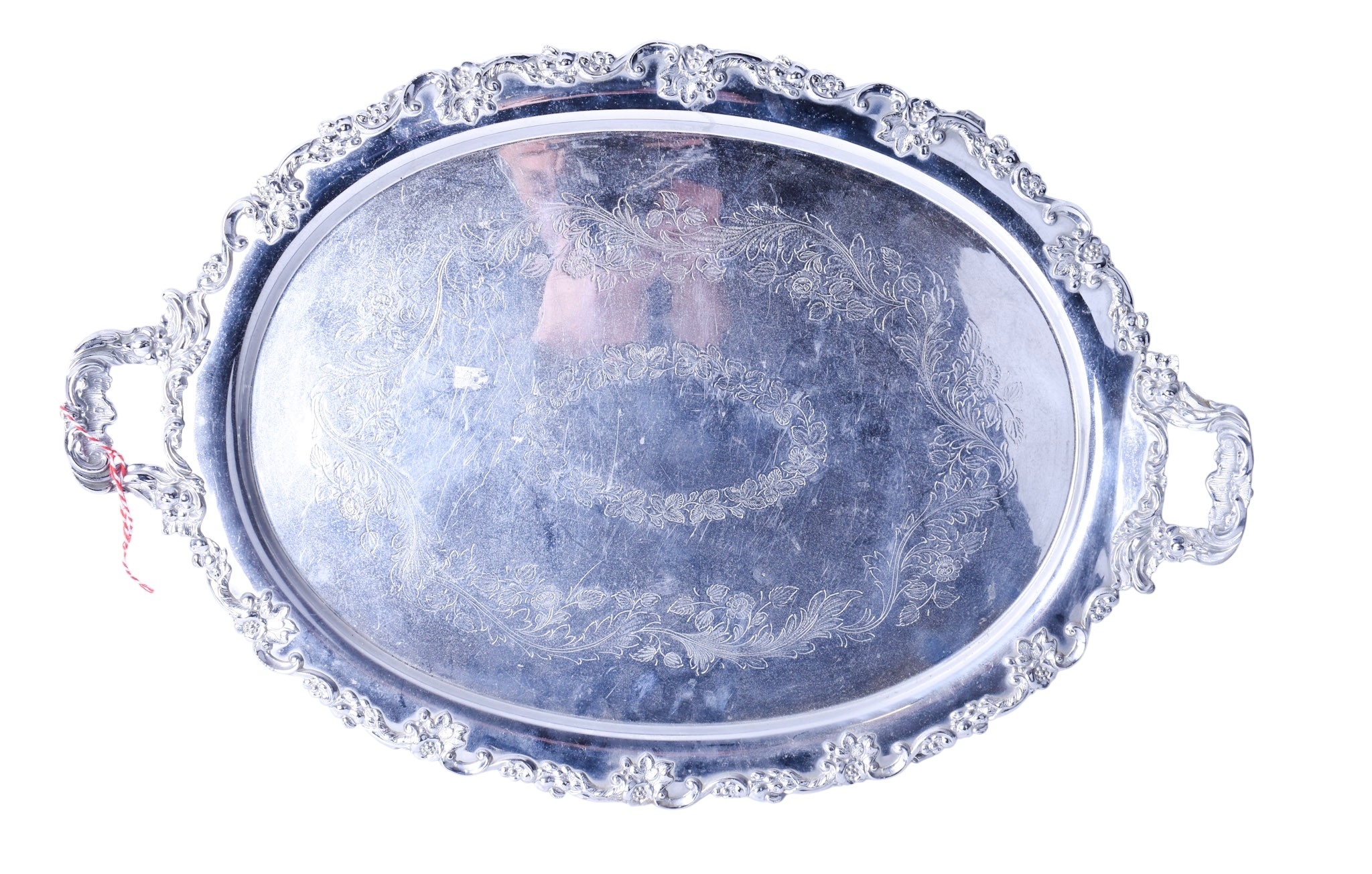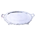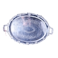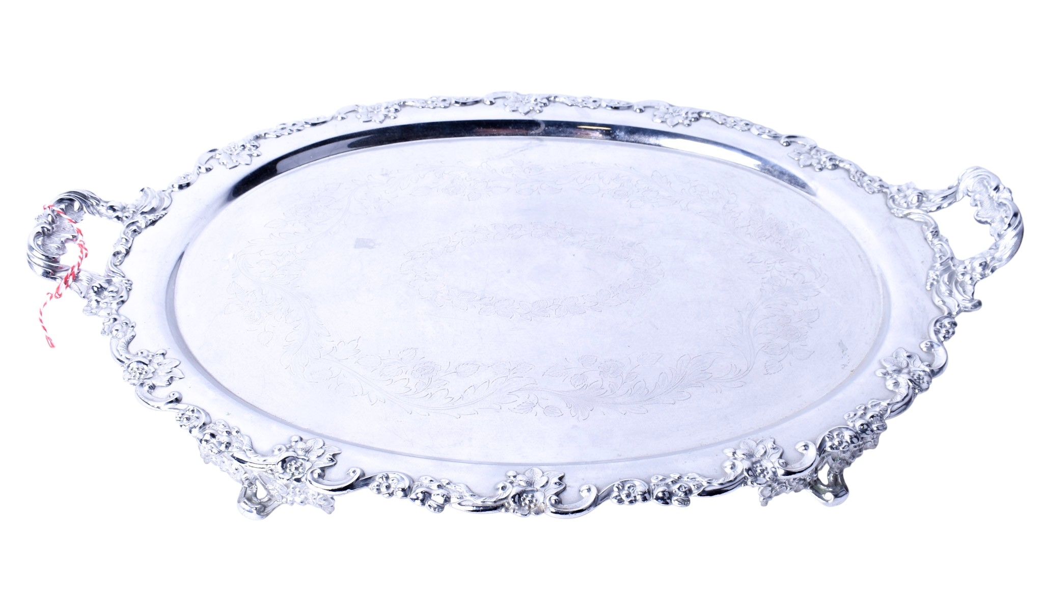 A silverplated twin-handled tray. Of oval form, with a moulded floral border and etched decoration, on four feet, L63.5cm.