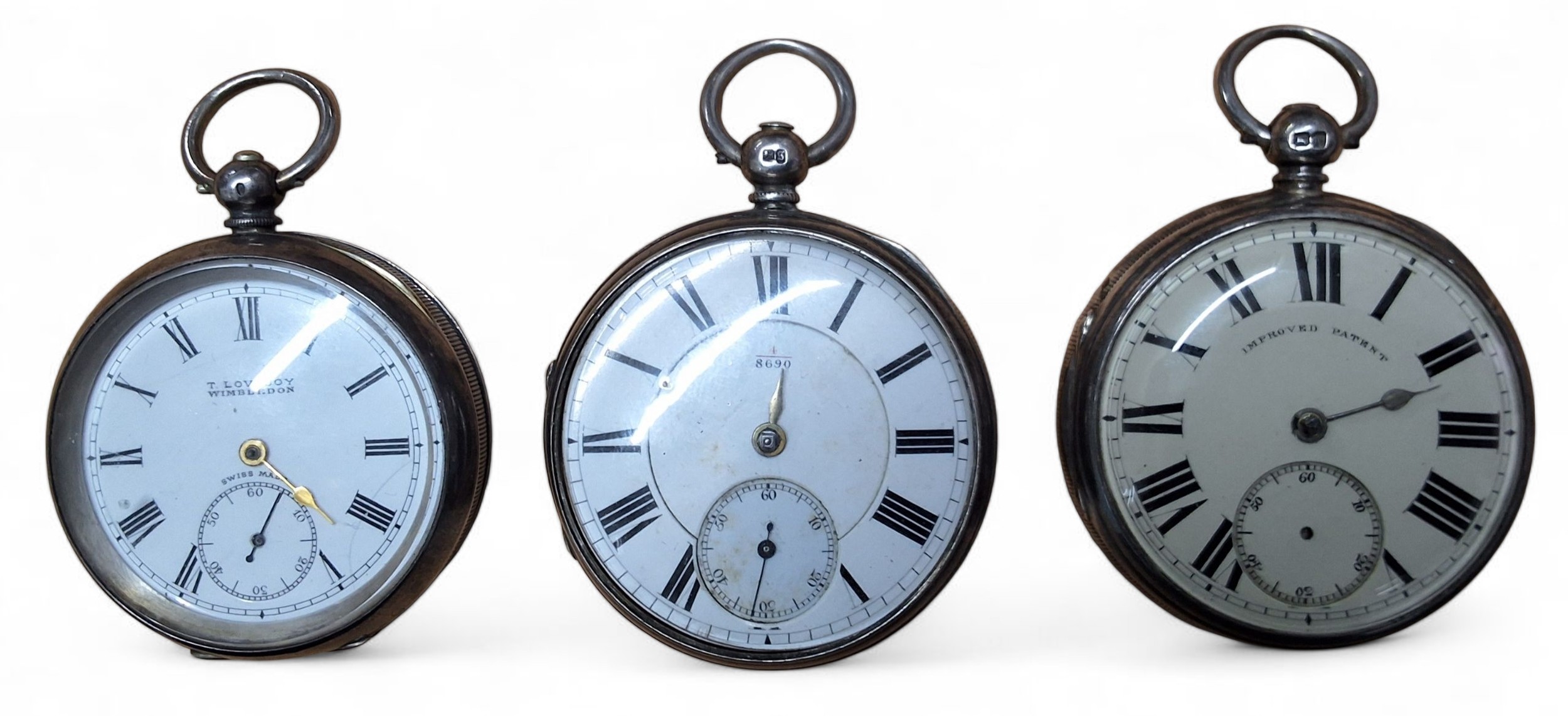 A Swiss 935 silver open face pocket watch, unsigned movement, white enamel dial, signed T Lovejoy Wimbledon, Roman numerals, outer minute track, subsidiary second dial, silver case Swiss three bear hall marks, stamped 0.935, w/o, (missing minute hand), 40mm, 110g gross; A Victorian silver open faced pocket watch, unsigned fusee movement, white enamel dial, marked 4 over 8690, Roman numerals, outer minute track, subsidiary second dial, silver case, John Fleckner, London, 1873, no. 8690, n/w (loose glass and movement), 129.3g gross; another n/w, Samuel Freeman, London, 1863 (af), n/w, 140g gross (3)