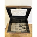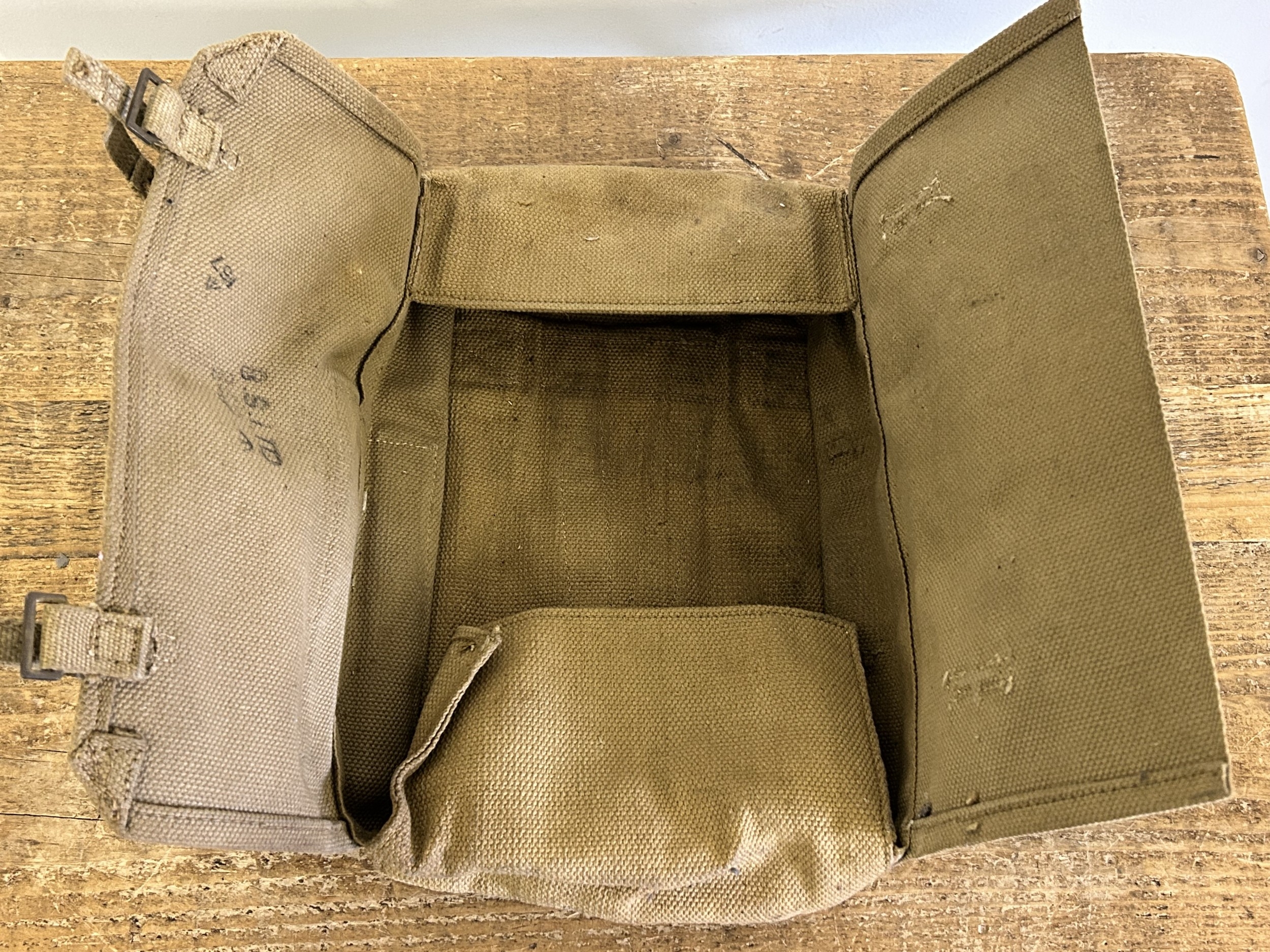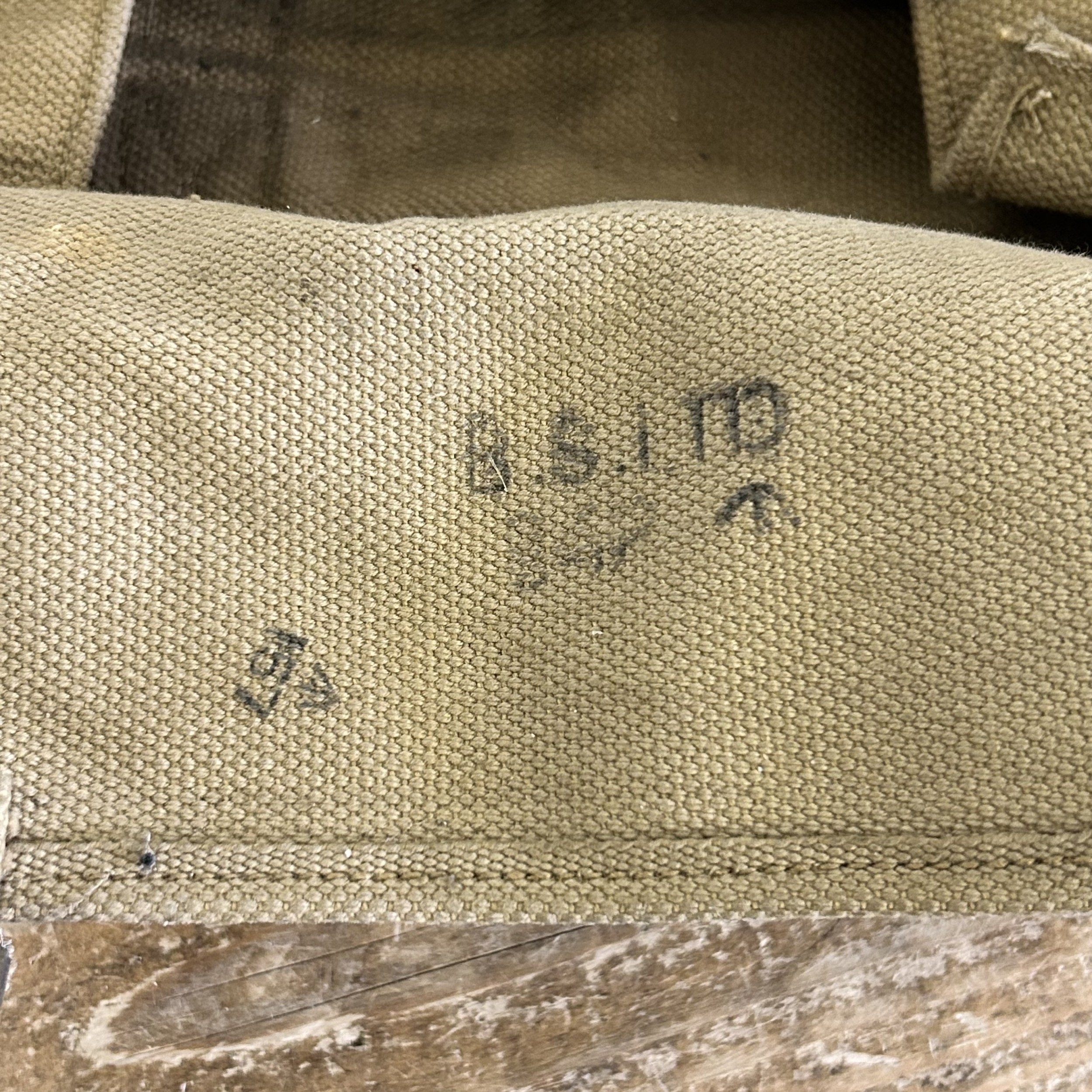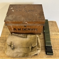 A vintage metal tin, the top stencilled with 'Capt A M Dennis', 14" wide together with a military marked pack etc