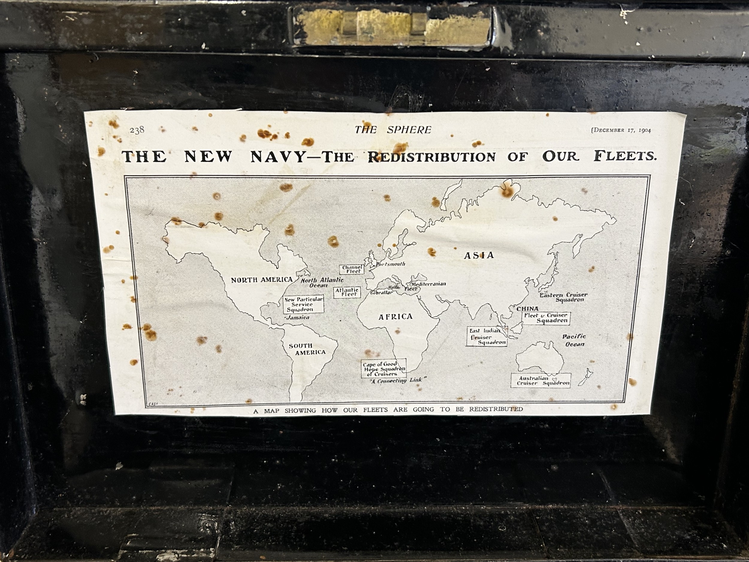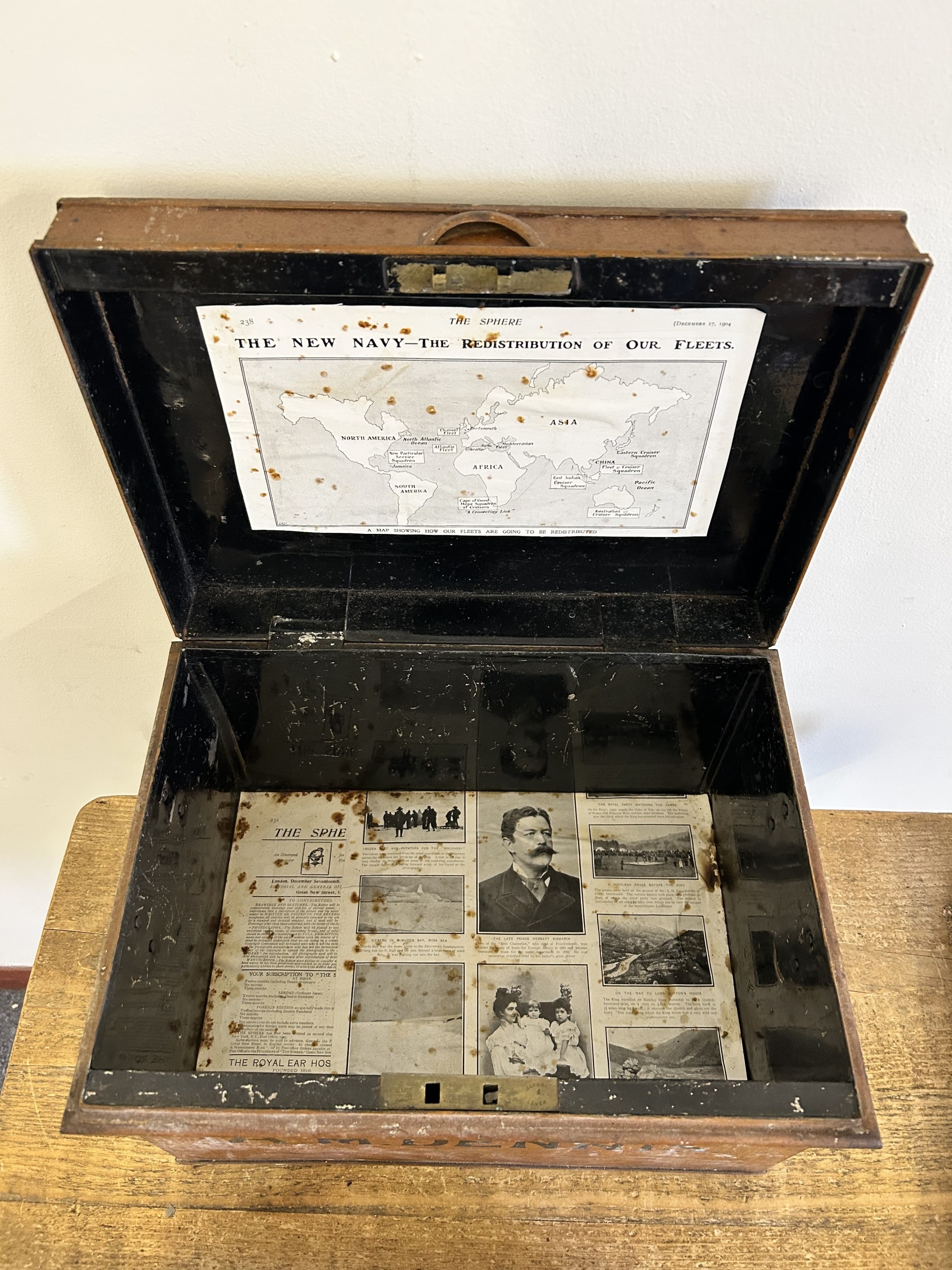 A vintage metal tin, the top stencilled with 'Capt A M Denni...