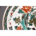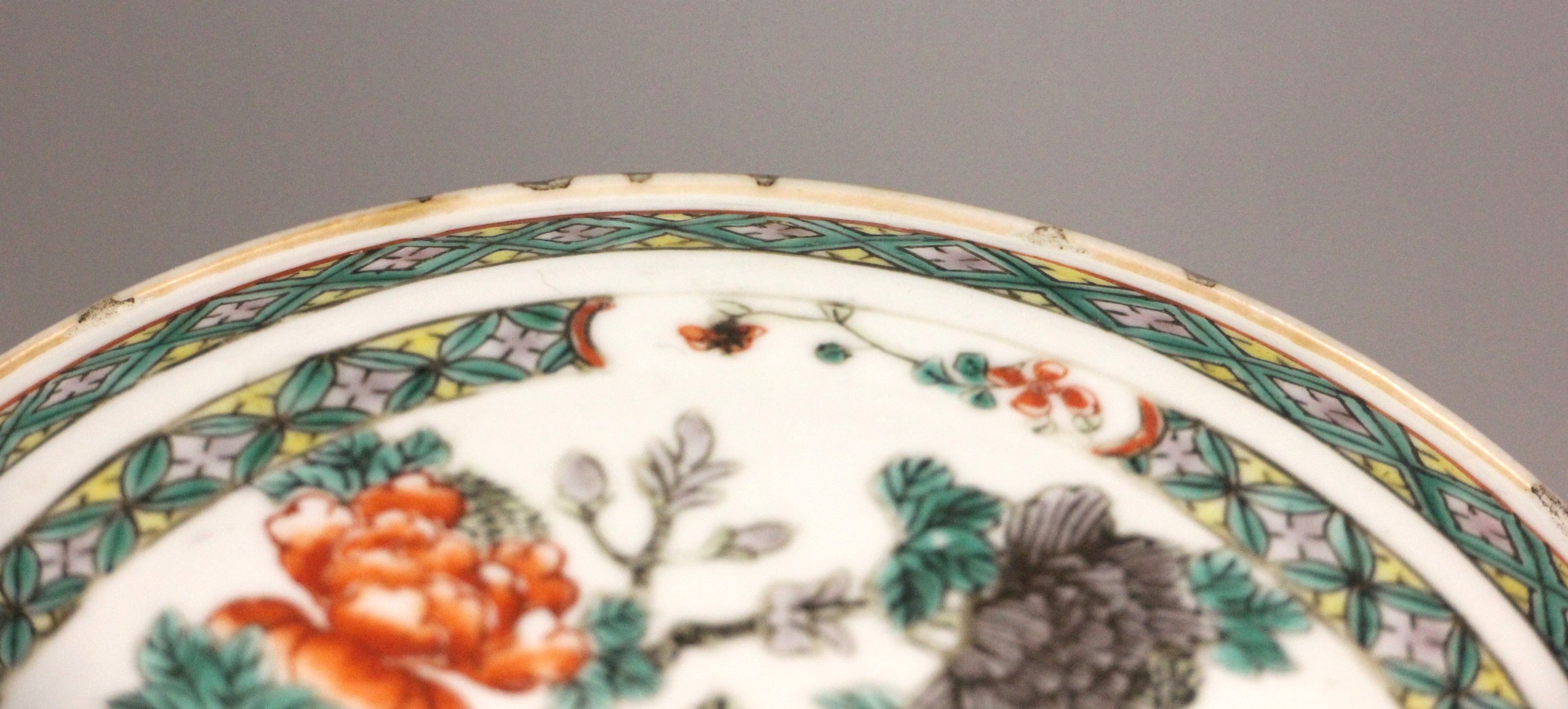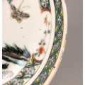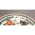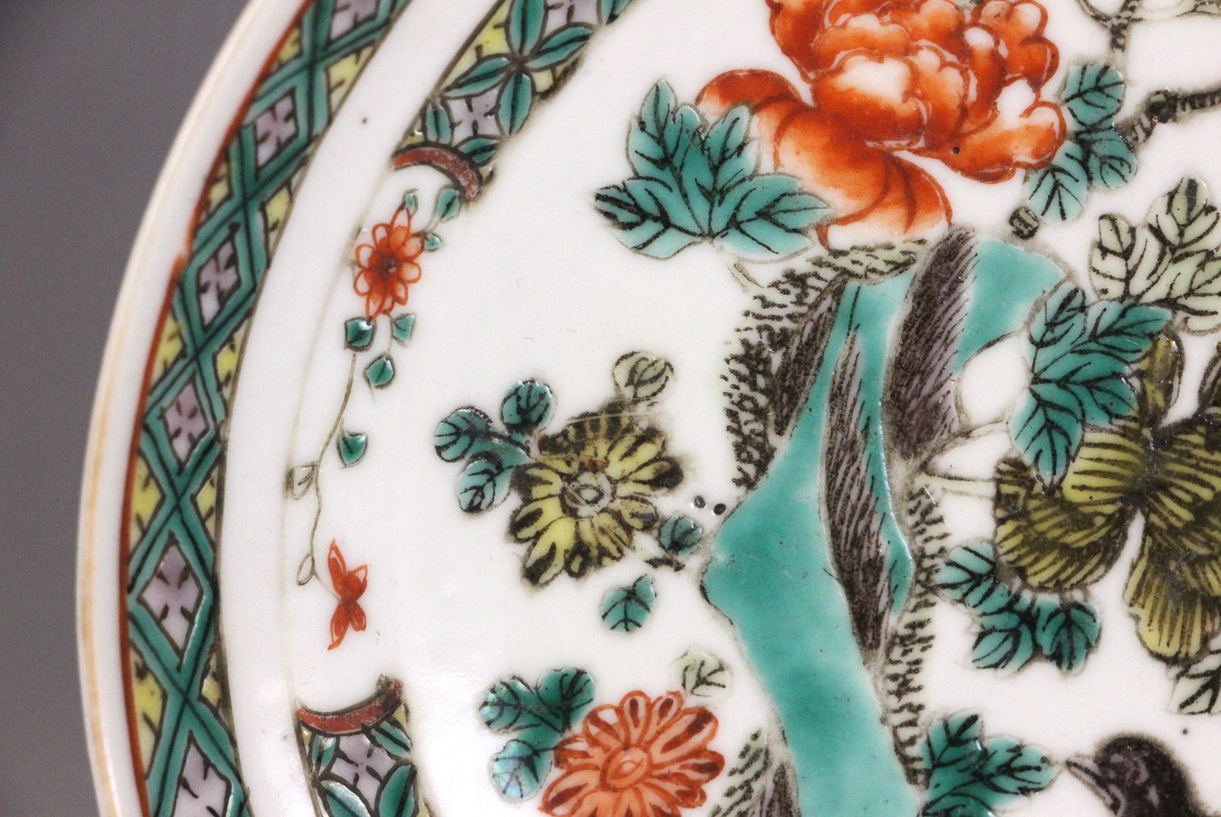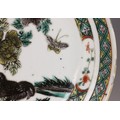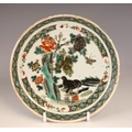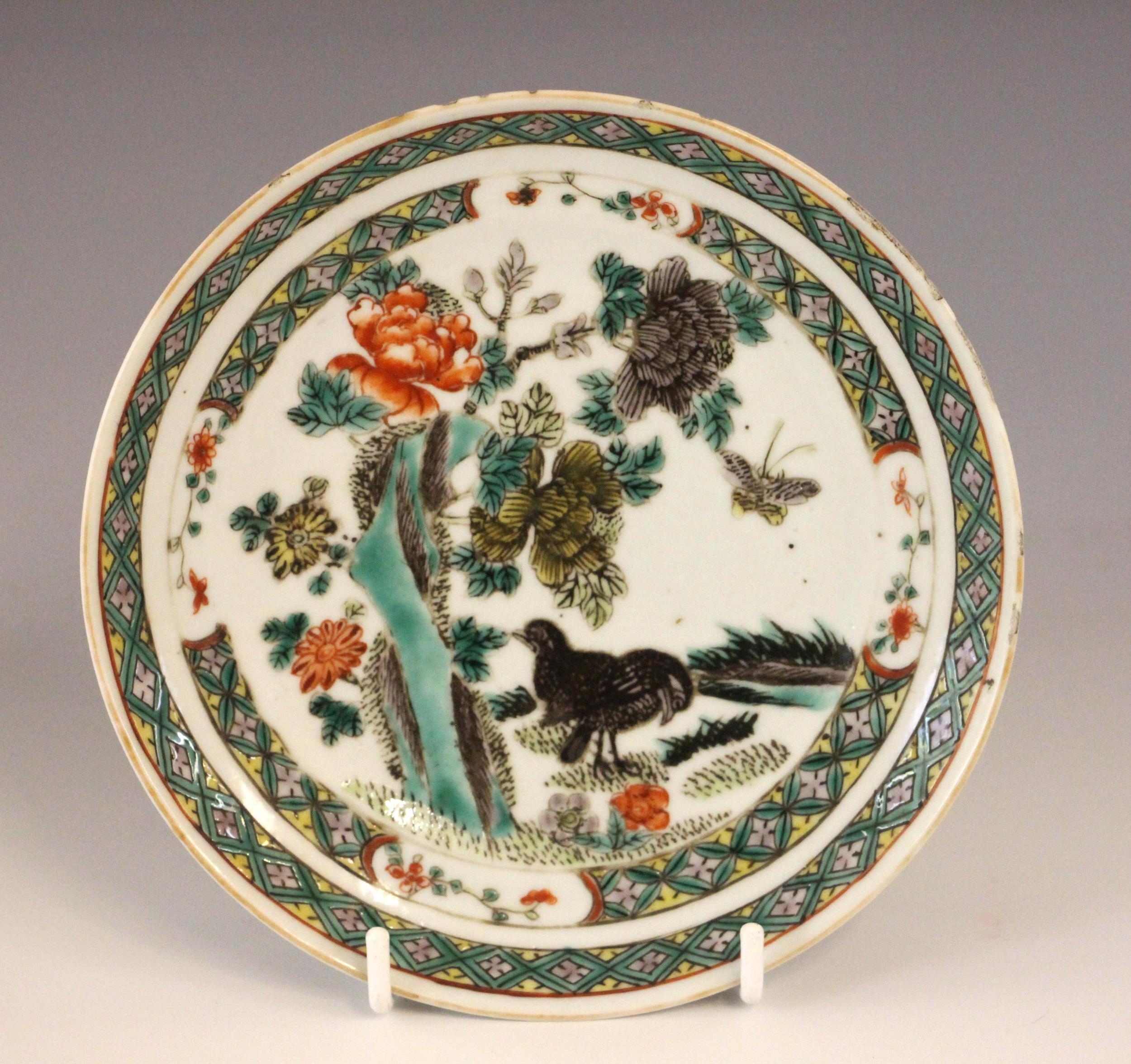 A Chinese porcelain famille verte saucer dish, 18th century, the small circular dish painted to the centre with two quail beside a rocky outcrop issuing chrysanthemum sprays, 15.2cm diameter